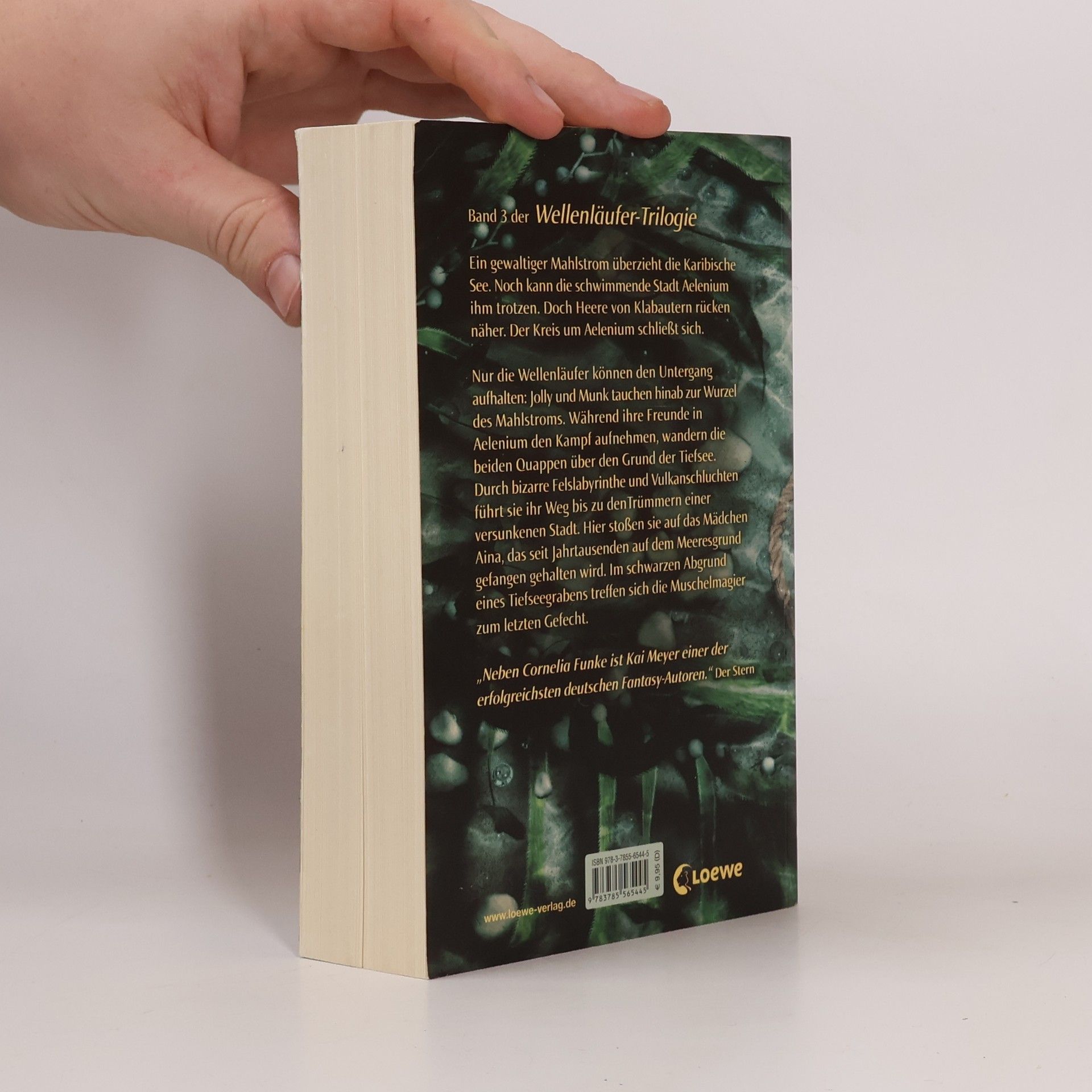 Ein gewaltiger Mahlstrom überzieht die Karibische See. Noch kann die schwimmende Stadt Aelenium ihm trotzen. Doch Heere von Klabautern rücken näher. Der Kreis um Aelenium schließt sich. Nur die Wellenläufer können den Untergang aufhalten: Jolly und Munk tauchen hinab zur Wurzel des Mahlstroms. Während ihre Freunde in Aelenium den Kampf aufnehmen, wandern die beiden Quappen über den Grund der Tiefsee. Durch bizarre Felslabyrinthe und Vulkanschluchten führt sie ihr Weg bis zu den Trümmern einer versunkenen Stadt. Hier stoßen sie auf das Mädchen Aina, das seit Jahrtausenden auf dem Meeresgrund gefangen gehalten wird. Im schwarzen Abgrund eines Tiefeseegrabens treffen sich die Muschelmagier zum letzten Gefecht. „Die Wasserweber“ ist der dritte Band einer Trilogie. Die beiden Vorgängertitel lauten „Die Wellenläufer“ und „Die Muschelmagier“.