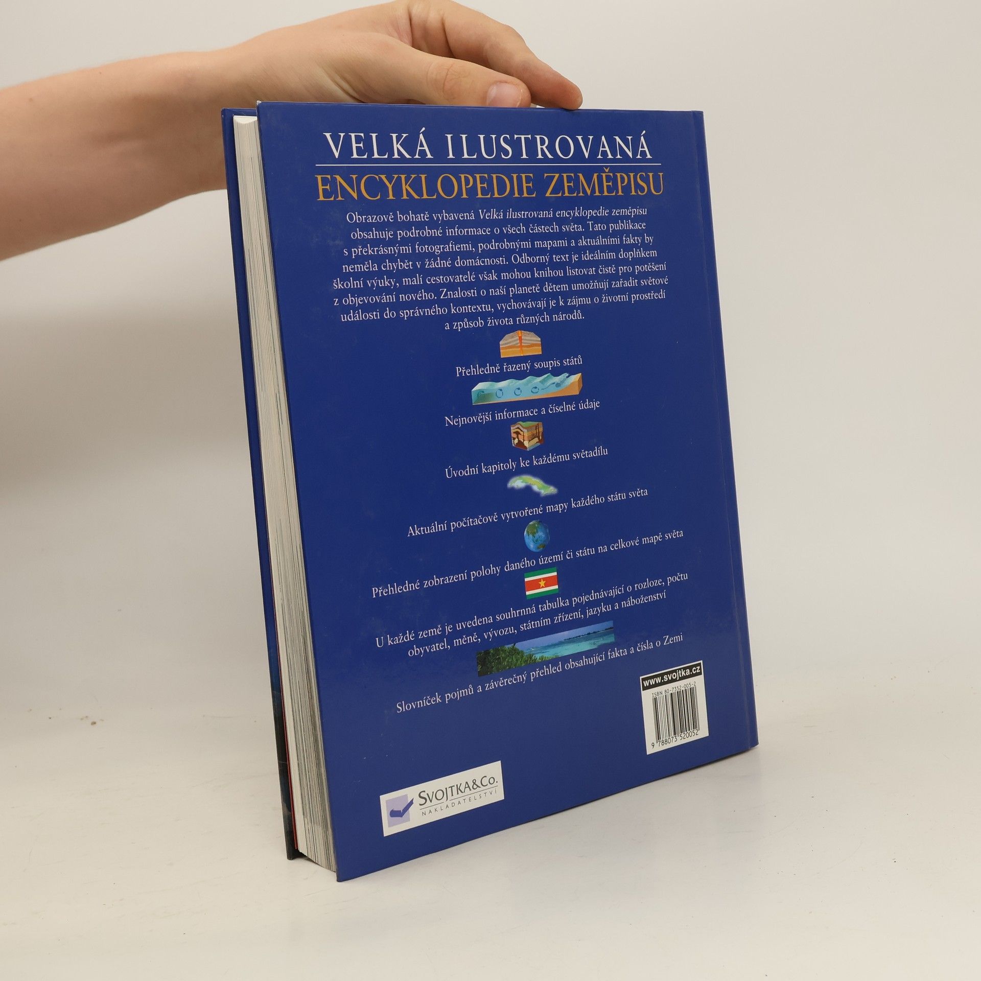 Tato publikace s překrásnými fotografiemi, podrobnými mapami a aktuálními fakty by neměla chybět v žádné domácnosti. Odborný text je ideálním doplňkem školní výuky, malí cestovatelé však mohou knihou listovat čistě pro potěšení z objevování nového. Znalosti o naší planetě dětem umožňují zařadit světové události do správného kontextu, vychovávají je k zájmu o životní prostředí a způsob života různých národů. Aktuální počítačově vytvořené mapy každého státu světa. Přehledné zobrazení polohy daného území či státu na celkové mapě světa. U každé země je uvedena souhrnná tabulka pojednávající o rozloze, počtu obyvatel, měně, vývozu, státním zřízení, jazyku a náboženství.