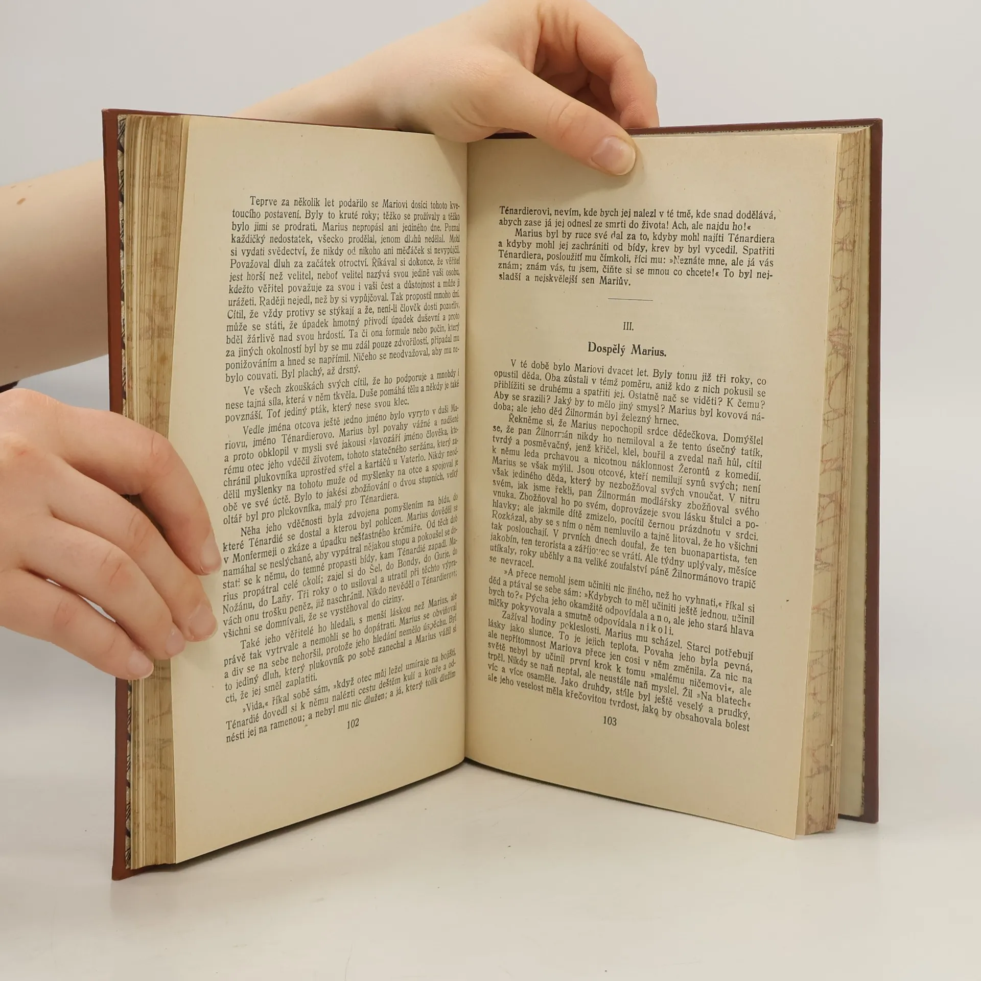 Bídníci III. (Marius). Tento román zachycuje život francouzského lidu v 1. třetině 19. století. Ústřední postavou je Jean Valjean. Je to bývalý galejník, který se na galeje dostal za krádež chleba. Když se mu podařilo uprchnout, okradl starého kněze, který mu nabídl nocleh. Když ho ale chytli četníci, kněz jim řekl, že stříbrné příbory Jeanu Valjeanovi dal darem, přidal mu ještě stříbrné svícny a tím ho zachránil od galejí. Tím Jeana ovlivnil a ten se poté stal dobrodincem a ochráncem těch nejbídnějších. Jeho protihráčem je policejní prefekt Javert, který ho pronásleduje. Zastává názor, že galejník zůstane galejníkem, a považuje dopadení Valjeana za své životní poslání. Ženskými hrdinkami románu jsou Fantine, mladá žena, kterou bída dohnala k prostituci a její dcera Cosette, které se ujal Jean Valjean a vychovává ji. Román vyznívá jako obžaloba tehdejší společnosti a mravů.