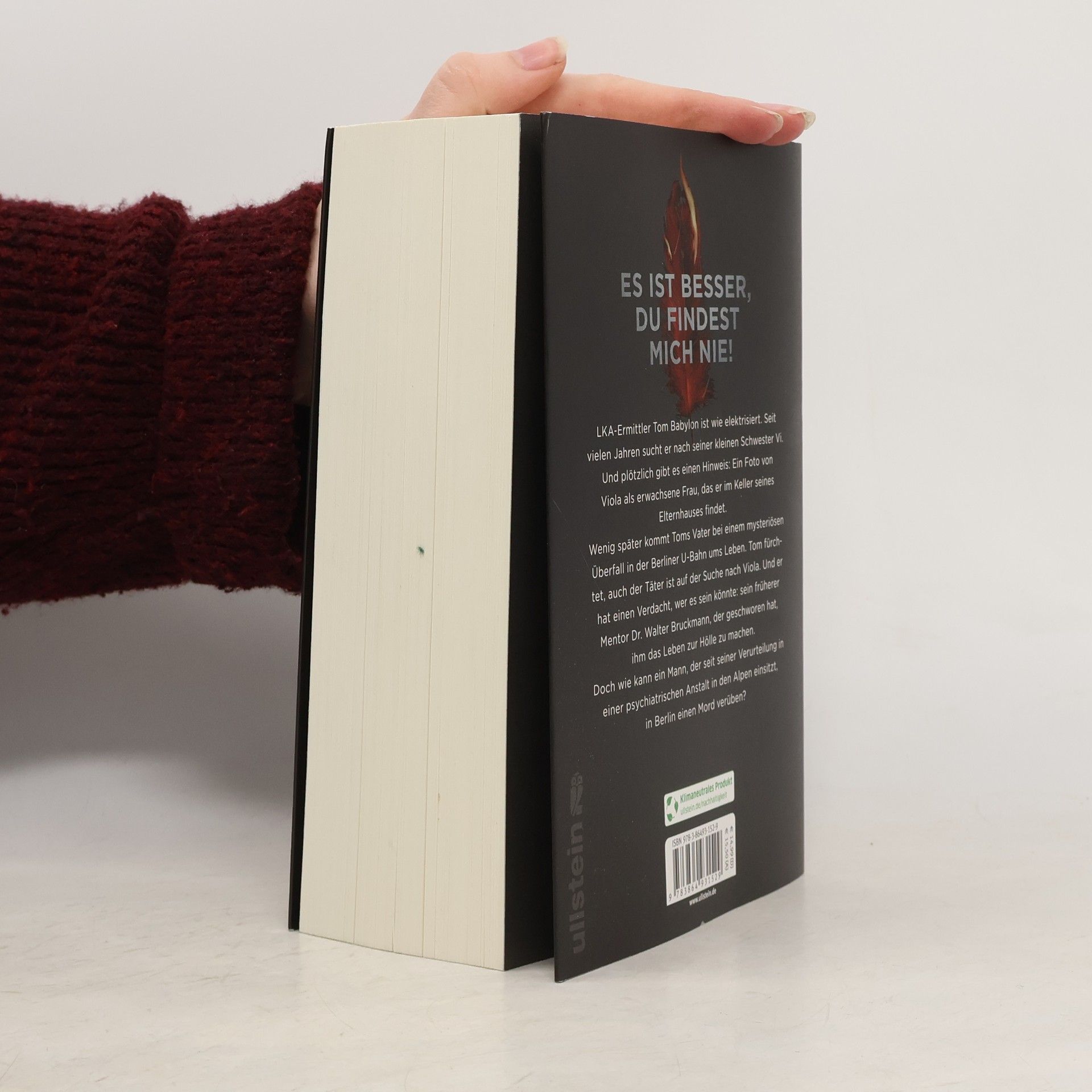 Es ist besser, du findest mich nieLKA-Ermittler Tom Babylon ist auf der Suche nach seiner kleinen Schwester „Vi“, die 1998 spurlos verschwand. Jetzt gibt es endlich einen Hinweis: Ein aktuelles Foto von Viola, versteckt im Keller seines Vaters. Bei einem mysteriösen Überfall in der Berliner U-Bahn wenig später kommt sein Vater ums Leben. Babylon ist sich sicher, auch der Täter ist auf der Suche nach Viola. Und er glaubt zu wissen, wer dahintersteckt: sein früherer Mentor Dr. Walter Bruckmann, der geschworen hat, ihm das Leben zur Hölle zu machen. Doch wie kann ein Mann, der seit seiner Verurteilung in einer Psychiatrischen Anstalt in den Alpen einsitzt, in Berlin einen Mord verüben?