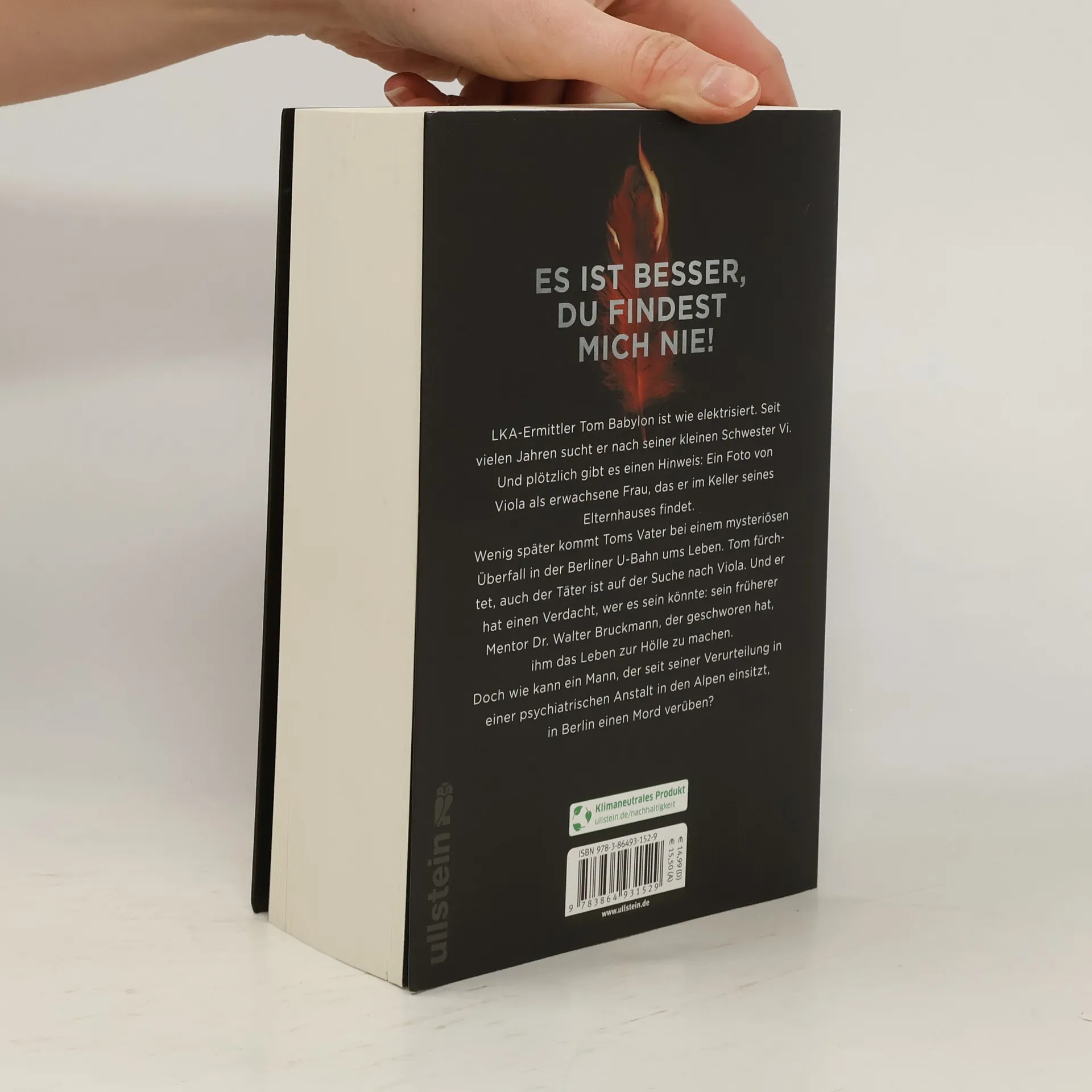Es ist besser, du findest mich nieLKA-Ermittler Tom Babylon ist auf der Suche nach seiner kleinen Schwester „Vi“, die 1998 spurlos verschwand. Jetzt gibt es endlich einen Hinweis: Ein aktuelles Foto von Viola, versteckt im Keller seines Vaters. Bei einem mysteriösen Überfall in der Berliner U-Bahn wenig später kommt sein Vater ums Leben. Babylon ist sich sicher, auch der Täter ist auf der Suche nach Viola. Und er glaubt zu wissen, wer dahintersteckt: sein früherer Mentor Dr. Walter Bruckmann, der geschworen hat, ihm das Leben zur Hölle zu machen. Doch wie kann ein Mann, der seit seiner Verurteilung in einer Psychiatrischen Anstalt in den Alpen einsitzt, in Berlin einen Mord verüben?