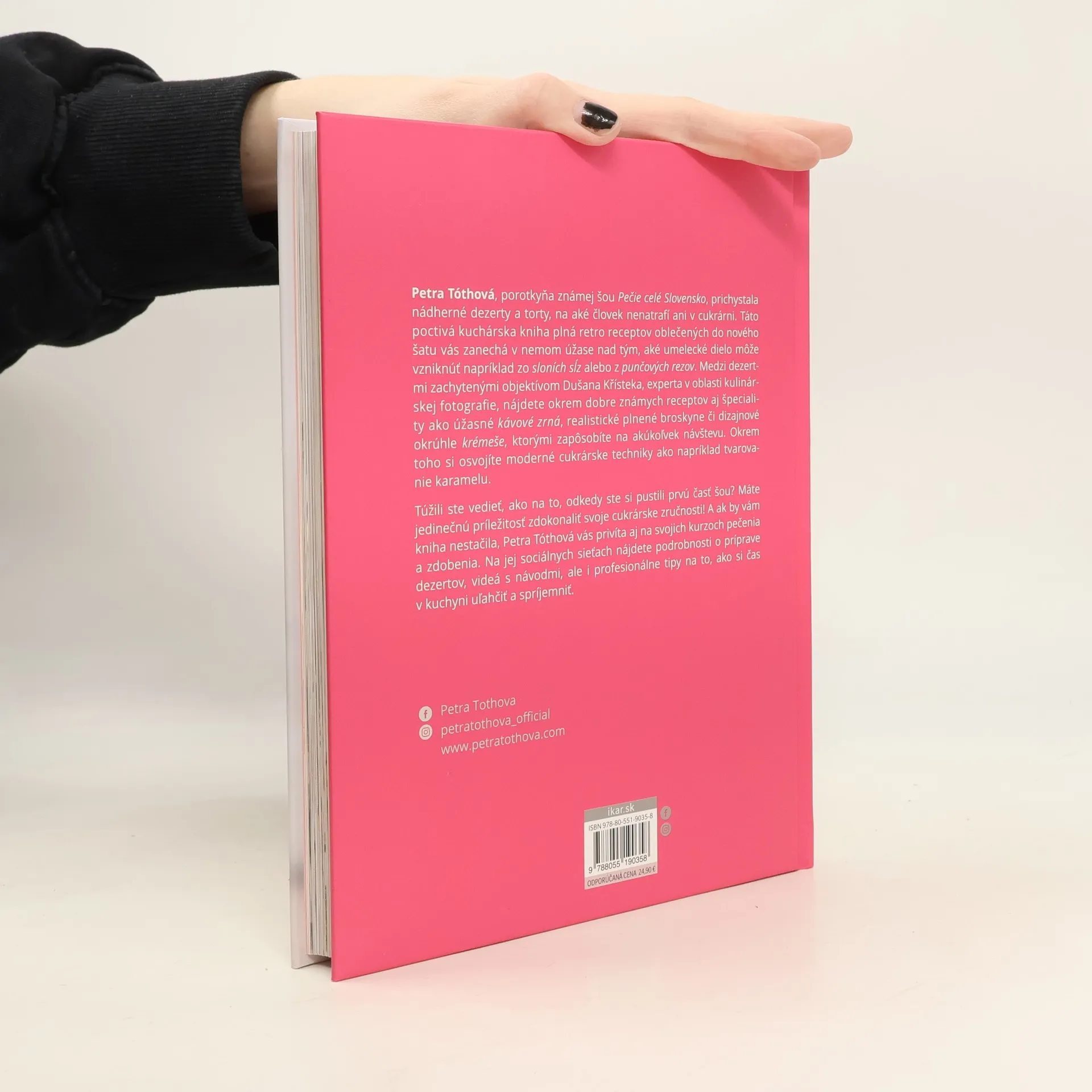 Pripravte si dezerty ako z francúzskych cukrární! Petra Tóthová, porotkyňa známej šou Pečie celé Slovensko, vás zaškolí do elegantného umenia cukrárstva. Jej kniha je plná nádherných zákuskov a tort, na aké človek len tak nenatrafí. Retro recepty oblečené do moderného šatu vás zanechajú v nemom úžase nad tým, aké umelecké dielo môže vzniknúť napríklad zo sloních sĺz alebo z punčových rezov. Medzi dezertmi zachytenými objektívom Dušana Křísteka, experta v oblasti kulinárskej fotografie, nájdete okrem dobre známych tradičných receptov aj cukrárske špeciality ako úžasné kávové zrná, realistické plnené broskyne či dizajnové okrúhle krémeše, ktorými zapôsobíte na akúkoľvek návštevu. Túžili ste vedieť ako pracovať s karamelom? Máte jedinečnú príležitosť zdokonaliť svoje cukrárske zručnosti! A ak by vám kniha nestačila, Petra Tóthová vás privíta aj na svojich kurzoch pečenia a zdobenia. Na jej sociálnych sieťach nájdete podrobnosti o príprave dezertov, videá s návodmi, ale i profesionálne tipy na to, ako si čas v kuchyni uľahčiť a spríjemniť.