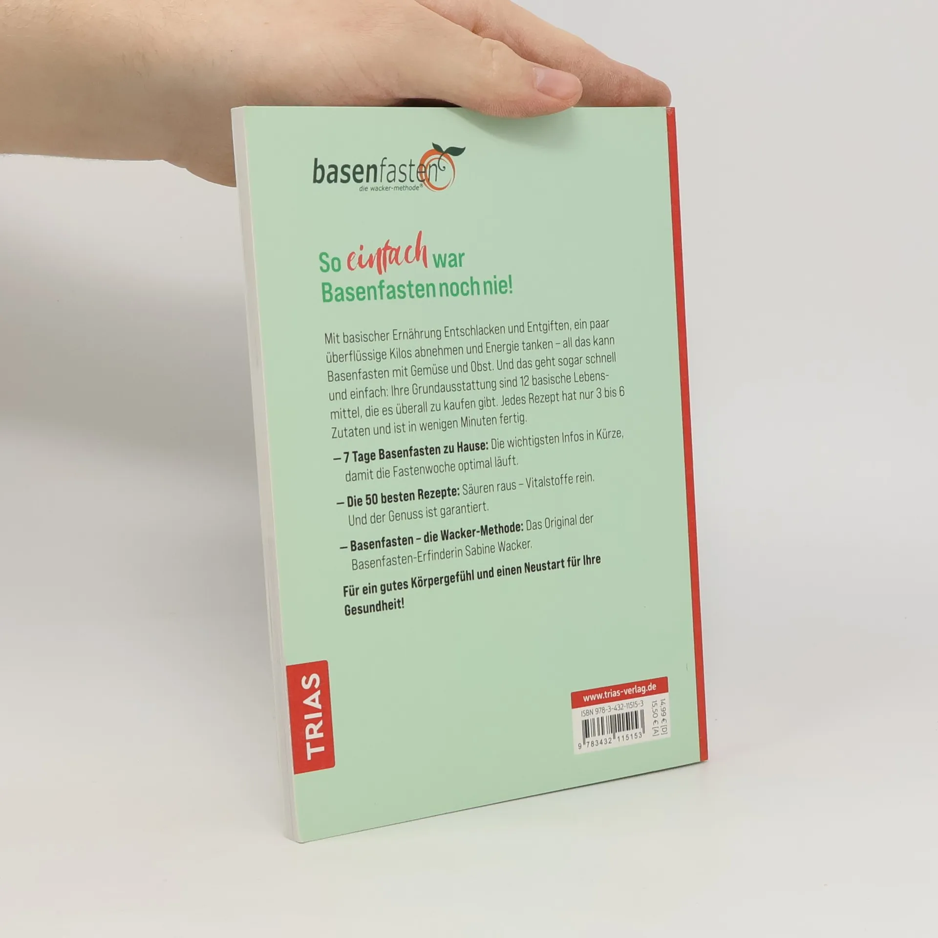 So einfach war Basenfasten noch nie! Mit basischer Ernährung Entschlacken und Entgiften, ein paar überflüssige Kilos abnehmen und Energie tanken – all das kann Basenfasten mit Gemüse und Obst. Und das geht sogar schnell und einfach: Ihre Grundausstattung sind 12 basische Lebensmittel, die es überall zu kaufen gibt. Jedes Rezept hat nur 3 bis 6 Zutaten und ist in wenigen Minuten fertig. 7 Tage Basenfasten zu Hause: Die wichtigsten Infos in Kürze, damit die Fastenwoche optimal läuft. Die 50 besten Rezepte: Säuren raus – Vitalstoffe rein. Und der Genuss ist garantiert. Basenfasten – die Wacker-Methode: Das Original der Basenfasten-Erfinderin Sabine Wacker. Für ein gutes Körpergefühl und einen Neustart für Ihre Gesundheit!