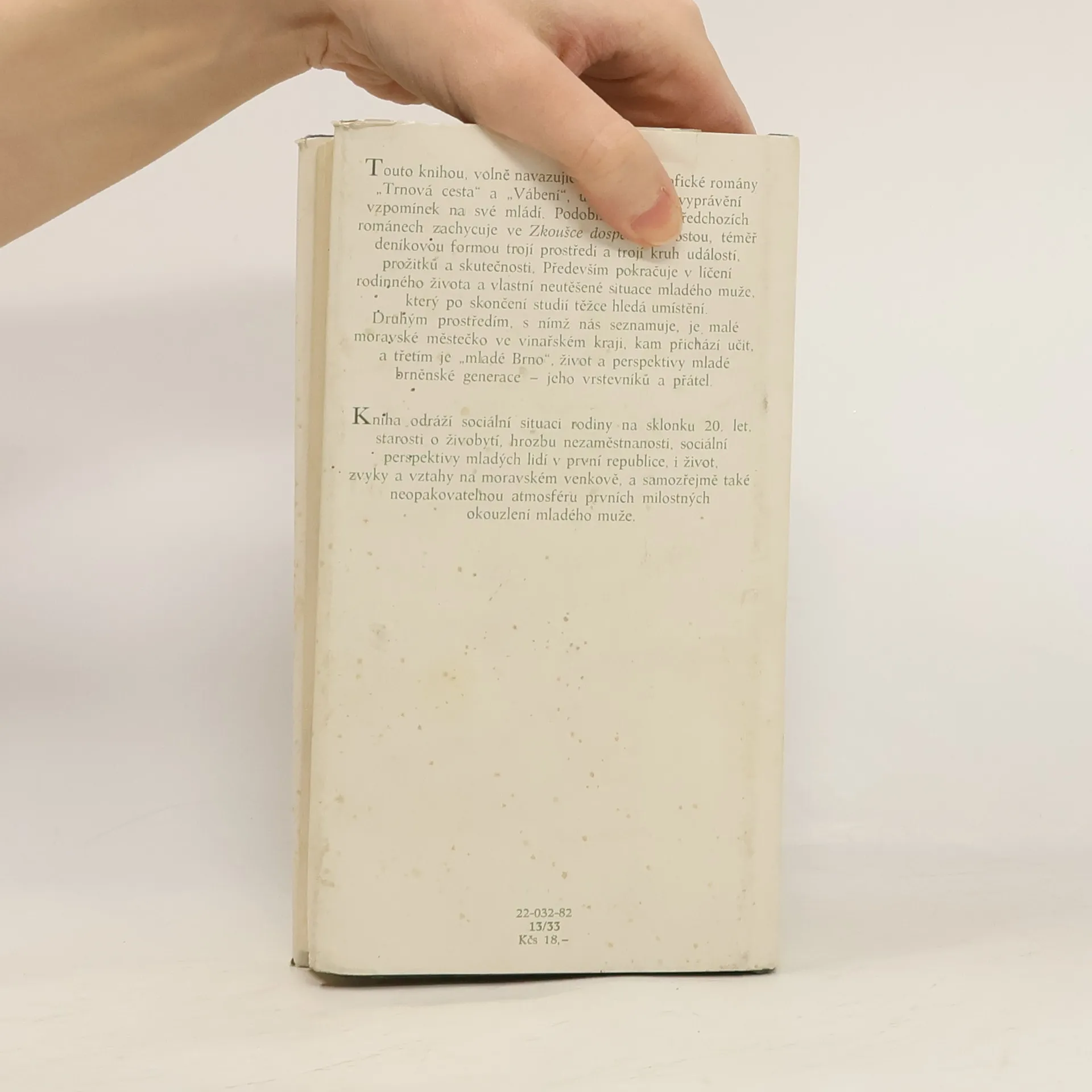 Autobiografický román, představující volné pokračování knih Trnová cesta a Vábení a vycházející k 75. narozeninám autora, se odehrává v moravském prostředí ve městě i na venkově za první republiky. Pokračuje v líčení rodinného života a vlastní situace v době, kdy po ukončení studií těžce hledal zaměstnání. Nové prostředí malého moravského městečka, kam hrdina nastoupil jako výpomocný učitel, mu umožňuje seznámit se s životem na venkvě i s úskalími svého povolání a prožít také první milostné vzplanutí. Kniha odráží atmosféru 20. let 20. stol.