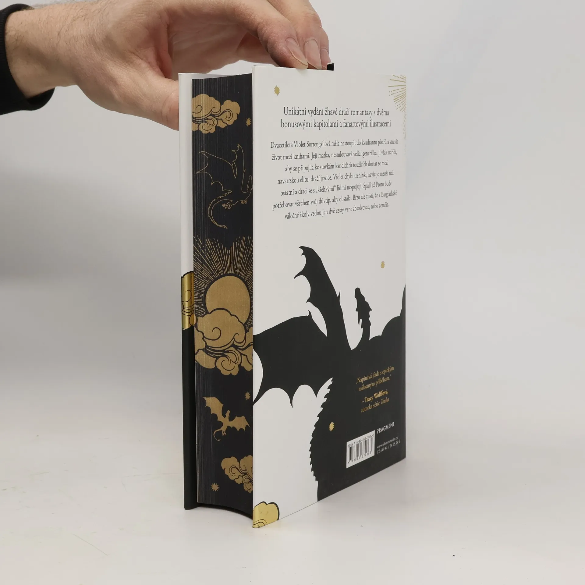 Unikátní vydání žhavé dračí romantasy s dvěma bonusovými kapitolami a fanartovými ilustracemi. Dvacetiletá Violet Sorrengailová měla nastoupit do kvadrantu písařů a strávit život mezi knihami. Její matka, nesmlouvavá velící generálka, jí však nařídí, aby se připojila ke stovkám kandidátů toužících dostat se mezi navarrskou elitu: dračí jezdce. Violet chybí trénink, navíc je menší než ostatní a draci se s „křehkými“ lidmi nespojují. Spálí je! Proto bude potřebovat všechen svůj důvtip, aby obstála. Brzo ale zjistí, že z Basgiathské válečné školy vedou jen dvě cesty ven: absolvovat, nebo zemřít.