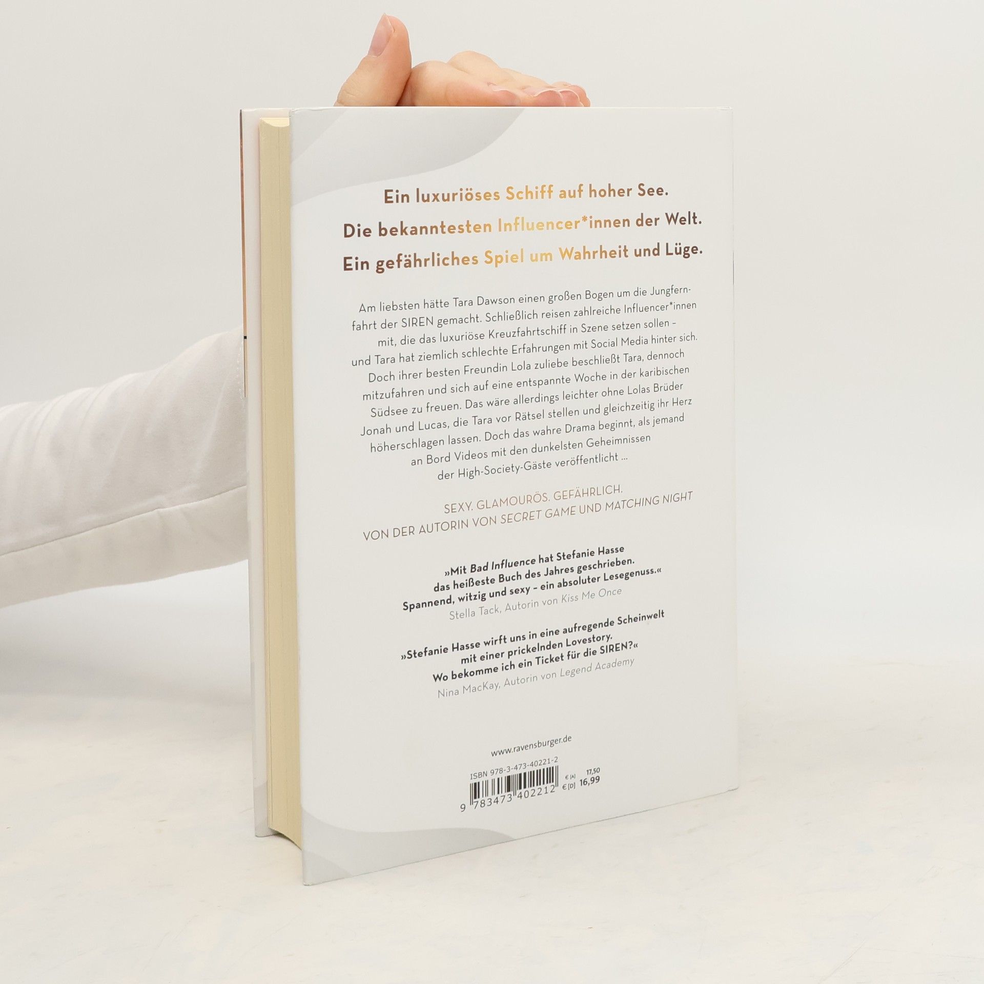 Ein luxuriöses Schiff auf hoher See. Die bekanntesten Influencer*innen der Welt. Ein gefährliches Spiel um Wahrheit und Lüge. Am liebsten hätte Tara einen großen Bogen um die Jungfernfahrt der SIREN gemacht. Schließlich reisen zahlreiche Influencer*innen mit, die das Kreuzfahrtschiff in Szene setzen sollen. Ihrer Freundin Lola zuliebe beschließt Tara, dennoch mitzufahren und sich darauf zu freuen. Das wäre allerdings leichter ohne Jonah und Lucas, die Tara vor Rätsel stellen und gleichzeitig ihr Herz höherschlagen lassen. Doch das wahre Drama beginnt, als jemand die Geheimnisse der High-Society-Gäste veröffentlicht … Sexy. Glamourös. Gefährlich. Romantic Suspense auf der „Titanic 2.0“ „Mit ‚Bad Influence‘ hat Stefanie Hasse das heißeste Buch des Jahres geschrieben. Spannend, witzig und sexy – ein absoluter Lesegenuss.“ (Stella Tack, Autorin von „Kiss Me Once“) „Stefanie Hasse wirft uns in eine aufregende Scheinwelt mit einer prickelnden Lovestory. Wo bekomme ich ein Ticket für die SIREN?“ (Nina MacKay, Autorin von „Legend Academy“) Mehr von Stefanie Hasse: Matching Night, Band 1: Küsst du den Feind? Matching Night, Band 2: Liebst du den Verräter? Secret Game. Brichst du die Regeln, brech ich dein Herz. Pretty Dead. Wenn zwei sich lieben, stirbt die Dritte. December Dreams. Ein Adventskalender.