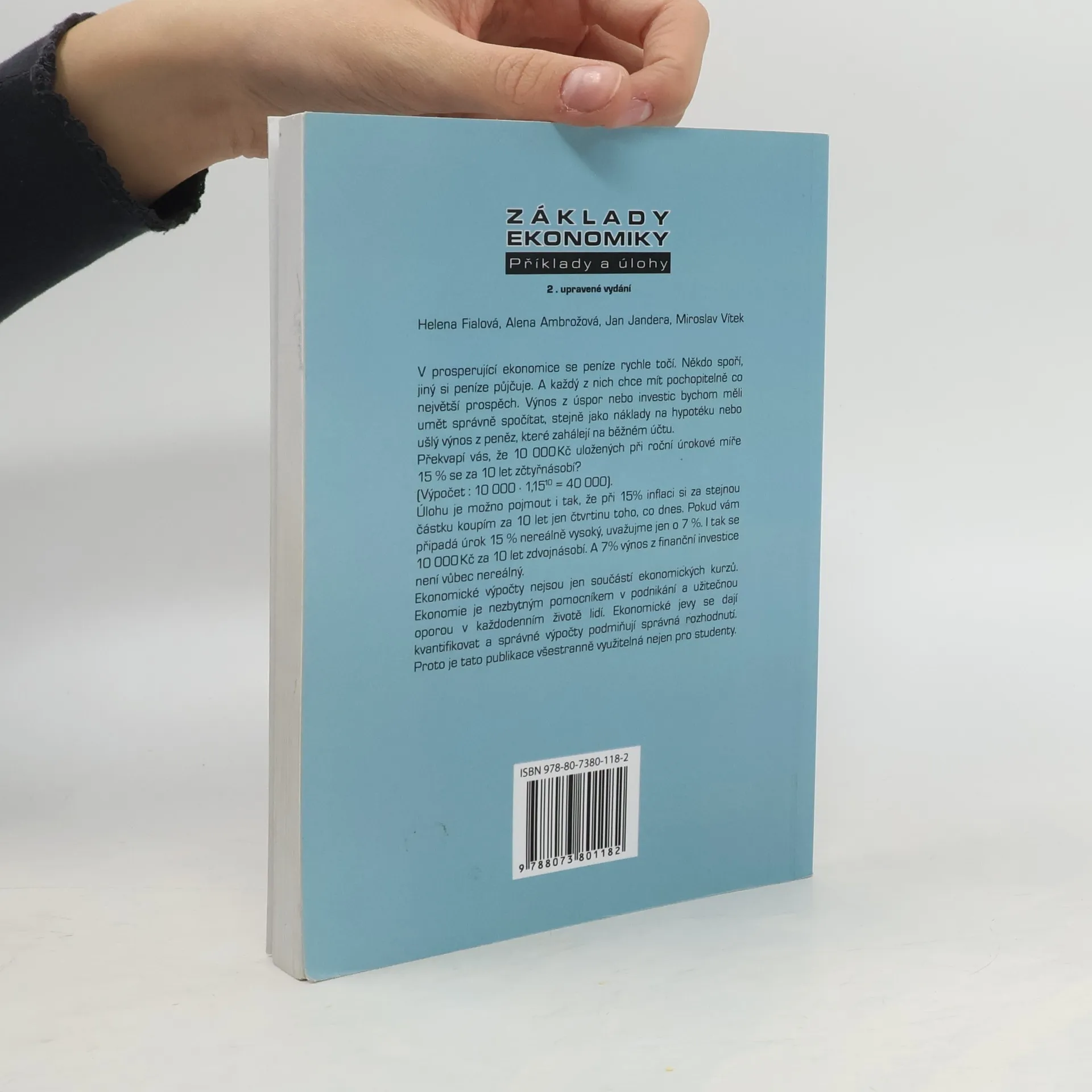 V prosperující ekonomice se peníze rychle točí. Někdo spoří a jiný si peníze vypůjčuje. Každý chce mít pochopitelně co největší prospěch. Výnos z úspor nebo investic bychom měli umět správně spočítat, stejně jako náklady na hypotéku nebo ušlý výnos z peněz, které zahálejí na běžném účtu. Překvapí vás, že 10 000 Kč uložených při roční úrokové míře 15% se za 10 let zčtyřnásobí? (Výpočet : 10 000 . 1,1510 = 40 000). Úlohu je možno pojmout také tak, že při 15% inflaci si za stejnou částku koupím za 10 let jen čtvrtinu toho, co dnes. Pokud vám připadá úrok 15% nereálně vysoký, uvažujme jen 7%. I tak se 10 000 Kč za 10 let zdvojnásobí. A 7%ní výnos z finanční investice není vůbec nereálný. Ekonomické výpočty nejsou jen součástí ekonomických kurzů. Ekonomie je nezbytným pomocníkem v podnikání a užitečnou oporou v každodenním životě lidí. Ekonomické jevy se dají kvantifikovat a správné výpočty podmiňují správná rozhodnutí. Tato publikace je všestranně využitelná nejen pro studenty.