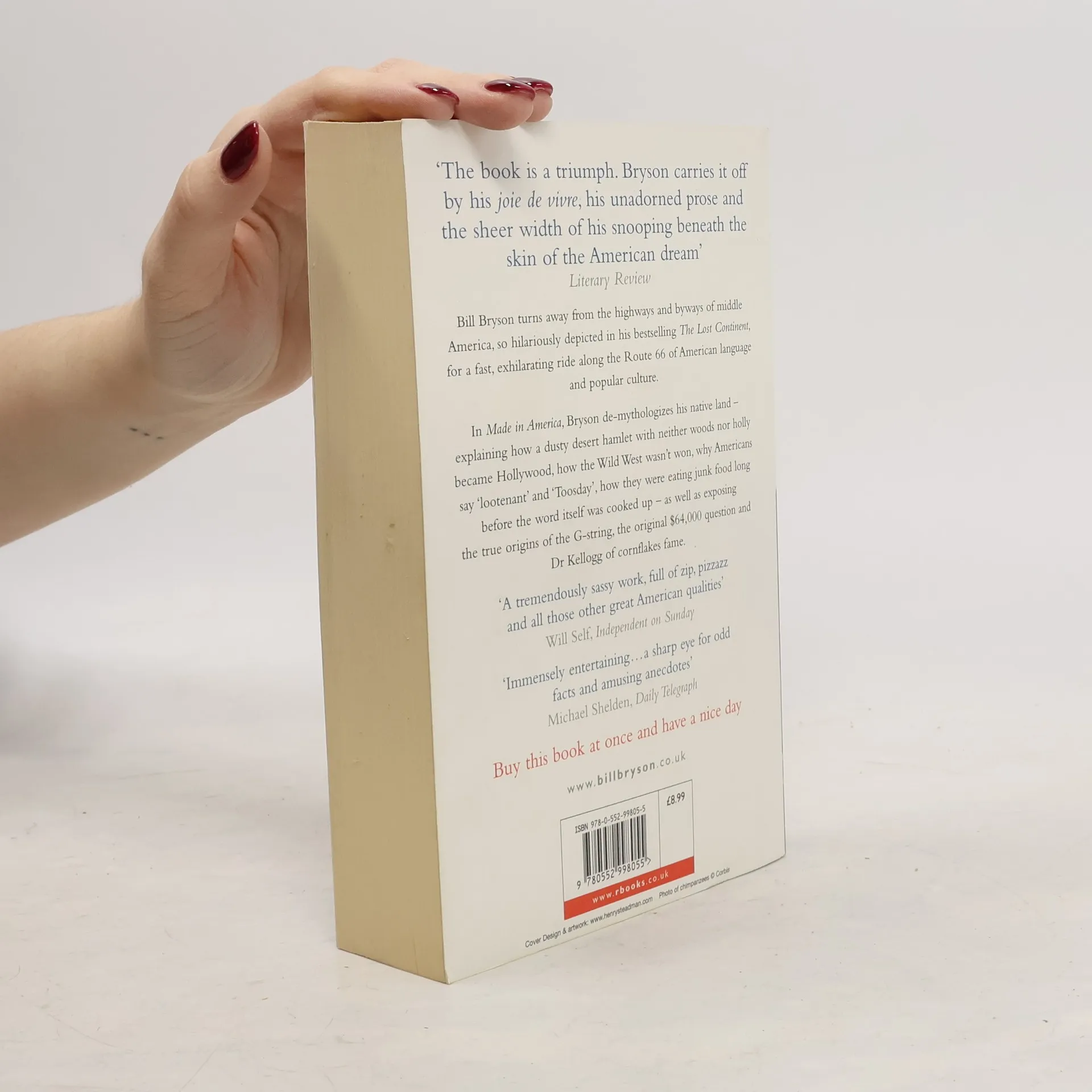 Bill Bryson turns away from the highways and byways of middle America, so hilariously depicted in his bestselling The Lost Continent, for a fast, exhilarating ride along the Route 66 of American language and popular culture. In Made in America, Bryson de-mythologizes his native land - explaining how a dusty desert hamlet with neither woods nor holly became Hollywood, how the Wild West wasn't won, why Americans say 'lootenant' and 'Toosday', how Americans were eating junk food long before the word itself was cooked up - as well as exposing the true origins of the G-string, the original $64,000 question and Dr Kellogg of cornflakes fame. Buy this book at once and have a nice day!