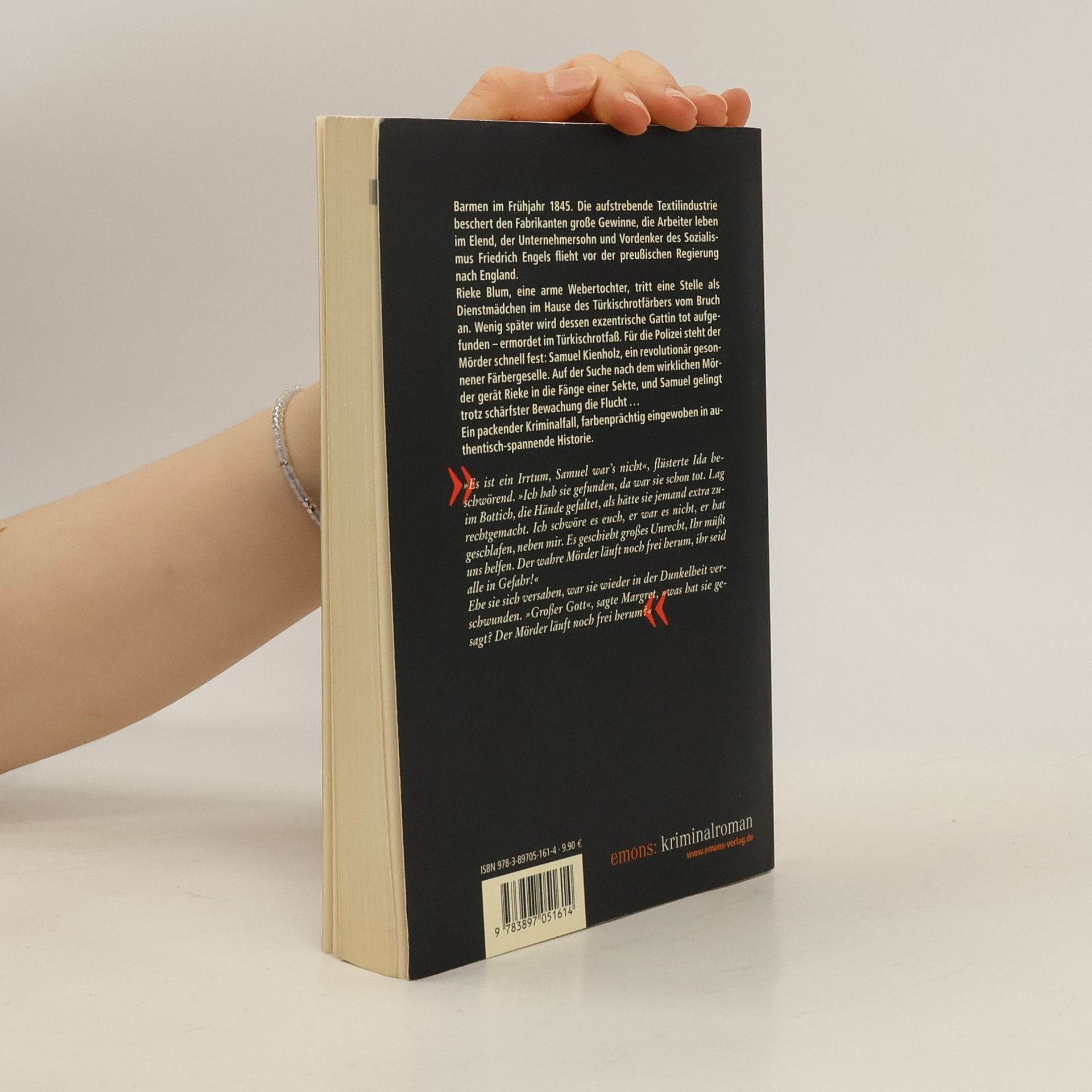Barmen im Frühjahr 1845. Die aufstrebende Textilindustrie beschert den Fabrikanten große Gewinne, die Arbeiter leben im Elend, der Unternehmersohn und Vordenker des Sozialismus Friedrich Engels flieht vor der preußischen Regierung nach England. Rieke Blum, eine arme Weberstochter, tritt eine Stelle als Dienstmädchen im Hause des Türkischrotfärbers vom Bruch und seiner exzentrischen Ehefrau an. Wenig später wird dessen exentrische Gattin tot aufgefunden - ermordet im Türkischrotfaß. Für die Polizei steht der Mörder schnell fest: Samuel Kienholz, ein revolutionär gesonnener Färbergeselle. Auf der Suche nach dem wirklichen Mörder gerät Rieke in die Fänge einer Sekte, und Samuel gelingt trotz schäfster Bewachung die Flucht. Ein packender Kriminalfall, farbenprächtig eingewoben in authentisch-spannende Historie.