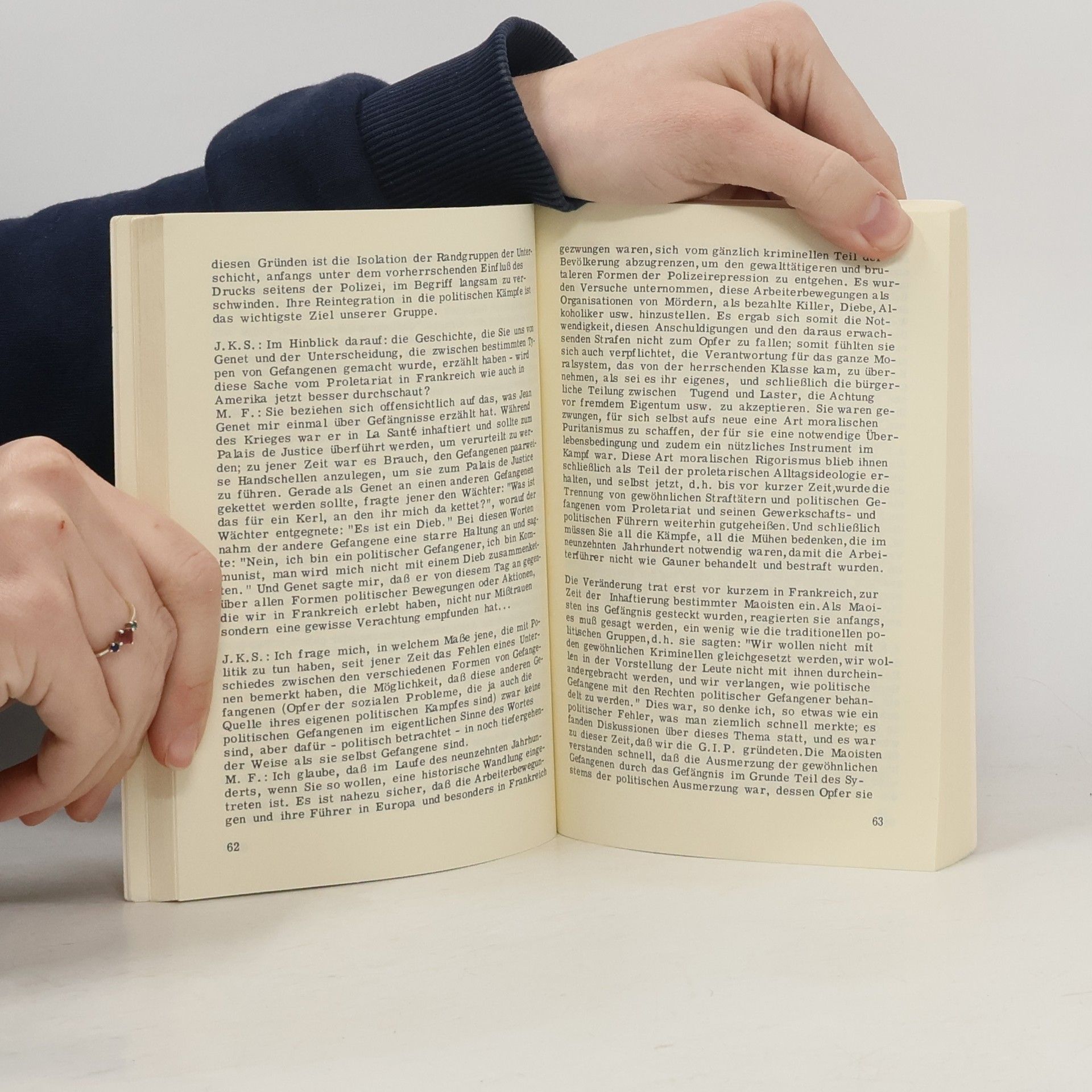 „Wenn die Gespräche Foucaults integraler Bestandteil seines Werkes sind, so deshalb, weil sie die historische Problemstellung jedes seiner Bücher auf die Konstruktion des aktuellen Problems (Wahnsinn, Bestrafung oder Sexualität) hin verlängern.“
