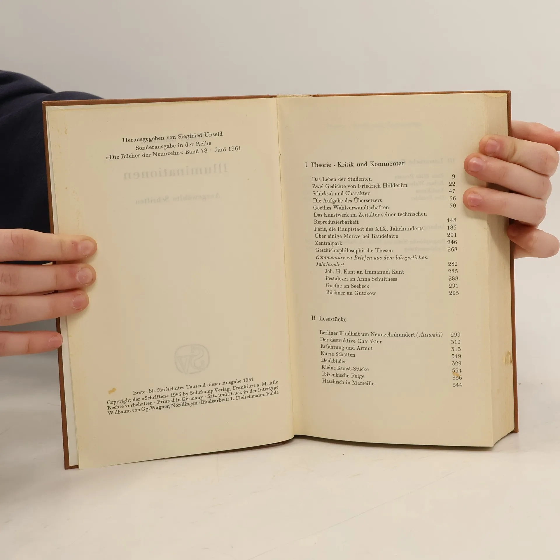 Das Leben der Studenten. Zwei Gedichte von Friedrich Hölderlin. Schicksal und Charakter. Die Aufgabe des Übersetzers. Goethes Wahlverwandtschaften. Das Kunstwerk im Zeitalter seiner technischen Reproduzierbarkeit. Paris, die Hauptstadt des XIX. Jahrhunderts. Über einige Motive bei Baudelaire. Zentralpark. Über den Begriff der Geschichte. Theologisch-politisches Fragment. Kommentare zu Briefen aus dem bürgerlichen Jahrhundert. Auswahl aus der Berliner Kindheit um Neunzehnhundert. Der destruktive Charakter. Erfahrung und Armut. Kurze Schatten. Schönes Entsetzen. Denkbilder. Kleine Kunst-Stücke. Ibizenkische Folge. Haschisch in Marseille. Zum Bilde Prousts. Robert Walser. Karl Kraus. Der Erzähler.