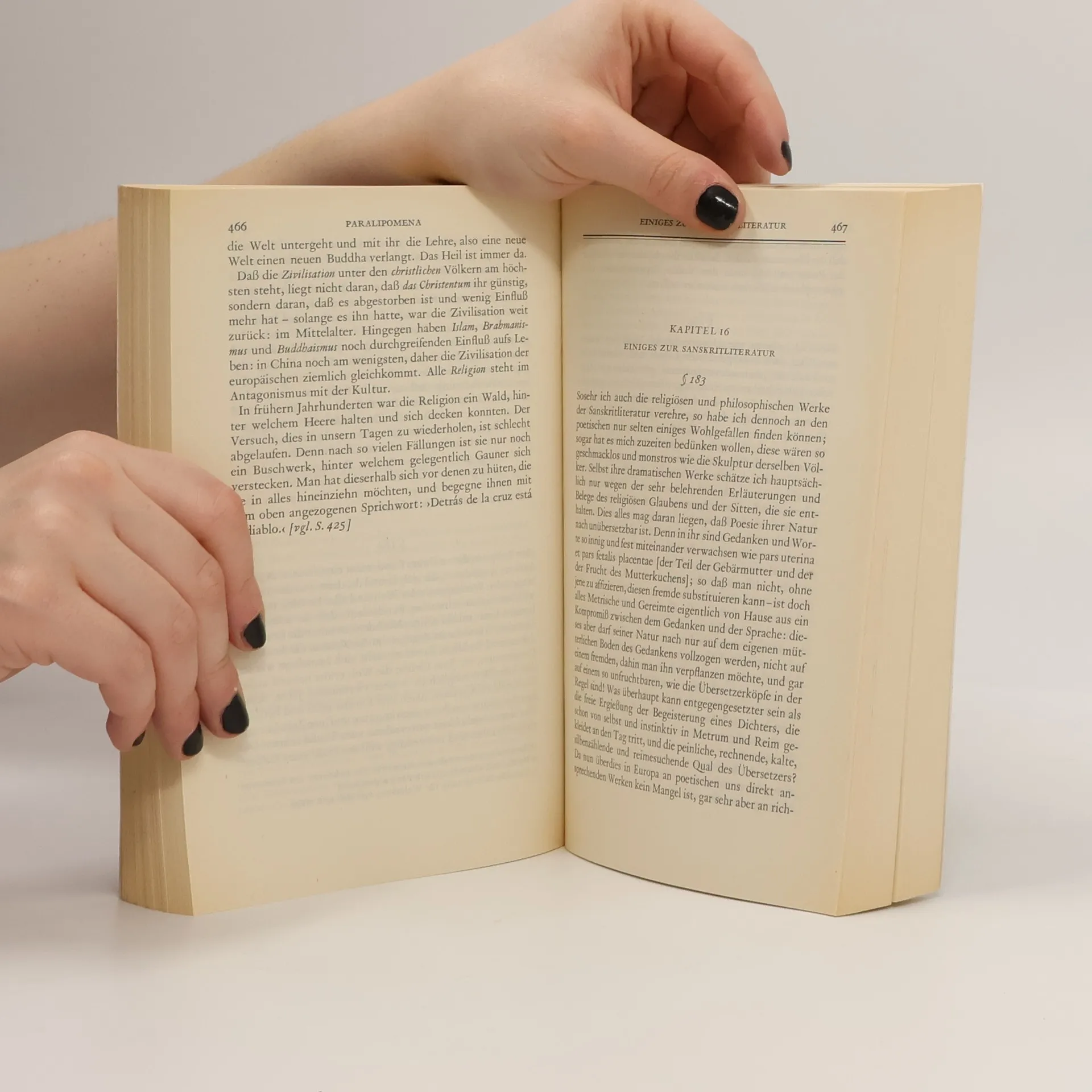 Über Philosophie und ihre Methode. Zur Logik und Dialektik. Den Intellekt überhaupt und in jeder Beziehung betreffende Gedanken. Einige Betrachtungen über den Gegensatz des Dinges an sich und der Erscheinung. Einige Worte über den Pantheismus. Zur Philosophie und Wissenschaft der Natur. Zur Farbenlehre. Zur Ethik. Zur Rechtslehre und Politik. Zur Lehre von der Unzerstörbarkeit unseres wahren Wesens durch den Tod. Nachträge zur Lehre von der Nichtigkeit des Daseins. Nachträge zur Lehre vom Leiden der Welt. Über den Selbstmord. Nachträge zur Lehre von der Bejahung und Verneinung des Willens zum Leben. Über Religion. Einiges zur Sanskritliteratur. Einige archäologische Betrachtungen. Einige mythologische Betrachtungen. Zur Metaphysik des Schönen und Ästhetik. Über Urteil, Kritik, Beifall und Ruhm. Über Gelehrsamkeit und Gelehrte. Selbstdenken. Über Schriftstellerei und Stil. Über Lesen und Bücher. Über Sprache und Worte. Psychologische Bemerkungen. Über die Weiber. Über Erziehung. Zur Physiognomik. Über Lärm und Geräusch. Gleichnisse, Parabeln und Fabeln. Einige Verse. Beiträge von Wolfgang Frhr. von Löhneysen