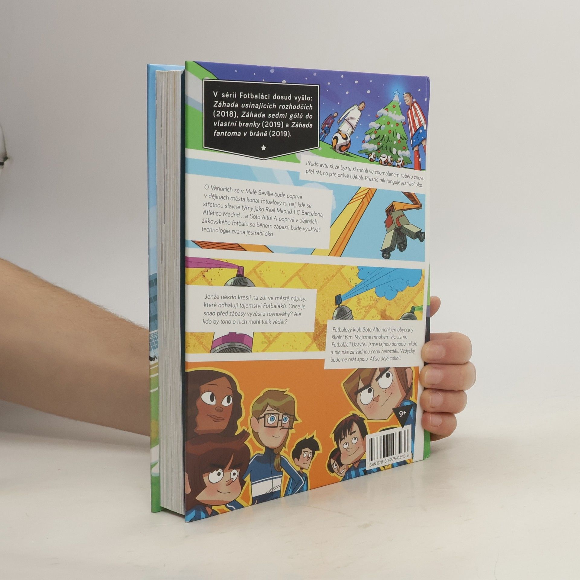 Představte si, že byste si mohli ve zpomaleném záběru znovu přehrát, co jste právě udělali. Přesně tak funguje jestřábí oko. O Vánocích se v Malé Seville bude poprvé v dějinách města konat fotbalový turnaj, kde se střetnou slavné týmy jako Real Madrid, FC Barcelona, Atlético Madrid… A Soto Alto! A poprvé v dějinách žákovského fotbalu se během zápasů bude využívat technologie zvaná jestřábí oko. Jenže někdo zaplňuje zdi ve městě graffiti, která odhalují soukromí Fotbaláků. Chce je snad vyvést z rovnováhy? Ale kdo by toho o nich mohl tolik vědět? Fotbaláci jsou vtipná, poutavě napsaná ilustrovaná série, která vypráví o odhodlání, přátelství a spolupráci. Rozhodně bude bavit i ty, kdo fotbal nehrají, ale pokud fotbal miluješ, je to knížka pro tebe!