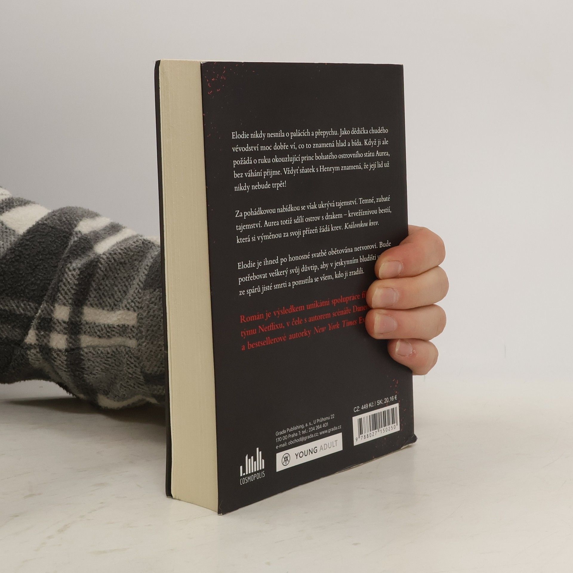 Elodie nikdy nesnila o palácích a přepychu. Jako dědička chudého vévodství moc dobře ví, co to znamená hlad a bída. Když ji ale požádá o ruku okouzlující princ bohatého ostrovního státu Aurea, bez váhání přijme. Vždyť sňatek s Henrym znamená, že její lid už nikdy nebude trpět! Za pohádkovou nabídkou se však ukrývá tajemství. Temné, zubaté tajemství. Aurea totiž sdílí ostrov s drakem – krvežíznivou bestií, která si výměnou za svoji přízeň žádá krev. Královskou krev. Elodie je ihned po honosné svatbě obětována netvorovi. Bude potřebovat veškerý svůj důvtip, aby v jeskynním bludišti unikla ze spárů jisté smrti a pomstila se všem, kdo ji zradili. Román je výsledkem unikátní spolupráce filmařského týmu Netflixu, v čele s autorem scénáře Danem Mazeau, a bestsellerové autorky New York Times Evelyn Skye.