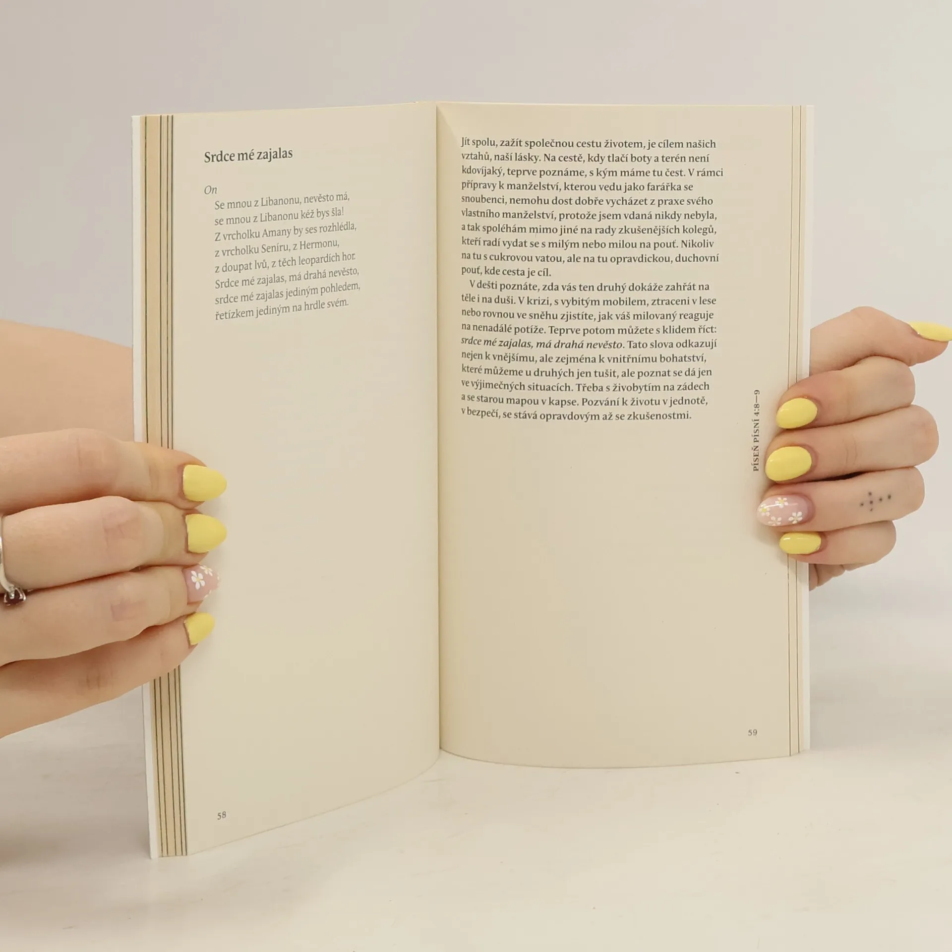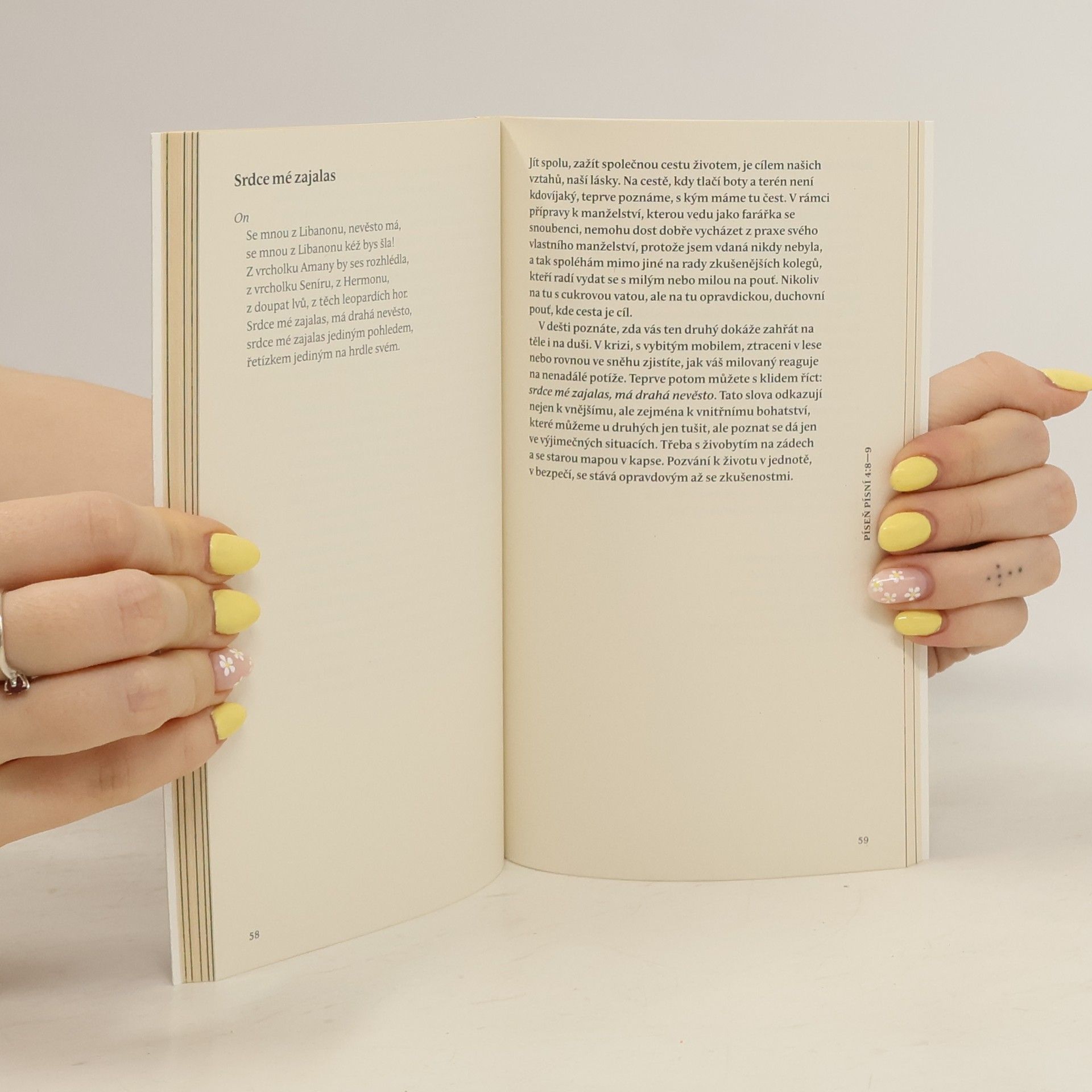 Farářka Církve československé husitské adresuje svou knížku především snoubencům, kterým se věnuje v předsvatební přípravě. Komentář starozákonního textu však ocení každý, kdo chce přemýšlet, co to znamená milovat. „Píseň písní je tou nejčtenější biblickou knihou mimo zdi kostelů a zároveň tou nejméně čtenou v kostelech“, píše v doslovu knihy biblista Alexandr Flek. Ne každý tuší, jak vášnivé až erotické verše lze v Bibli najít. A ne každý se shodne na tom, jak je číst a jak jim rozumět. Ať už někdo čte tuto knihu doslovně či symbolicky, jisté je, že jejím hlavním tématem je láska, která je „silnější než smrt“.