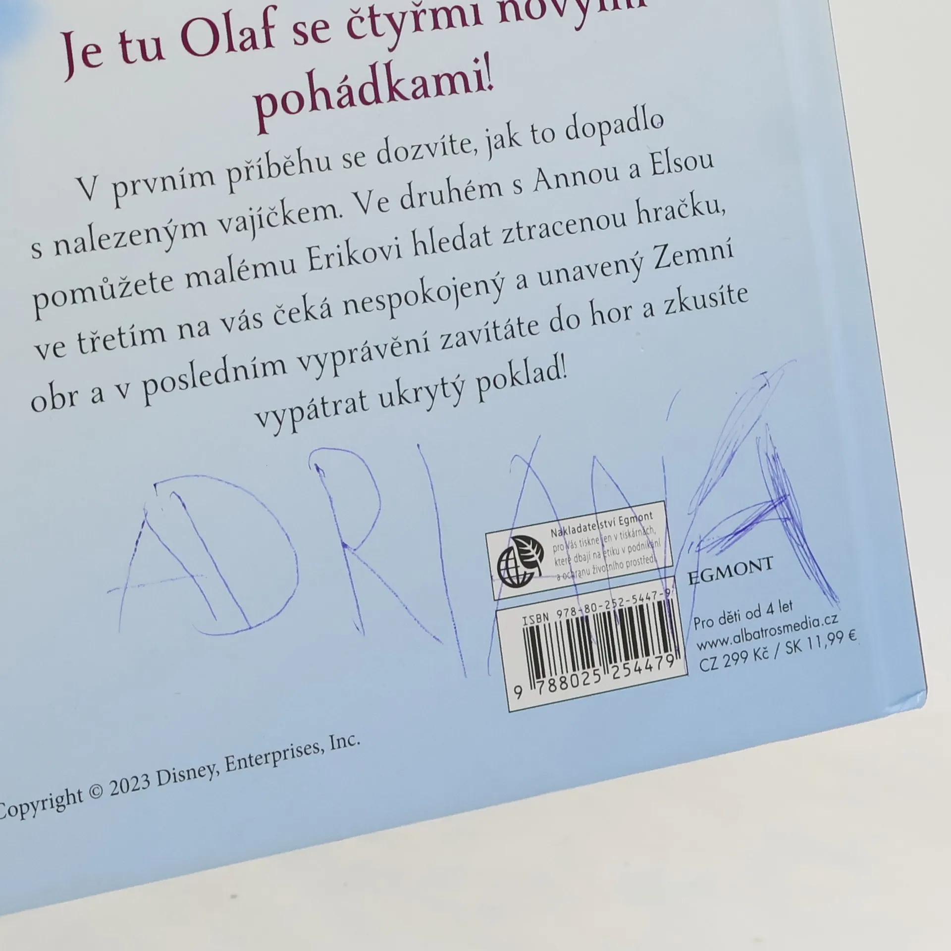 tu Olaf se čtyřmi novými pohádkami! V prvním příběhu se dozvíte, jak to dopadlo s nalezeným vajíčkem. Ve druhém s Annou a Elsou pomůžete malému Erikovi hledat ztracenou hračku, ve třetím na vás čeká nespokojený a unavený zemní obr a v posledním vyprávění zavítáte do hor a zkusíte vypátrat ukrytý poklad krále Agnarra!