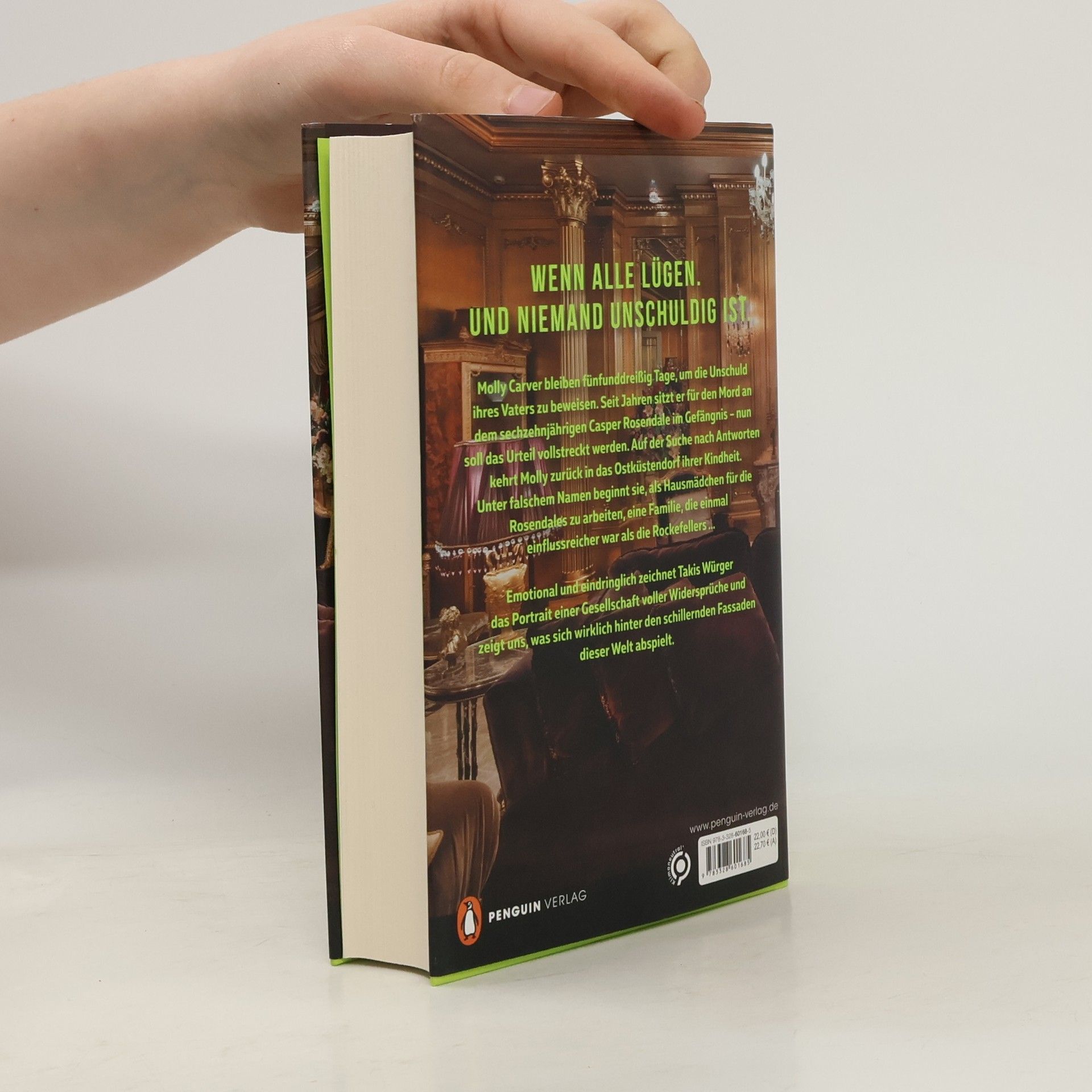 »Es ist fesselnd, es ist packend, es ist berührend.« Christine Westermann Wenn alle lügen. Und niemand unschuldig ist. Molly Carver bleiben fünfunddreißig Tage, um die Unschuld ihres Vaters zu beweisen. Seit Jahren sitzt er für den Mord an dem sechzehnjährigen Casper Rosendale im Gefängnis – nun soll das Urteil vollstreckt werden. Auf der Suche nach Antworten kehrt Molly zurück in das Ostküstendorf ihrer Kindheit. Unter falschem Namen beginnt sie, als Hausmädchen für die Rosendales zu arbeiten, eine Familie, die einmal einflussreicher war als die Rockefellers … Emotional und eindringlich zeichnet Takis Würger das Portrait einer Gesellschaft voller Widersprüche und zeigt uns, was sich wirklich hinter den schillernden Fassaden dieser Welt abspielt.