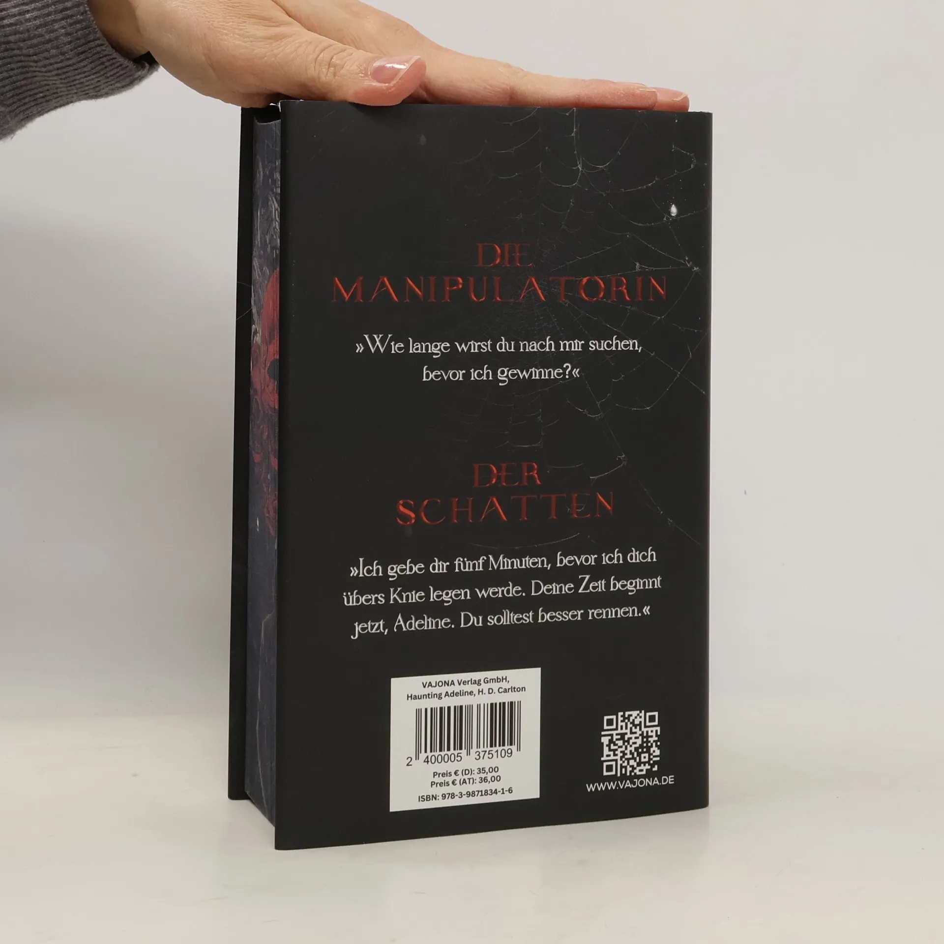 HARDCOVER SPEACIALEDITION Die Manipulatorin Ich kann die Emotionen von jedem manipulieren, der es zulässt. Ich werde dich verletzen, dich weinen lassen, dich zum Lachen und Seufzen bringen. Aber meine Worte berühren ihn nicht. Besonders dann nicht, wenn ich darum flehe, dass er geht. Er ist immer da, beobachtet und wartet. Und ich kann niemals wegschauen. Nicht, wenn ich möchte, dass er näher kommt. Der Schatten Ich wollte mich nicht verlieben. Aber jetzt kann ich ihr nicht mehr fernbleiben. Ich bin fasziniert von ihrem Lächeln, von ihren Augen und der Art, wie sie sich bewegt. Der Art, wie sie sich auszieht ... Ich werde weiter zusehen und warten. Bis ich sie die Meine nennen kann. Und wenn sie es erst einmal ist, werde ich sie nie wieder gehen lassen. Nicht einmal, wenn sie bettelt. Der internationale Bestseller von H. D. Carlton! Leseempfehlung: ab 18 Jahre