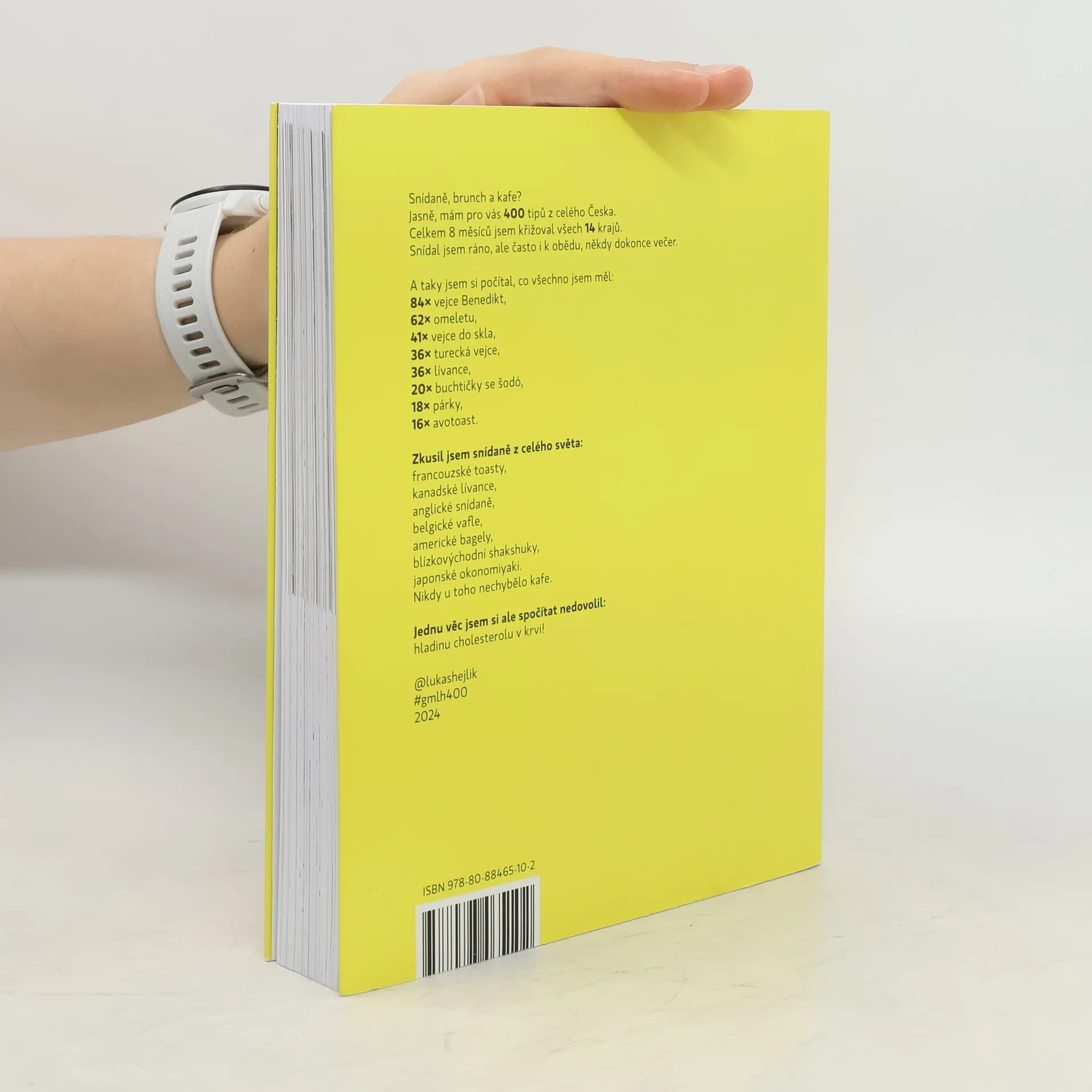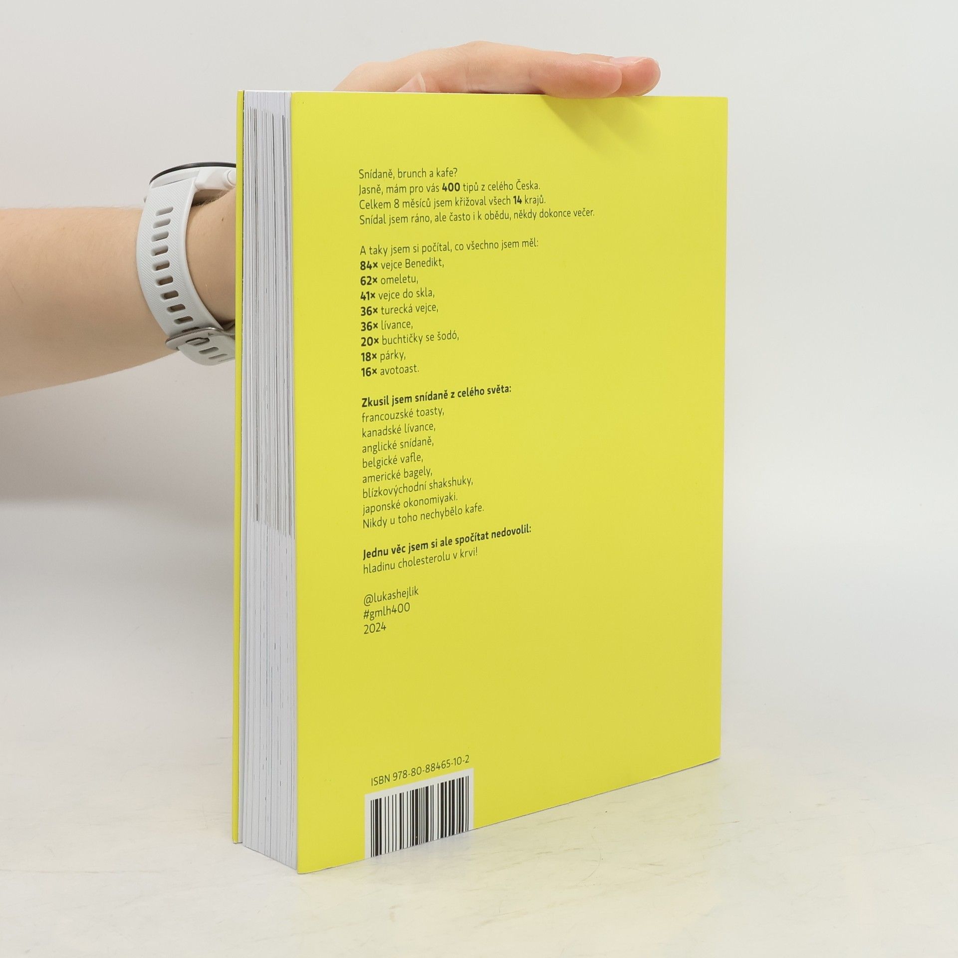 Čtvrtá knížka Gastromapy je žloutkově žlutá! Lukáš Hejlík přináší 400 tipů ze všech regionů Česka. Na svých cestách si počítal, co kde snídal. Vejce Benedikt měl v 84 podnicích, zkusil 62 omelet, 41krát to byla vejce do skla. Máloco mělo poslední dobou takový nástup jako turecká vejce, ta otestoval na 36 místech. Tolikrát si dal mimochodem i lívance. Celkem 20krát to byly buchtičky s krémem, 18krát párky a 16krát avotoast. Často to byly jen obložené chleby, sendviče nebo toasty. Procestoval v Česku celý svět a zkusil anglické snídaně, francouzské toasty, kanadské lívance, belgické vafle, bagely z Ameriky, shakshuku z Blízkého východu nebo japonské okonomiyaki. Nezapomínal ani na fanoušky sladké snídaně, jedl palačinky, žemlovky, kaše ovesné, rýžové i krupicové. Pokaždé u toho bylo kafe. Také přesně ví, kolik za všechny ty snídaně a brunche utratil. Ale jednu věc si spočítat nenechal - hladinu cholesterolu v krvi.