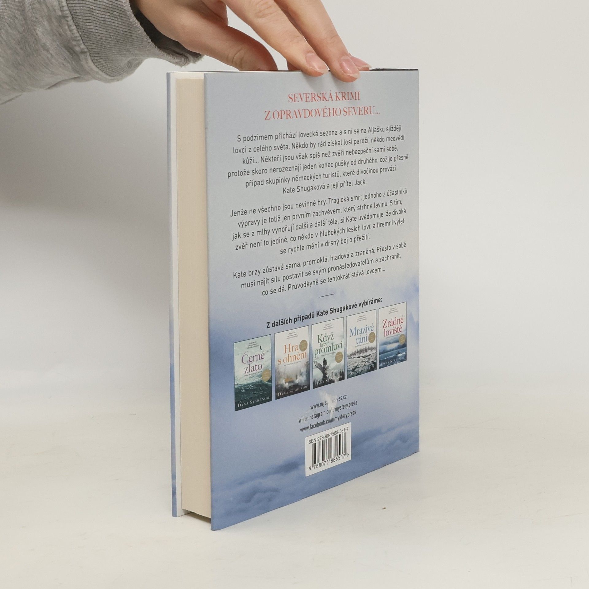 SEVERSKÁ KRIMI Z OPRAVDOVÉHO SEVERU… S podzimem přichází lovecká sezona a s ní se na Aljašku sjíždějí lovci z celého světa. Někdo by rád získal losí paroží, někdo medvědí kůži… Někteří jsou však spíš než zvěři nebezpeční sami sobě, protože skoro nerozeznají jeden konec pušky od druhého, což je přesně případ skupinky německých turistů, které divočinou provází Kate Shugaková a její přítel Jack. Jenže ne všechno jsou nevinné hry. Tragická smrt jednoho z účastníků výpravy je totiž jen prvním záchvěvem, který strhne lavinu. S tím, jak se z mlhy vynořují další a další těla, si Kate uvědomuje, že divoká zvěř není to jediné, co někdo v hlubokých lesích loví, a firemní výlet se rychle mění v drsný boj o přežití. Kate brzy zůstává sama, promoklá, hladová a zraněná. Přesto v sobě musí najít sílu postavit se svým pronásledovatelům a zachránit, co se dá. Průvodkyně se tentokrát stává lovcem…
