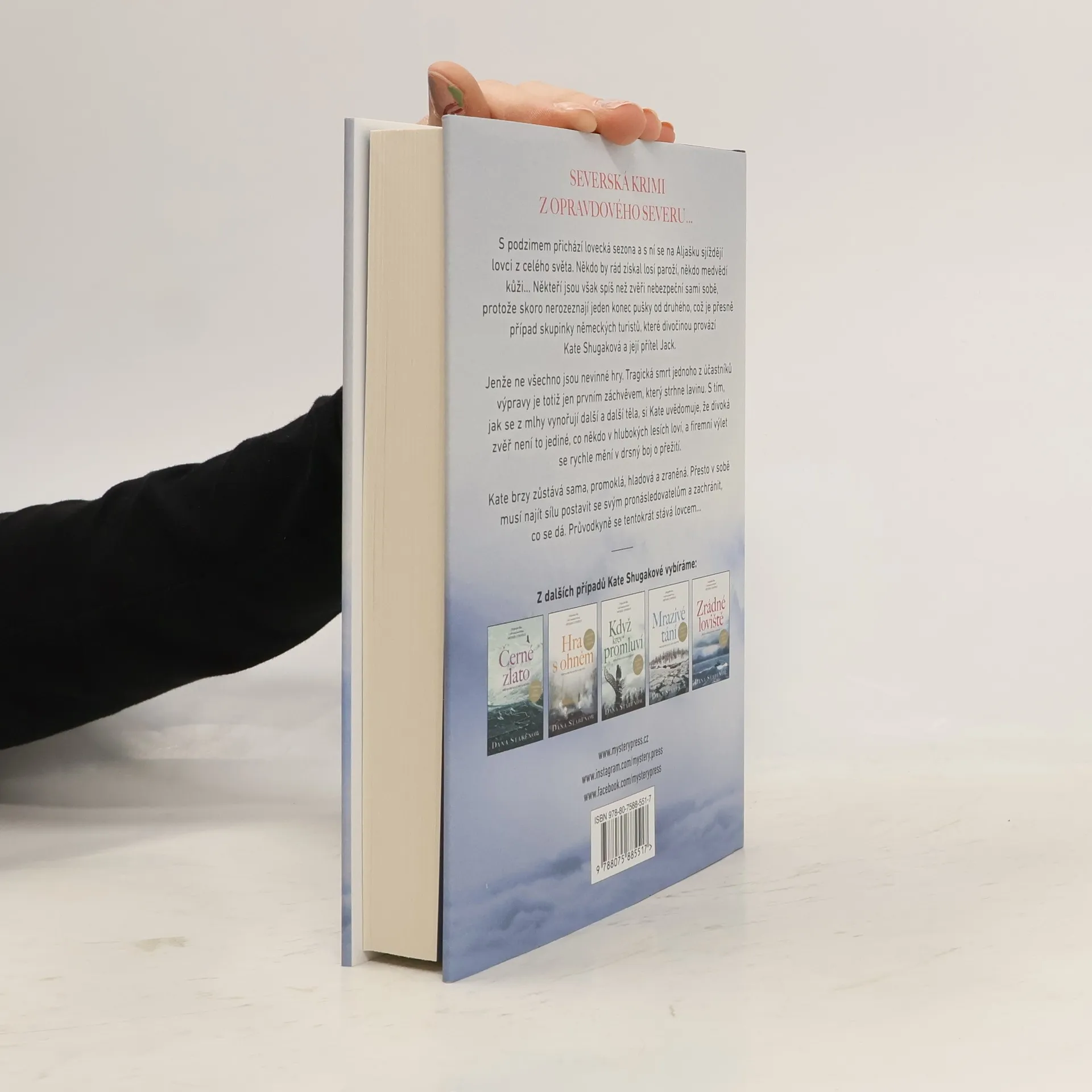 SEVERSKÁ KRIMI Z OPRAVDOVÉHO SEVERU… S podzimem přichází lovecká sezona a s ní se na Aljašku sjíždějí lovci z celého světa. Někdo by rád získal losí paroží, někdo medvědí kůži… Někteří jsou však spíš než zvěři nebezpeční sami sobě, protože skoro nerozeznají jeden konec pušky od druhého, což je přesně případ skupinky německých turistů, které divočinou provází Kate Shugaková a její přítel Jack. Jenže ne všechno jsou nevinné hry. Tragická smrt jednoho z účastníků výpravy je totiž jen prvním záchvěvem, který strhne lavinu. S tím, jak se z mlhy vynořují další a další těla, si Kate uvědomuje, že divoká zvěř není to jediné, co někdo v hlubokých lesích loví, a firemní výlet se rychle mění v drsný boj o přežití. Kate brzy zůstává sama, promoklá, hladová a zraněná. Přesto v sobě musí najít sílu postavit se svým pronásledovatelům a zachránit, co se dá. Průvodkyně se tentokrát stává lovcem…