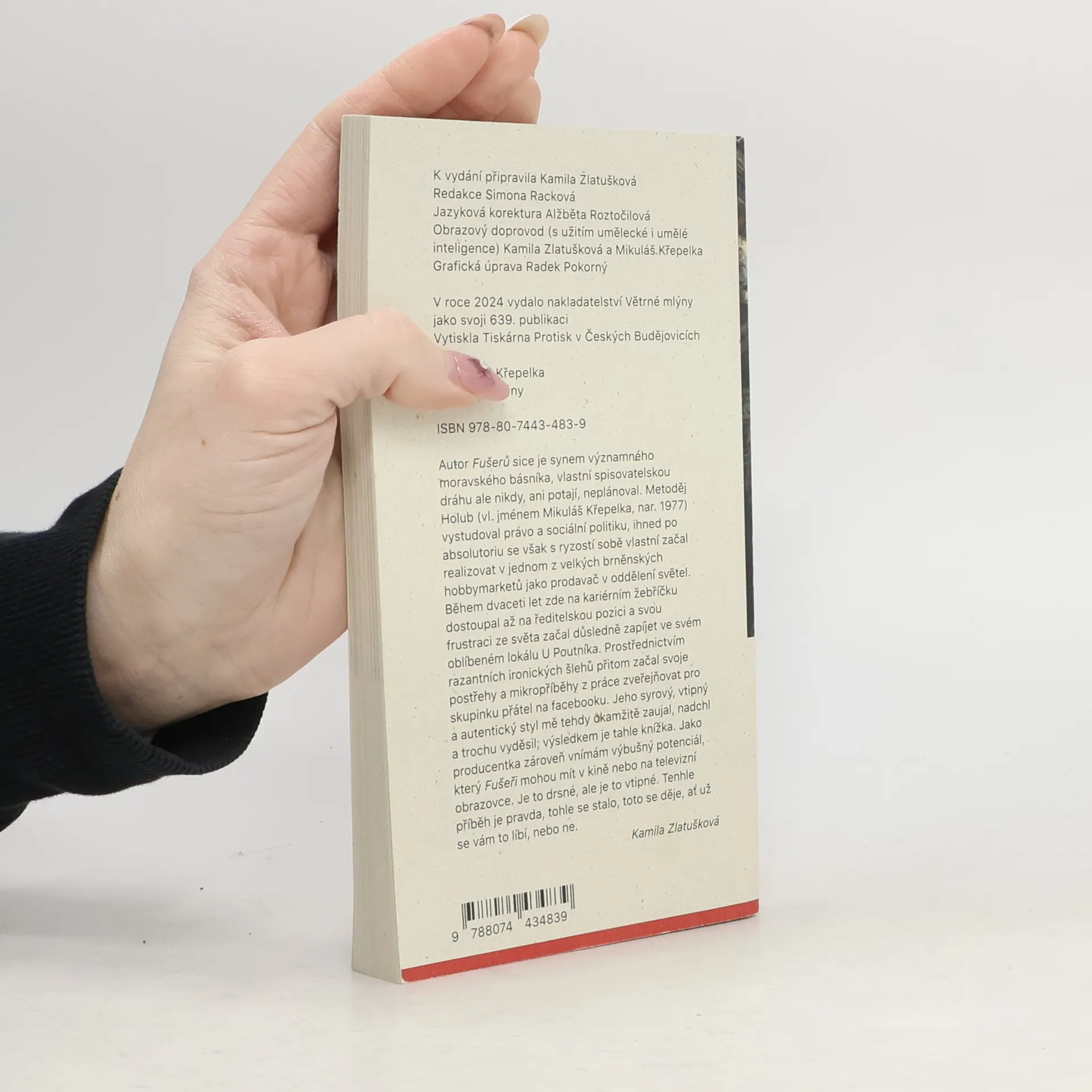 Autor Fušerů sice je synem významného moravského básníka, vlastní spisovatelskou dráhu ale nikdy, ani potají, neplánoval. Metoděj Holub (vl. jménem Mikuláš Křepelka, nar. 1977) vystudoval právo a sociální politiku, ihned po absolutoriu se však s ryzostí sobě vlastní začal realizovat v jednom z velkých brněnských hobbymarketů jako prodavač v oddělení světel. Během dvaceti let zde na kariérním žebříčku dostoupal až na ředitelskou pozici a svou frustraci ze světa začal důsledně zapíjet ve svém oblíbeném lokálu U Poutníka. Prostřednictvím razantních ironických šlehů přitom začal svoje postřehy a mikropříběhy z práce zveřejňovat pro skupinku přátel na facebooku. Jeho syrový, vtipný a autentický styl mě tehdy okamžitě zaujal, nadchl a trochu vyděsil; výsledkem je tahle knížka. Jako producentka zároveň vnímám výbušný potenciál, který Fušeři mohou mít v kině nebo na televizní obrazovce. Je to drsné, ale je to vtipné. Tenhle příběh je pravda, tohle se stalo, toto se děje, ať už se vám to líbí, nebo ne.