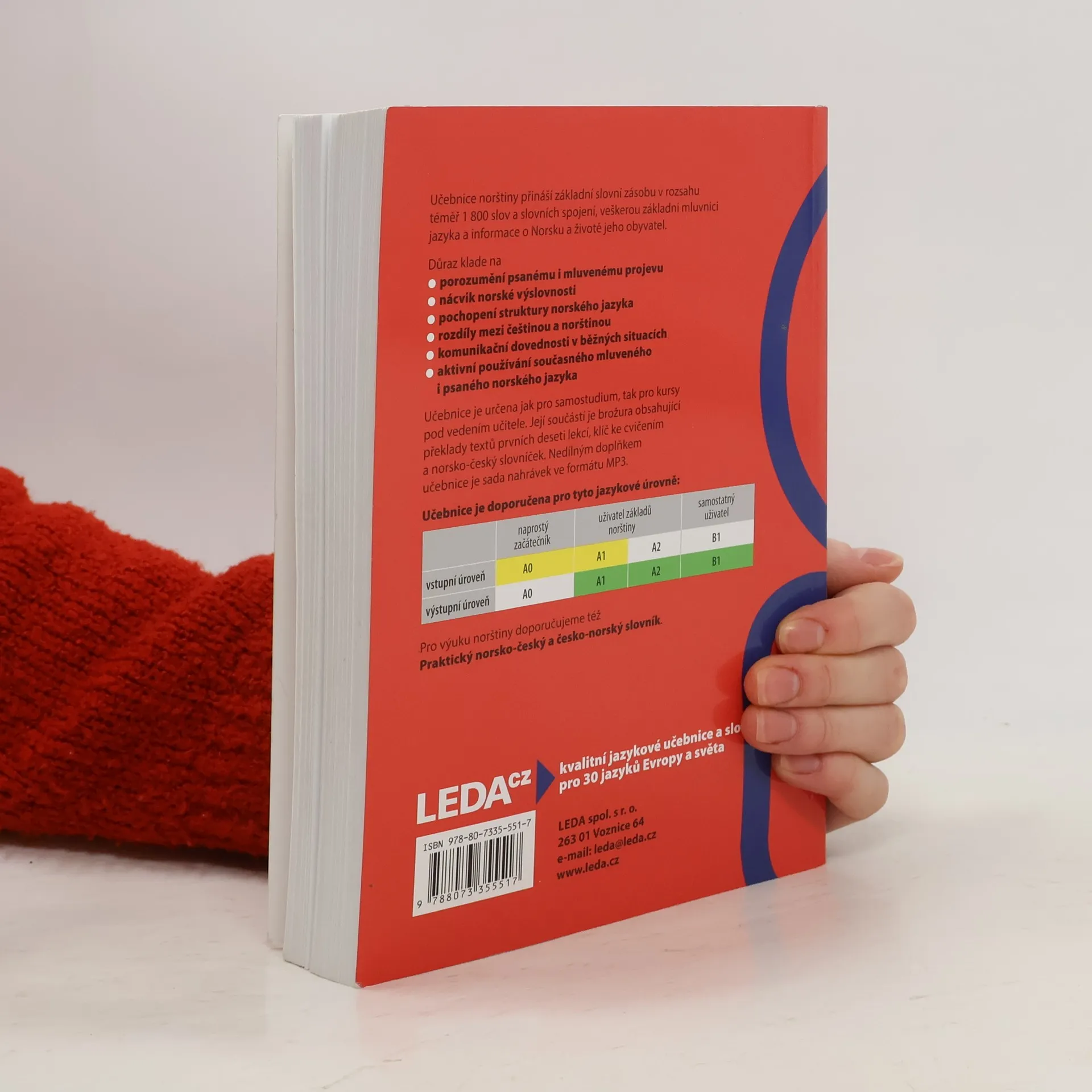 Základní učebnice norštiny je určena všem, kteří se chtějí naučit norsky (bokmal) především samostudiem, dobře ale poslouží i pro jazykové kurzy. V jednotlivých lekcích je zařazen úvodní článek (nebo články), dále dialogy, základní slovíčka pro danou lekci, rozšiřující slovní zásoba, oddíl frází a předložkových vazeb, informace týkající se norských reálií, oddíl s mluvnickým výkladem, cvičení na výslovnost, poslechová cvičení a velké množství cvičení na mluvnické jevy a slovní zásobu. Úvodní texty jednotlivých lekcí obsahují jak užitečné fráze nutné pro dorozumění v běžných situacích, tak zajímavé reálie týkající se Norska a života lidí v této zemi.