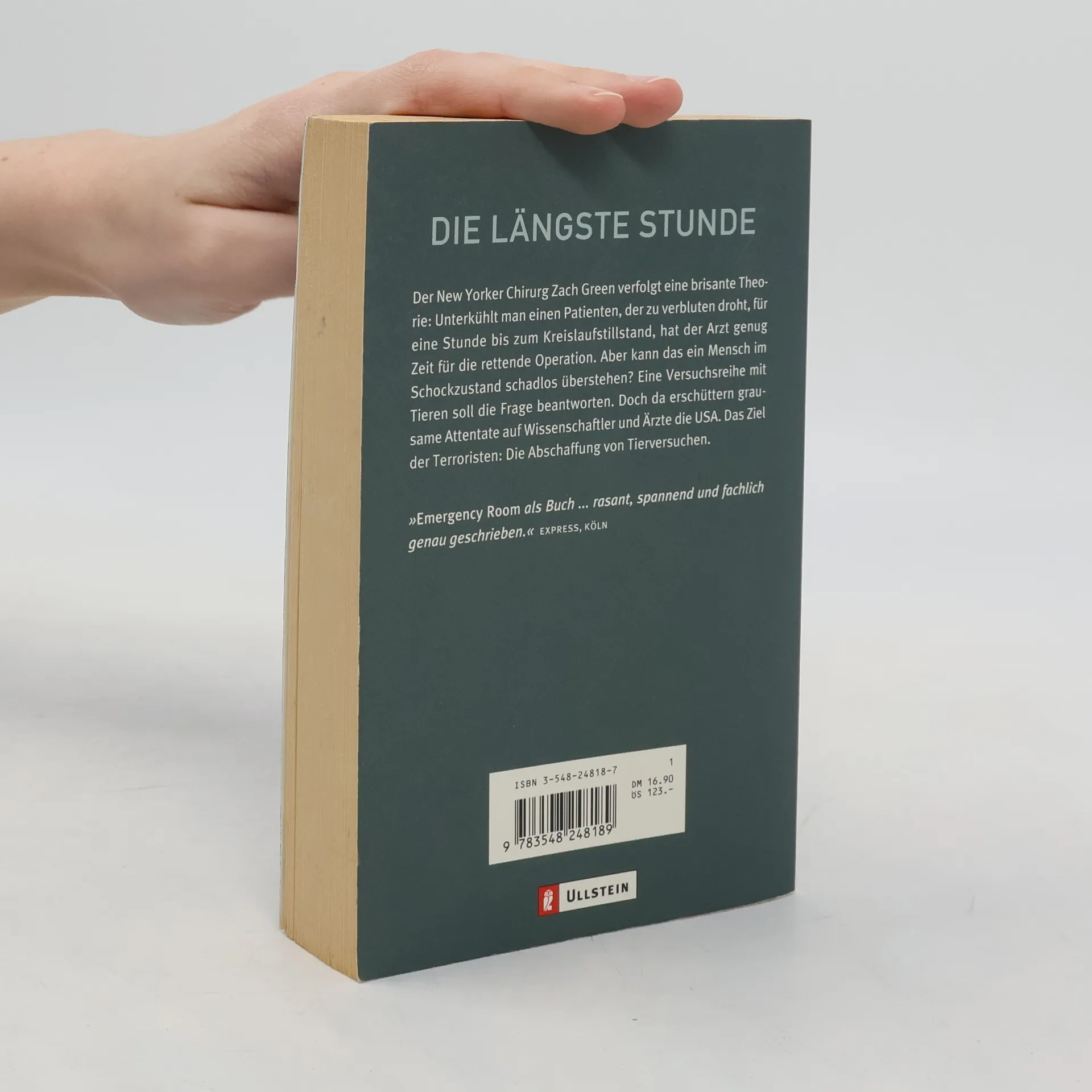 Der New Yorker Chirurg Zach Green verfolgt ene brisante Theorie: Unterkühlt man einen Patienten, der zu verbluten droht, für eine Stunde bis zum Kreislaufstillstand, hat der Arzt genug Zeit für die rettende Operation. Aber kann das ein Mensch im Schockzustand schadlos überstehen? Eine Versuchsreihe mit Tieren soll die Frage beantworten. Doch da erschüttern grausame Attentate auf Wissenschaftler und Ärzte die USA. Das Ziel der Terroristen: Die Abschaffung von Tierversuchen