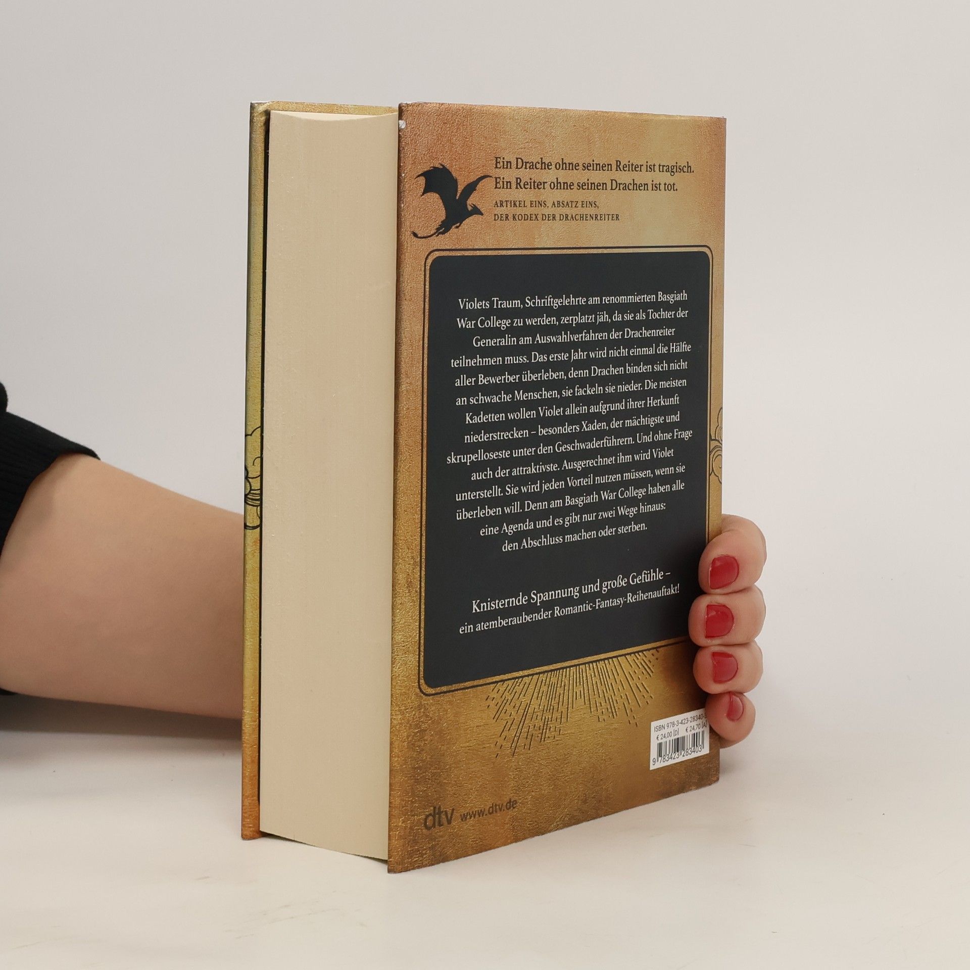 Ein Drache ohne seinen Reiter ist tragisch. Ein Reiter ohne seinen Drachen ist tot. In wunderschöner, hochwertiger Ausstattung mit aufwendig veredeltem Schutzumschlag, gestaltetem Einband und farbigen Karten im Innenteil. Knisternde Spannung und große Gefühle – ein atemberaubender Romantic-Fantasy-Reihenauftakt! Perfekt für alle Fans von Jennifer L. Armentrout, Naomi Novik und Sarah J. Maas. Violets Traum, Schriftgelehrte am renommierten Basgiath War College zu werden, zerplatzt jäh, da sie als Tochter der Generalin am Auswahlverfahren der Drachenreiter teilnehmen muss. Das erste Jahr wird nicht einmal die Hälfte aller Bewerber überleben, denn Drachen binden keine schwachen Menschen, sie fackeln sie nieder. Die meisten Kadetten wollen Violet allein aufgrund ihrer Herkunft niederstrecken – besonders Xaden, der mächtigste und skrupelloseste unter den Geschwaderführern. Und ohne Frage auch der attraktivste. Ausgerechnet ihm wird Violet unterstellt. Sie wird jeden Vorteil nutzen müssen, wenn sie überleben will. Denn am Basgiath War College haben alle eine Agenda und es gibt nur zwei Wege hinaus: den Abschluss machen oder sterben.