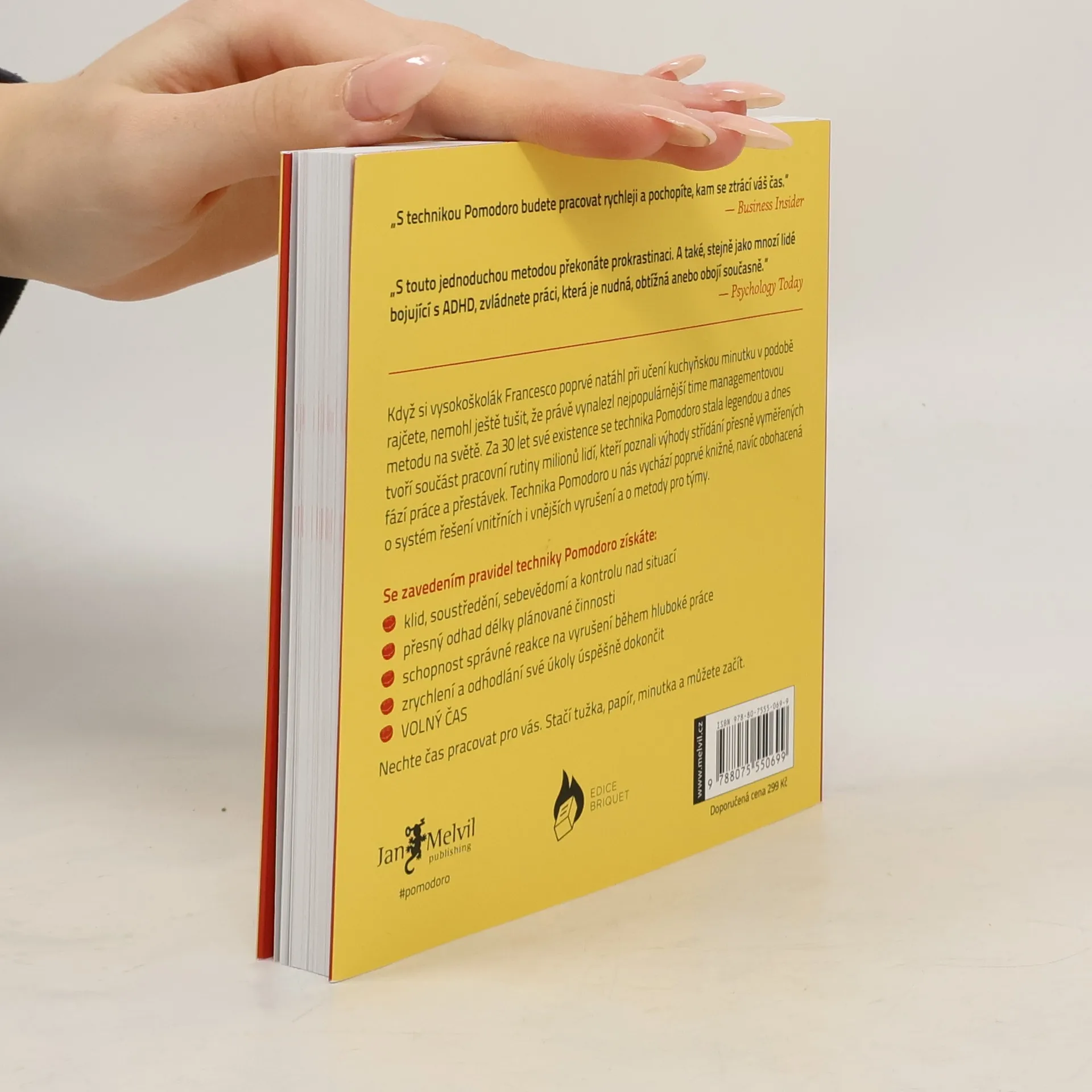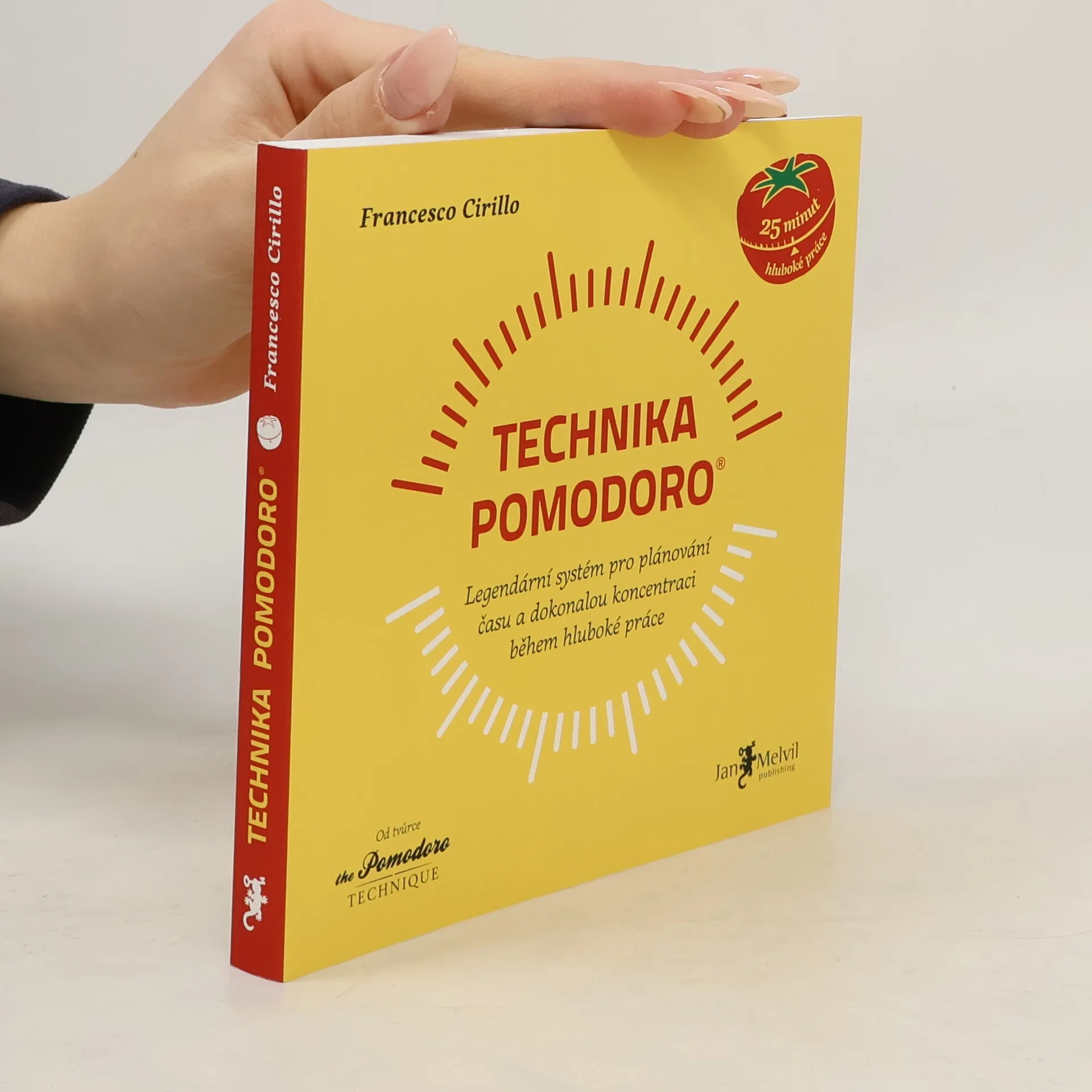 Když si vysokoškolák Francesco poprvé natáhl při učení kuchyňskou minutku v podobě rajčete, nemohl ještě tušit, že právě vynalezl nejpopulárnější time managementovou metodu na světě. Za 30 let své existence se technika Pomodoro stala legendou a dnes tvoří součást pracovní rutiny milionů lidí, kteří poznali výhody střídání přesně vyměřených fází práce a přestávek. Technika Pomodoro u nás vychází poprvé knižně, navíc obohacená o systém řešení vnitřních i vnějších vyrušení a o metody pro týmy. Se zavedením pravidel techniky Pomodoro získáte: klid, soustředění, sebevědomí a kontrolu nad situací - přesný odhad délky plánované činnosti - schopnost správné reakce na vyrušení během hluboké práce - zrychlení a odhodlání své úkoly úspěšně dokončit. Nechte čas pracovat pro vás. Stačí tužka, papír, minutka a můžete začít. Základem techniky Pomodoro jsou pětadvacetiminutové intervaly hluboké práce prokládané krátkými přestávkami. Po každém bloku čtyř odpracovaných Pomodor přichází delší pauza. Součástí metody je však také plánování a průběžné monitorování denních činností, evidence výsledků a zpracování cenné zpětné vazby, kterou si pomocí jednoduchých záznamů můžete poskytovat sami. Kromě zjednodušení pracovních procesů tak díky technice Pomodoro zjistíte, kolik času a úsilí si různé činnosti skutečně žádají, a již nikdy nepadnete do pasti nesplněných termínů.
