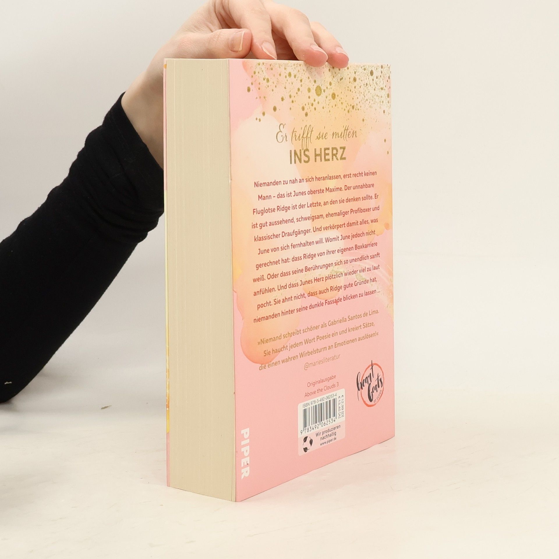 Niemanden zu nah an sich heranlassen, erst recht keinen Mann – das ist Junes oberste Maxime. Der unnahbare Fluglotse Ridge Chapman verkörpert alles, was June meiden möchte: gut aussehend, schweigsam, mysteriös und ehemaliger Profiboxer. Dennoch ist er der Einzige, der für ihr geheimes Fotoprojekt infrage kommt, da er ihr einen Gefallen schuldet. Überraschend weiß Ridge von Junes bisher verschwiegender Boxkarriere und seine Berührungen lassen ihr Herz plötzlich wieder laut pochen. Dabei ahnt sie nicht, dass auch Ridge Gründe hat, niemanden hinter seine dunkle Fassade blicken zu lassen. Die LeserInnen sind begeistert von der „Above the Clouds“-Trilogie, die sie auf eine emotionale Reise mitnimmt. „Flaming Clouds“ und „Endless Skies“ werden als tief und kraftvoll beschrieben, mit Charakteren, in die man sich verliebt. Die Bücher sind wie Lieblingssongs, die mitreißen und Gänsehaut verleihen. Gabriella Santos de Lima, geboren 1997 in São Paulo, studiert Kreatives Schreiben in Hildesheim und arbeitet nebenberuflich als Flugbegleiterin. Sie schreibt am liebsten mit Blick auf pulsierende Innenstädte und teilt auf Instagram unter @gabriellasantosdelimaa Buchtipps und Neuigkeiten aus ihrem Leben.