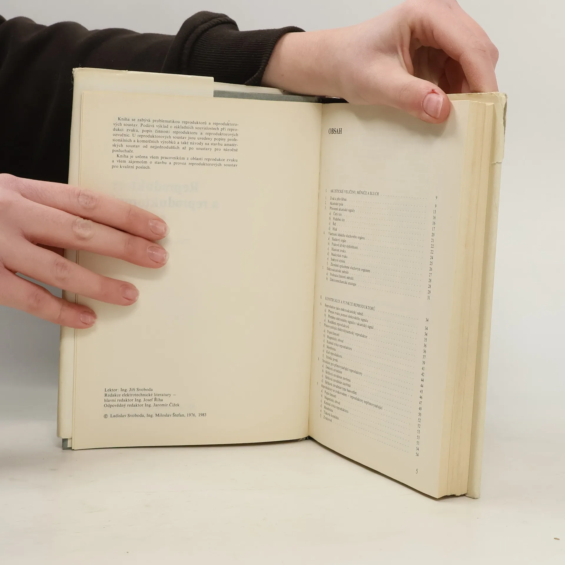 3. přepracované vydání. Publikace je určena všem pracovníkům v oblasti reprodukce zvuku a všem zájemcům o stavbu a pro- voz reproduktorových soustav pro kvalitní poslech. Akustické veličiny, měniče a sluch, Konstrukce a funkce reproduktorů, Měření a vyjadřování elektroakustických vlastností reproduktorů, Reproduktory Tesla pro všeobecné použití, Reproduktorové soustavy pro kvalitní přednes hudby, Provedení reproduktorových soustav, Reproduktor a poslechový prostor, Reproduktorové soustavy pro stereofonní a kvadrofonní přenos hudby, Ozvučování veřejných prostorů, Reproduktory pro zvláštní použití. 04-534-83