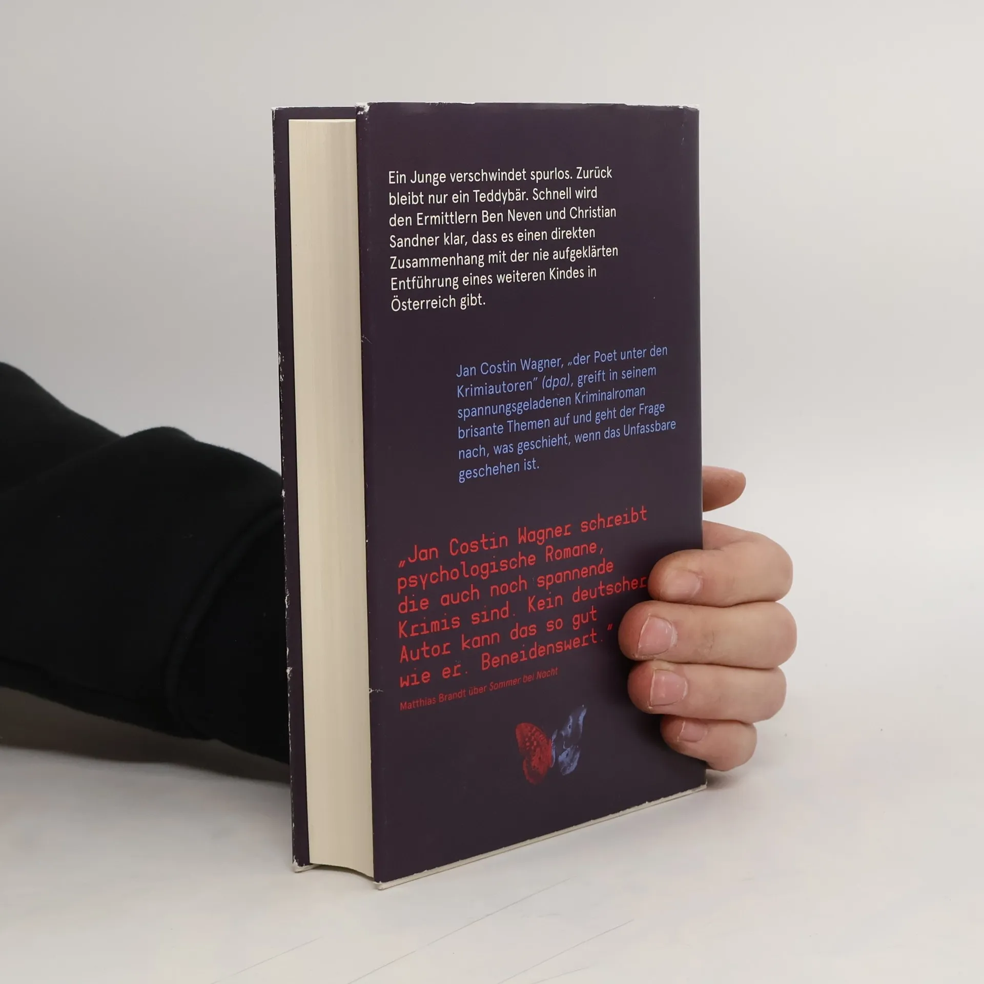 Ein Kind verschwindet. Dabei hat seine Mutter den Jungen nur für wenige Momente aus den Augen gelassen. Die Ermittlungen beginnen und schnell stößt die Polizei auf Verbindungen zu einem weiteren vermissten Jungen. Zum Auftakt seiner neuen Reihe erzählt Krimipreisträger Jan Costin Wagner eine spannungsgeladene Geschichte auf einmalig einfühlsame und literarisch meisterhafte Weise. Die Ermittler Ben Neven und Christian Sandner machen sich auf die Suche nach dem fünfjährigen Jannis. Zeugen erinnern sich, dass ein Mann mit einem Teddybär auf dem Arm das Kind während des Flohmarkts in der Grundschule angesprochen hat. Schnell wird Ben und Christian klar, dass sich die schlimmsten Befürchtungen bewahrheiten. Und nicht nur das: es scheint einen direkten Zusammenhang mit der nie aufgeklärten Entführung eines weiteren Kindes in Österreich zu geben. Die beiden Polizisten stoßen auf finstere Abgründe.