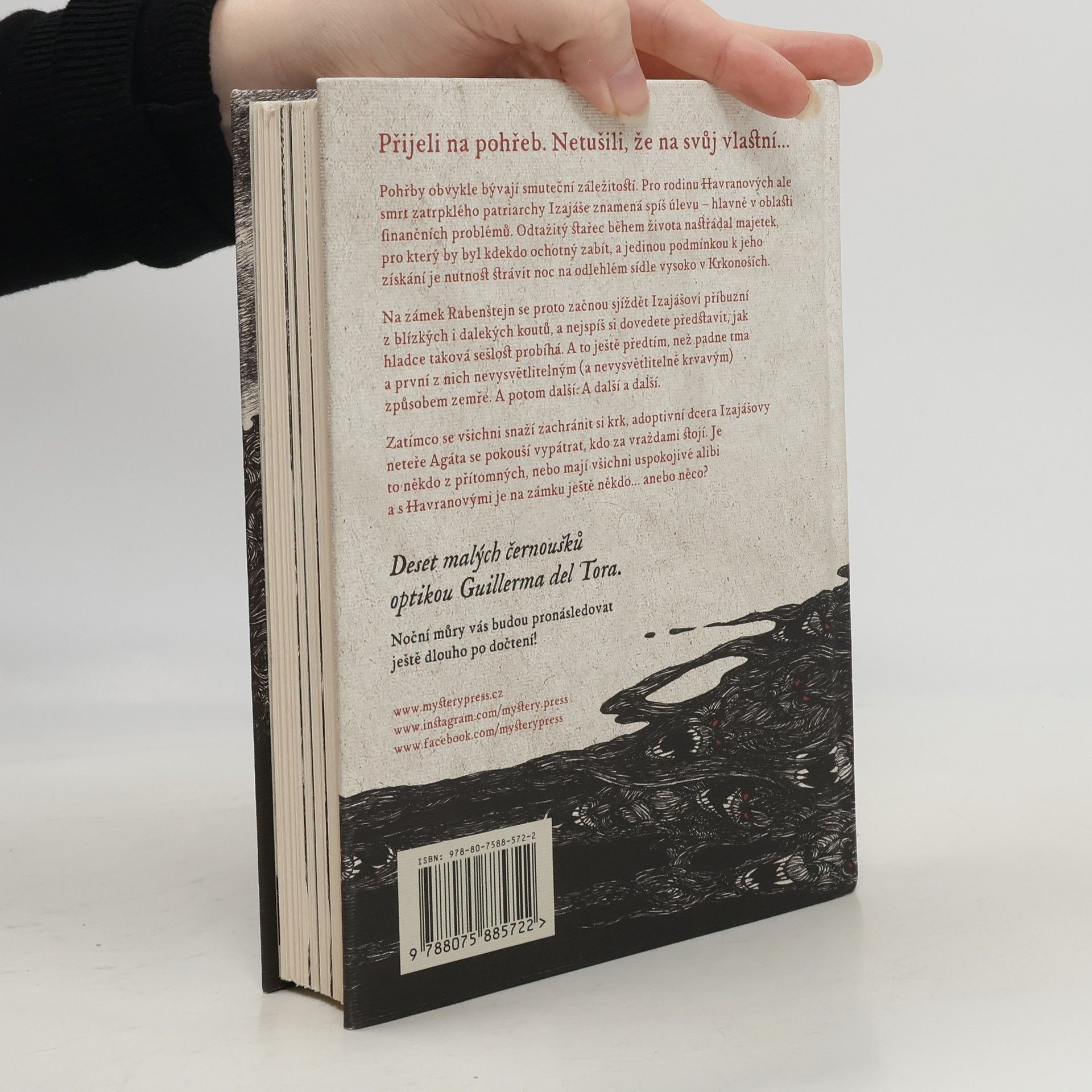 PŘIJELI NA POHŘEB. NETUŠILI, ŽE NA SVŮJ VLASTNÍ... Pohřby obvykle bývají smuteční záležitostí. Pro rodinu Havranových ale smrt zatrpklého patriarchy Izajáše znamená spíš úlevu – hlavně v oblasti finančních problémů. Odtažitý stařec během života nastřádal majetek, pro který by byl kdekdo ochotný zabít, a jedinou podmínkou k jeho získání je nutnost strávit noc na odlehlém sídle vysoko v Krkonoších. Na zámek Rabenštejn se proto začnou sjíždět Izajášovi příbuzní z blízkých i dalekých koutů, a nejspíš si dovedete představit, jak hladce taková sešlost probíhá. A to ještě předtím, než padne tma a první z nich nevysvětlitelným (a nevysvětlitelně krvavým) způsobem zemře. A potom další. A další a další. Zatímco se všichni snaží zachránit si krk, adoptivní dcera Izajášovy neteře Agáta se pokouší vypátrat, kdo za vraždami stojí. Je to někdo z přítomných a mají všechny logické vysvětlení, nebo je s Havranovými na zámku ještě někdo anebo něco? ____ Deset malých černoušků optikou Guillerma del Tora. Noční můry vás budou pronásledovat ještě dlouho po dočtení!