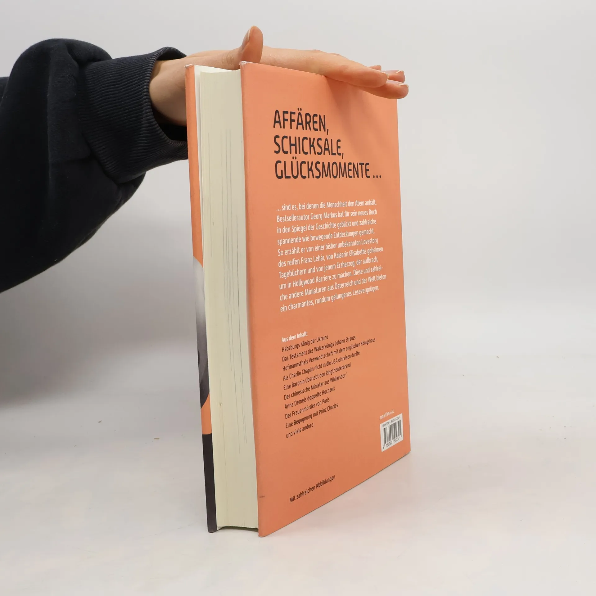 Affären, Schicksale, Glücksmomente … sind es, bei denen die Menschheit den Atem anhält. Bestsellerautor Georg Markus hat für sein neues Buch in den Spiegel der Geschichte geblickt und zahlreiche spannende wie bewegende Entdeckungen gemacht. So erzählt er von einer bisher unbekannten Lovestory des reifen Franz Lehár, von Kaiserin Elisabeths geheimen Tagebüchern und von jenem Erzherzog, der aufbrach, um in Hollywood Karriere zu machen. Diese und zahlreiche andere Miniaturen aus Österreich und der Welt bieten ein charmantes, rundum gelungenes Lesevergnügen.