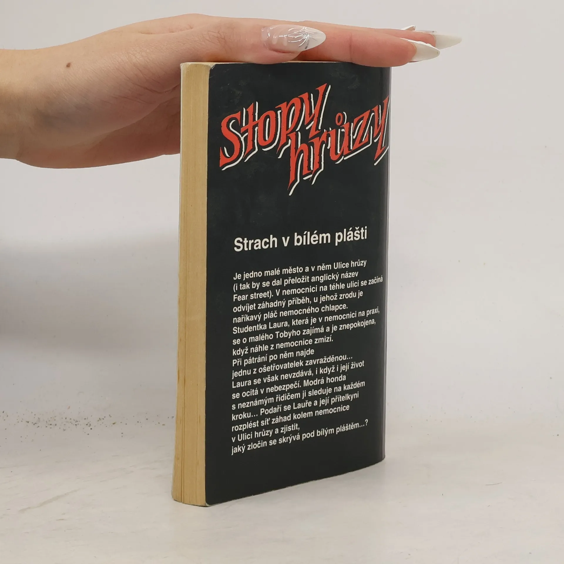 Je jedno malé město a v něm Ulice Hrůzy (i tak by se dal přeložit anglický název Fear Street). V nemocnici na téhle ulici se začíná odvíjet záhadný příběh, u jehož zrodu je naříkavý pláč nemocného chlapce. Studentka Laura, která je v nemocnici na praxi, se o malého Tobyho zajímá a je znepokojena, když náhle z nemocnice zmizí. Při pátrání po něm najde jednu z ošetřovatelek zavražděnou… Laura se však nevzdává, i když i její život se ocitá v nebezpečí. Modrá honda s neznámým řidičem ji sleduje na každém kroku… Podaří se Lauře a její přítelkyni rozplést síť záhad kolem nemocnice v Ulici Hrůzy a zjistit, jaký zločin se skrývá po bílým pláštěm…?