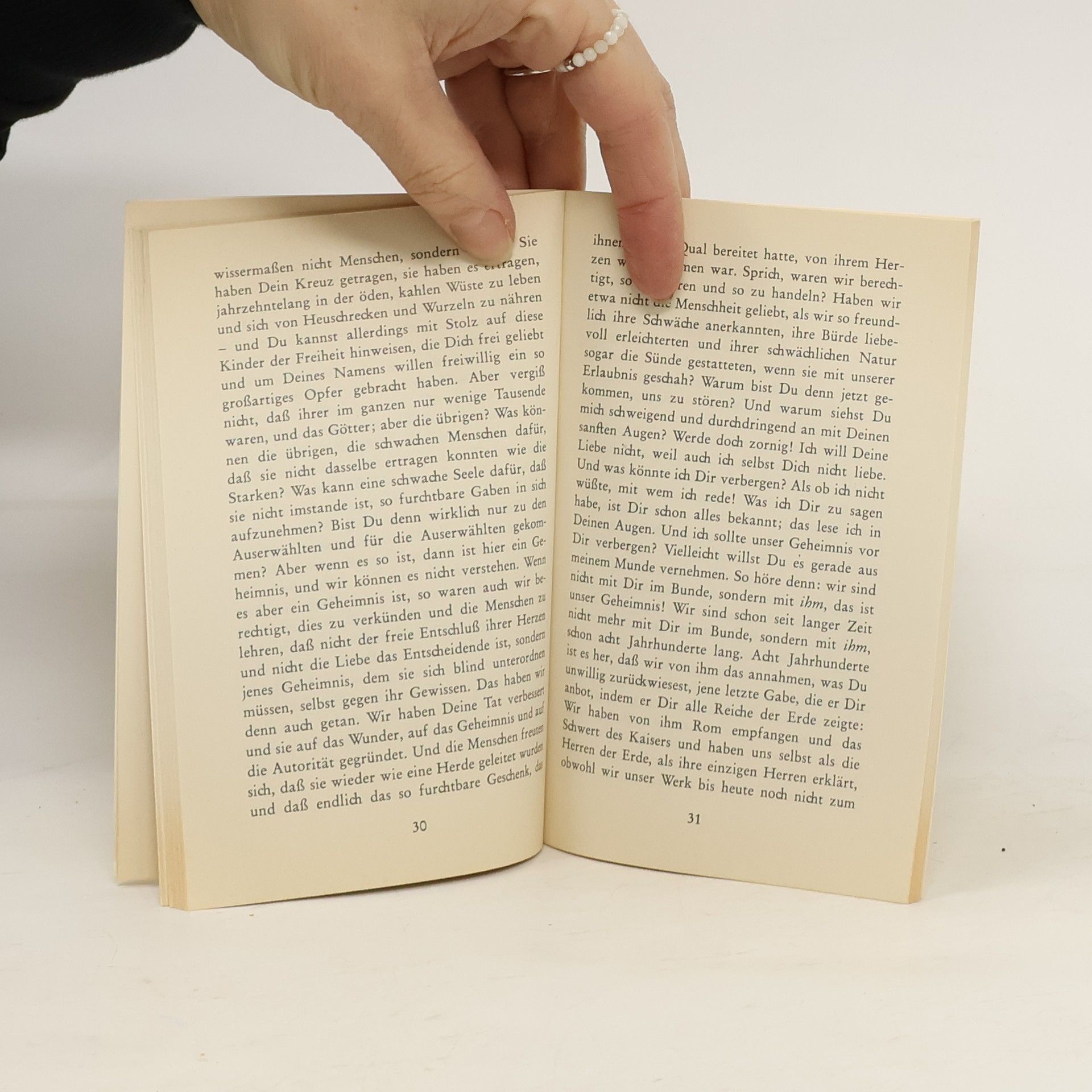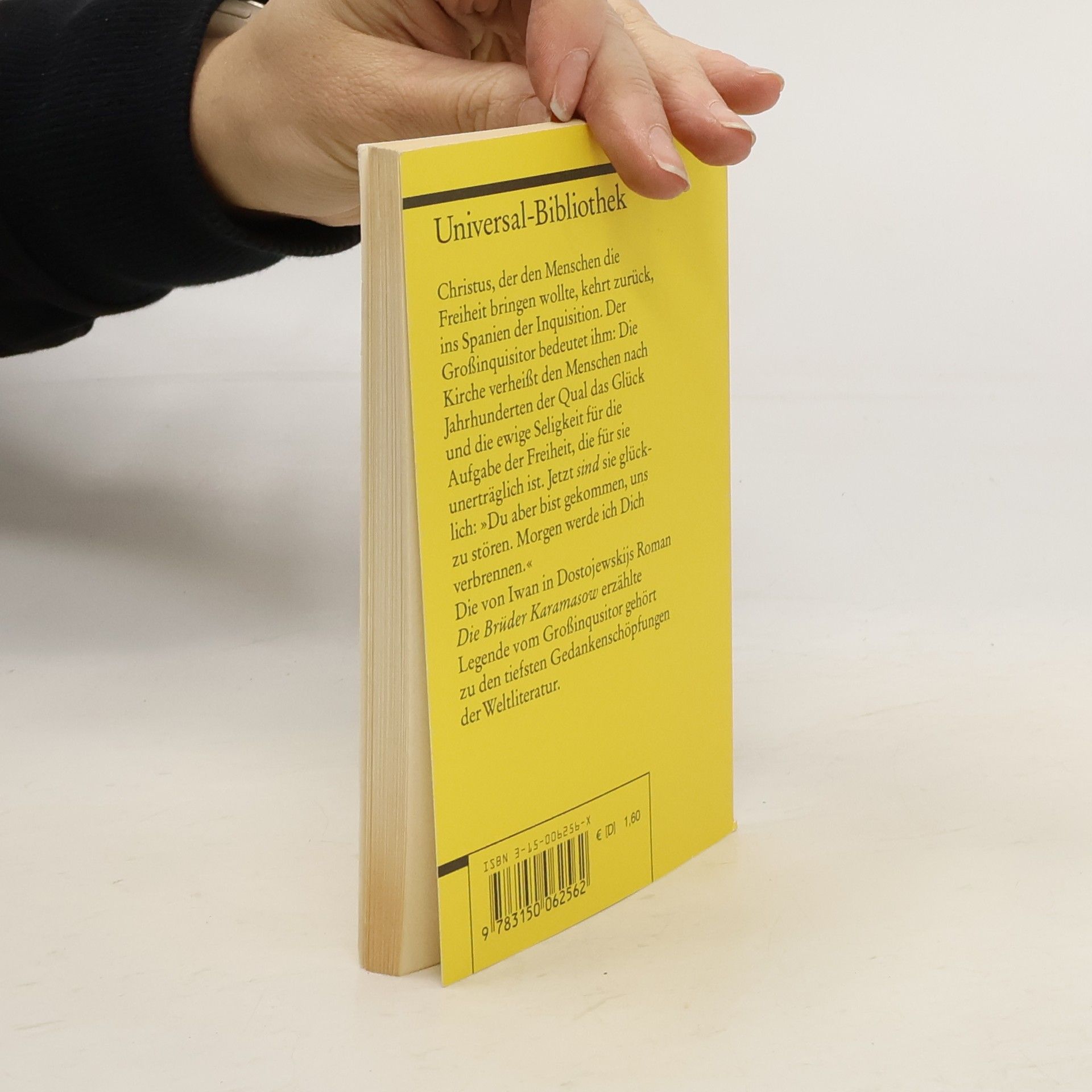 Christus, der den Menschen die Freiheit bringen wollte, kehrt zurück, ins Spanien der Inquisition. Der Großinquisitor bedeutet ihm: Die Kirche verheißt den Menschen nach Jahrhunderten der Qual das Glück und die ewige Seligkeit für die Aufgabe der Freiheit, die für sie unerträglich ist. Jetzt sind sie glücklich: »Du aber bist gekommen, uns zu stören. Morgen werde ich Dich verbrennen.« Die von Iwan in Dostojewskijs Roman Die Brüder Karamasow erzählte Legende vom Großinquisitor gehört zu den tiefsten Gedankenschöpfungen der Weltliteratur.
