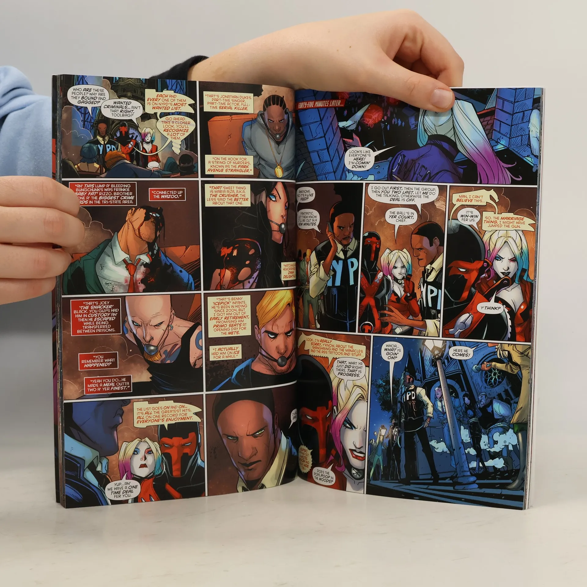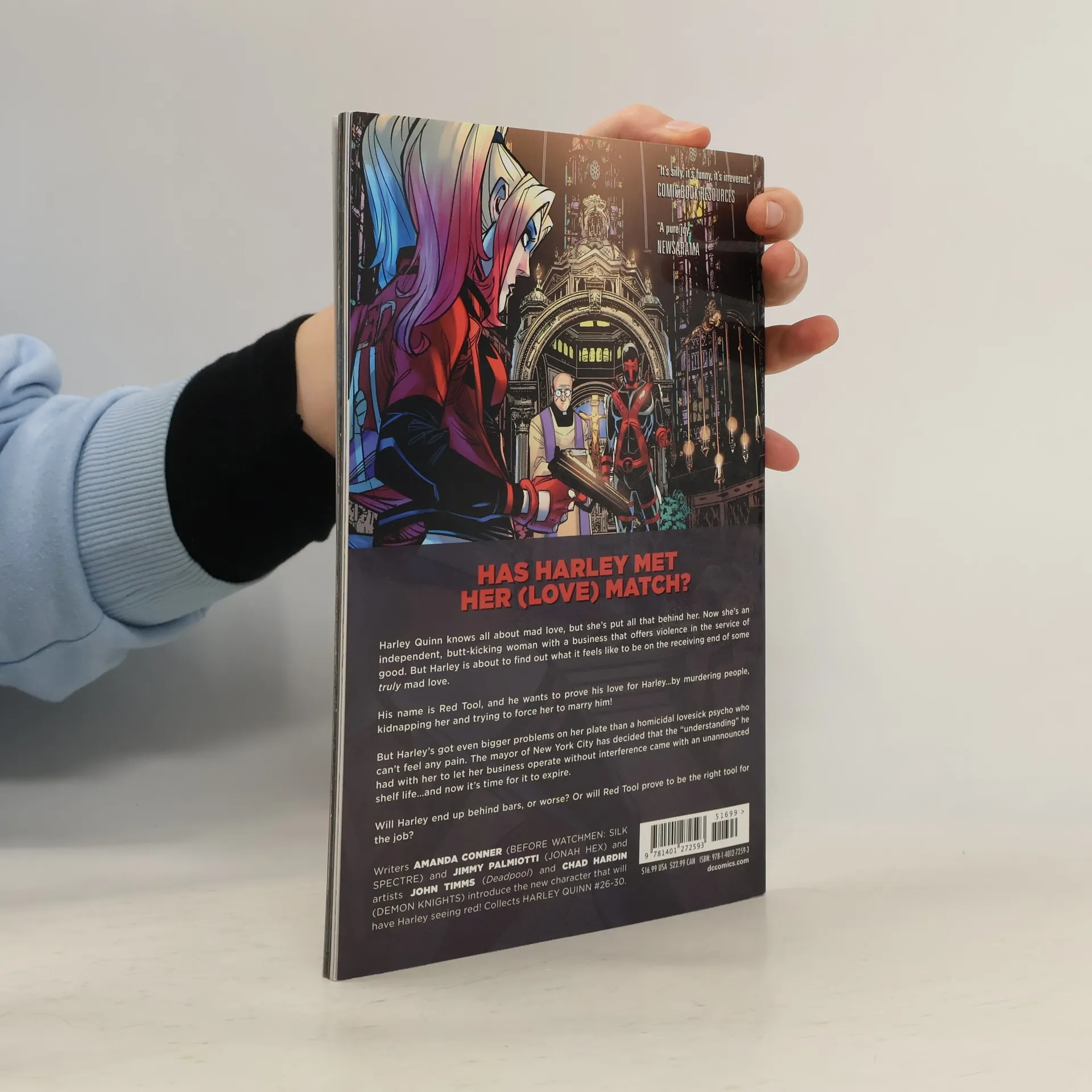 Harley Quinn knows all about mad love, but she’s put all that behind her. Now she’s an independent, butt-kicking woman with a business that offers violence in the service of good. But Harley is about to find out what it feels like to be on the receiving end of some truly mad love. His name is Red Tool, and he wants to prove his love for Harley…by murdering people, kidnapping her and trying to force her to marry him! But Harley’s got even bigger problems on her plate than a homicidal lovesick psycho who can’t feel any pain. The mayor of New York City has decided that the “understanding” he had with her to let her business operate without interference came with an unannounced shelf life…and now it’s time for it to expire. Will Harley end up behind bars, or worse? Or will Red Tool prove to be the right tool for the job? Writers Amanda Conner (BEFORE WATCHMEN: SILK SPECTRE) and Jimmy Palmiotti (JONAH HEX) and artists John Timms (Deadpool) and Chad Hardin (DEMON KNIGHTS) introduce the new character that will have Harley seeing red! Collects HARLEY QUINN #26-30.