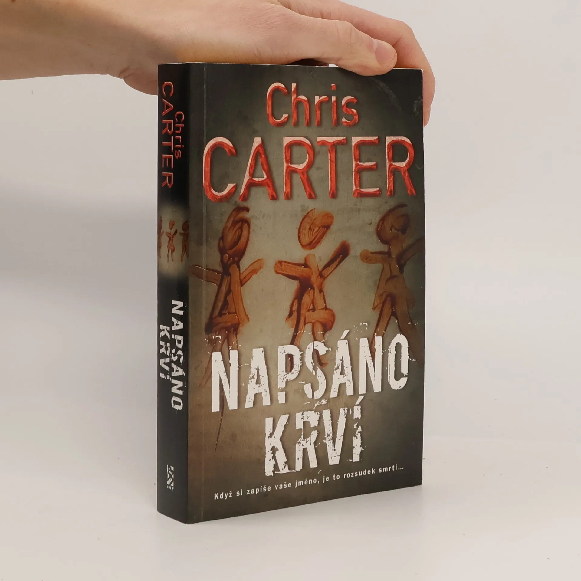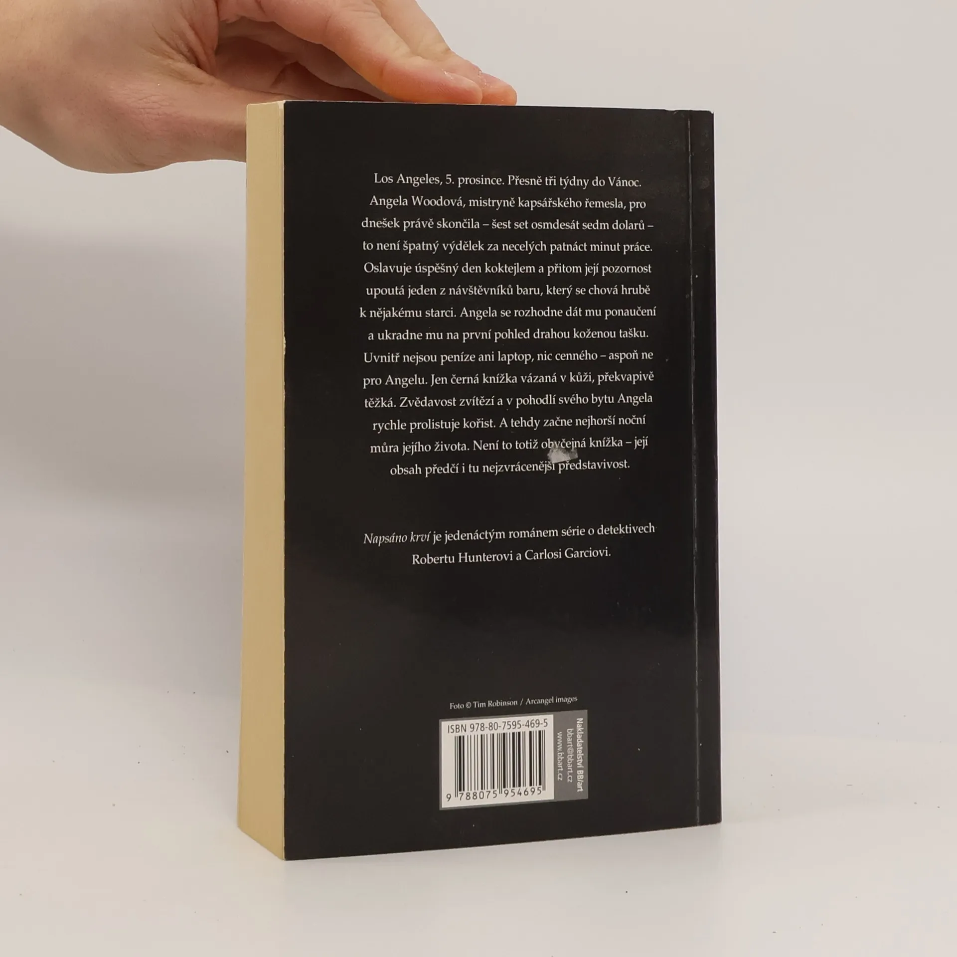 Když si napíše vaše jméno, je to rozsudek smrti… Los Angeles, 5. prosince. Přesně tři týdny do Vánoc. Angela Woodová, mistryně kapsářského řemesla, pro dnešek právě skončila – šest set osmdesát sedm dolarů – to není špatný výdělek za necelých patnáct minut práce. Oslavuje úspěšný den koktejlem a přitom její pozornost upoutá jeden z návštěvníků baru, který se chová hrubě k nějakému starci. Angela se rozhodne dát mu ponaučení a ukradne mu na první pohled drahou koženou tašku. Uvnitř nejsou peníze ani laptop, nic cenného – aspoň ne pro Angelu. Jen černá knížka vázaná v kůži, překvapivě těžká. Zvědavost zvítězí a v pohodlí svého bytu Angela rychle prolistuje kořist. A tehdy začne nejhorší noční můra jejího života. Není to totiž obyčejná knížka – její obsah předčí i tu nejzvrácenější představivost. Napsáno krví je jedenáctým románem série o detektivech Robertovi Hunterovi a Carlosi Garciovi.