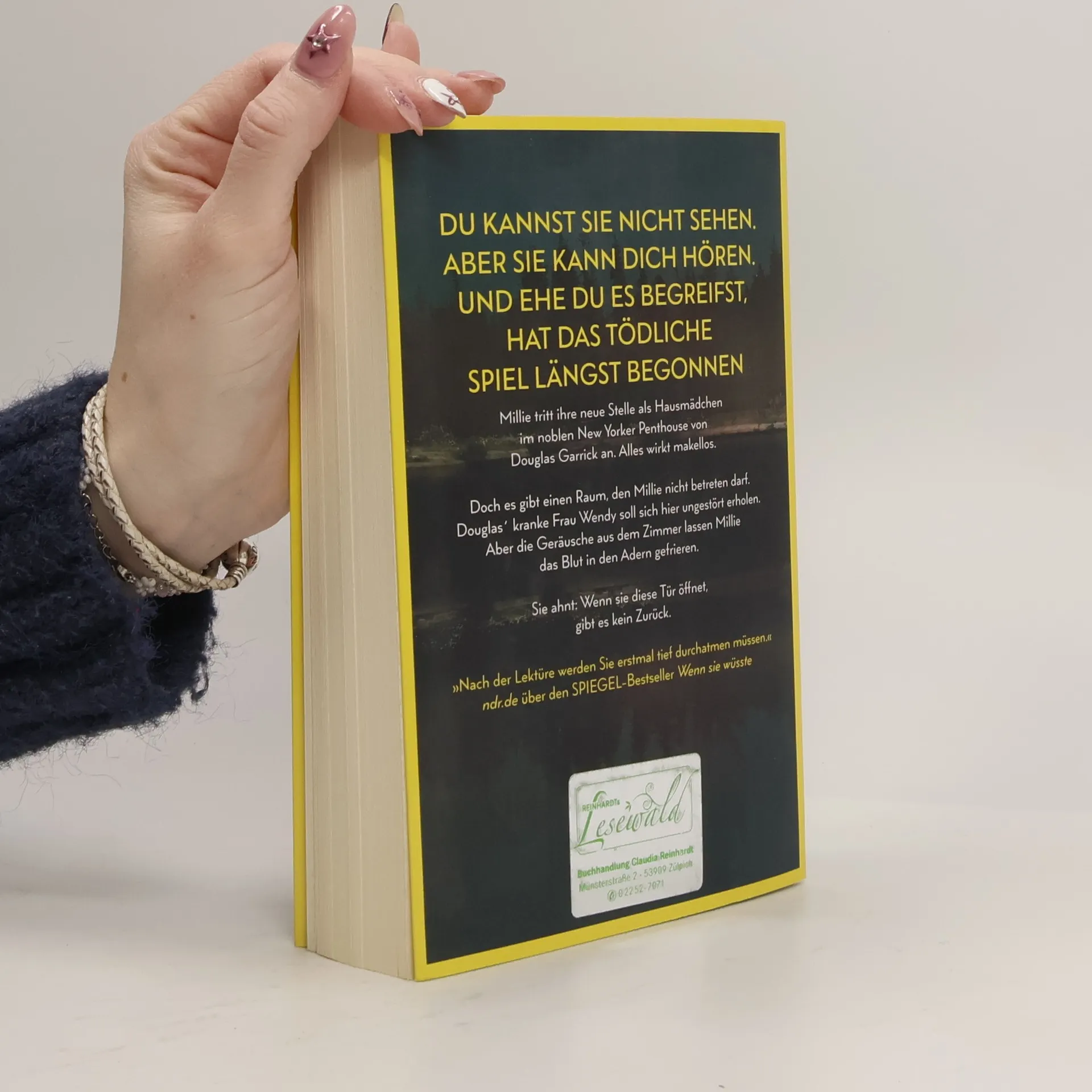 Du kannst sie nicht sehen. Aber sie kann dich hören. Und ehe du es begreifst, hat das tödliche Spiel längst begonnen Millie Calloway hat einen neuen Job. Um sich ihr Studium zu finanzieren, hilft sie einem reichen Paar aus Manhattan im Haushalt. Ihr Arbeitgeber Douglas Garrick wirkt nett, und zum Glück stellt er ihr nicht zu viele Fragen zu ihrer Vergangenheit. Doch warum darf Millie nicht mit seiner Frau Wendy sprechen? Was bedeuten das Weinen, das sie aus dem verschlossenen Zimmer hört, und die Blutflecke auf Wendys Kleidung? Ist Douglas in Wahrheit nicht der fürsorgliche Ehemann, der er vorgibt zu sein? Millie weiß nur eins: Sie muss Wendy helfen. Auch wenn sie damit riskiert, dass ihr dunkelstes Geheimnis doch noch ans Licht kommt.