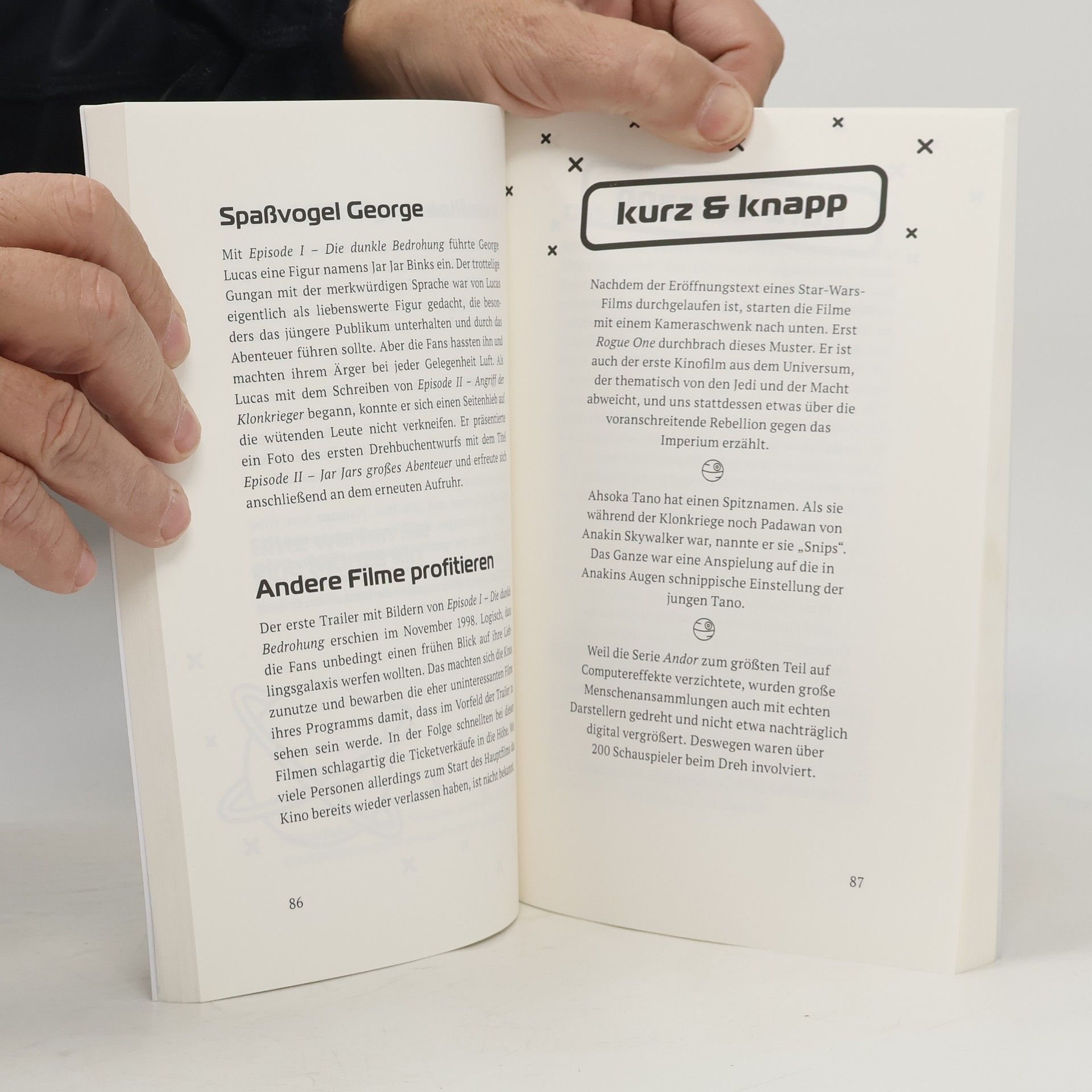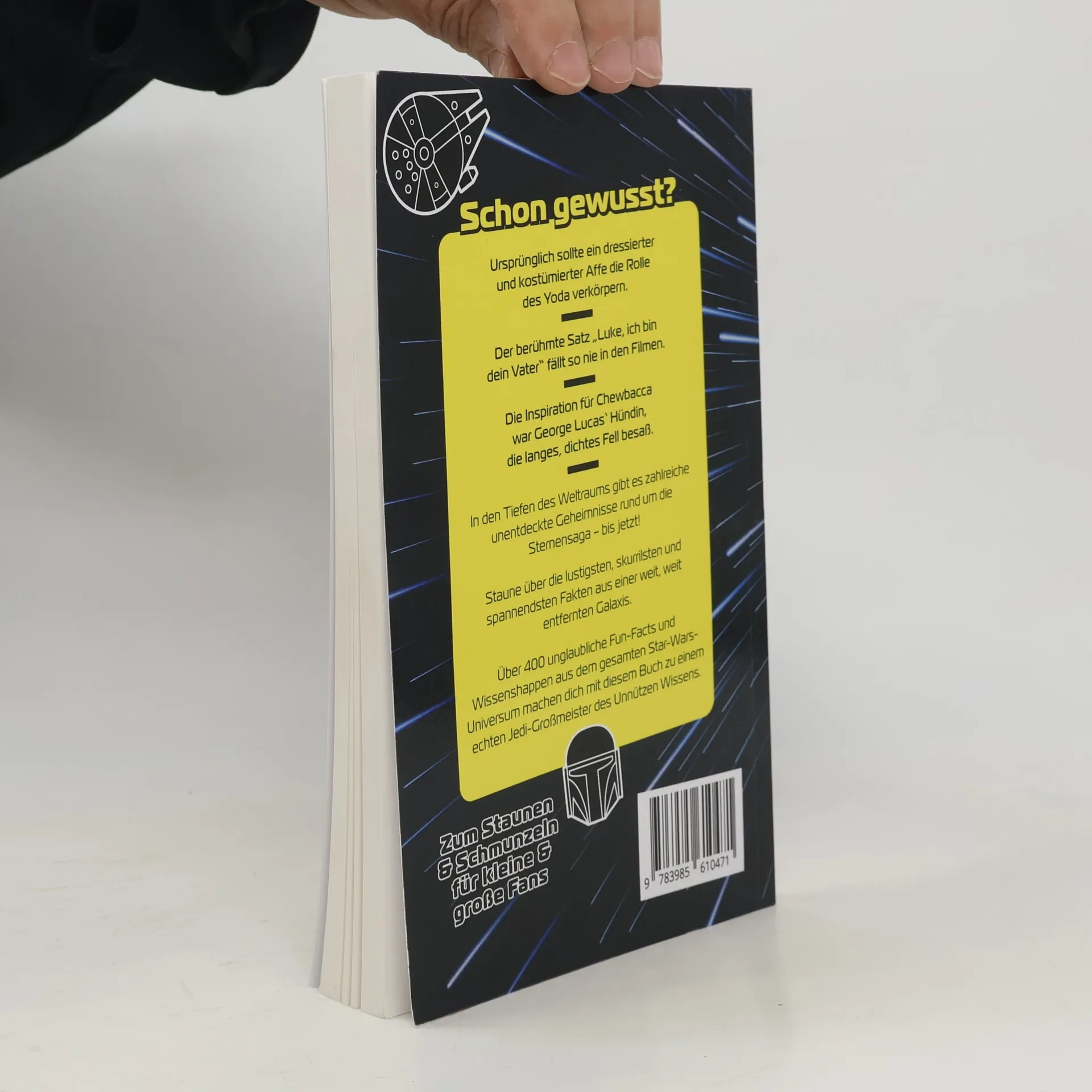 Dieses Buch bringt Star-Wars-Fans zum Staunen In den Tiefen des Weltraums gibt es zahlreiche unentdeckte Geheimnisse rund um die Sternensaga – bis jetzt! Staune über die lustigsten, skurrilsten und spannendsten Fakten aus einer weit, weit entfernten Galaxis. Schon gewusst? Die Inspiration für Chewbacca war George Lucas‘ Hündin, die langes, dichtes Fell besaß. Der berühmte Satz „Luke, ich bin dein Vater“ fällt so nie in den Filmen. Ursprünglich sollte ein dressierter und kostümierter Affe die Rolle des Yoda verkörpern. Enthülle die Geheimnisse Über 400 unglaubliche Fakten aus dem gesamten Star-Wars-Universum machen dich zu einem echten Jedi-Großmeister des Unnützen Wissens. Du wirst erstaunt sein, welche Geheimnisse und verdeckten Zusammenhänge in dieser epischen Saga verborgen sind. Erlebe das Star-Wars-Universum neu Ob Filme, Serien, Games oder Fan-Artikel: Erfahre all die skurrilen Dinge des Star-Wars-Universums, die selbst Yoda noch nicht kannte. Von den ikonischen Jedi-Rittern bis zu den berüchtigten Sith-Lords – jede Seite enthüllt unglaubliche Details. Ein Must-Have für Fans Ob du es als Nachschlagewerk nutzt, um dein Star-Wars-Wissen aufzufrischen, es einfach nur zum Vergnügen liest, oder einem wahren Fan mit einem Geschenk eine Freude bereiten willst – dieses Buch ist ein Muss für Fans. Highlights: Über 400 Fakten rund um das Star-Wars-Universum Das ultimative Buch & Geschenk für jeden Sternenkrieger Unglaubliche Fakten, lustige Details und erstaunliche Enthüllungen Zum Staunen & Schmunzeln für kleine & große Fans Entdecke faszinierende Fun-Facts rund um die Sternensaga, die dich zum Lachen und Staunen bringen, während du dich durch die Seiten blätterst. Jetzt bestellen und verblüffen lassen!