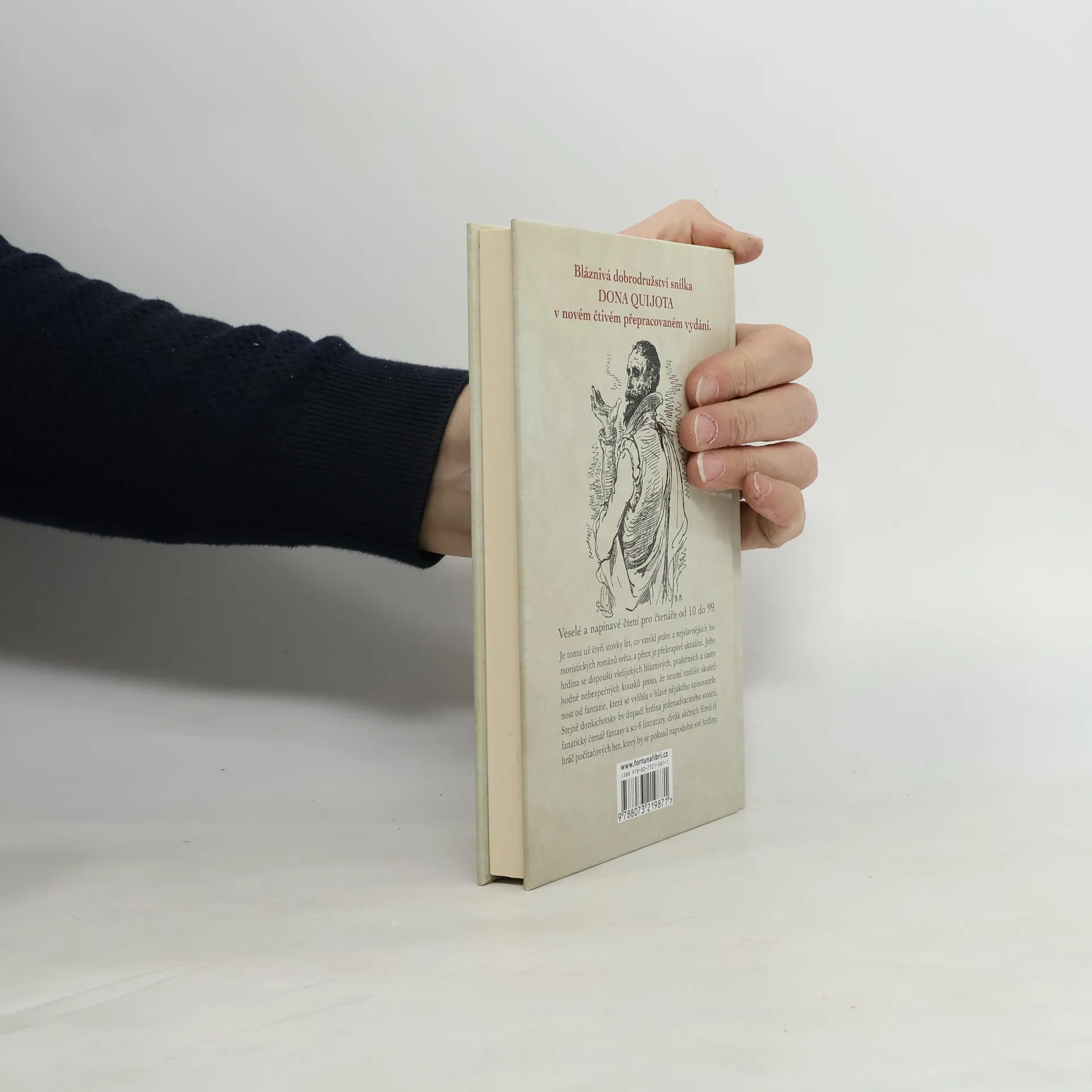 Bláznivá dobrodružství snílka Dona Quijota v novém čtivém přepracovaném vydání. Je tomu už čtyři stovky let, co vznikl jeden z nejslavnějších humoristických románů světa, a přece je překvapivě aktuální. Jeho hrdina se dopouští všelijakých bláznivých, praštěných a často hodně nebezpečných kousků proto, že neumí rozlišit skutečnost od fantazie, která se vylíhla v hlavě nějakého spisovatele. Stejně donkichotsky by dopadl hrdina jedenadvacátého století, fanatický čtenář fantasy a sci-fi literatury, divák akčních filmů či hráč počítačových her, který by se pokusil napodobit své hrdiny.
