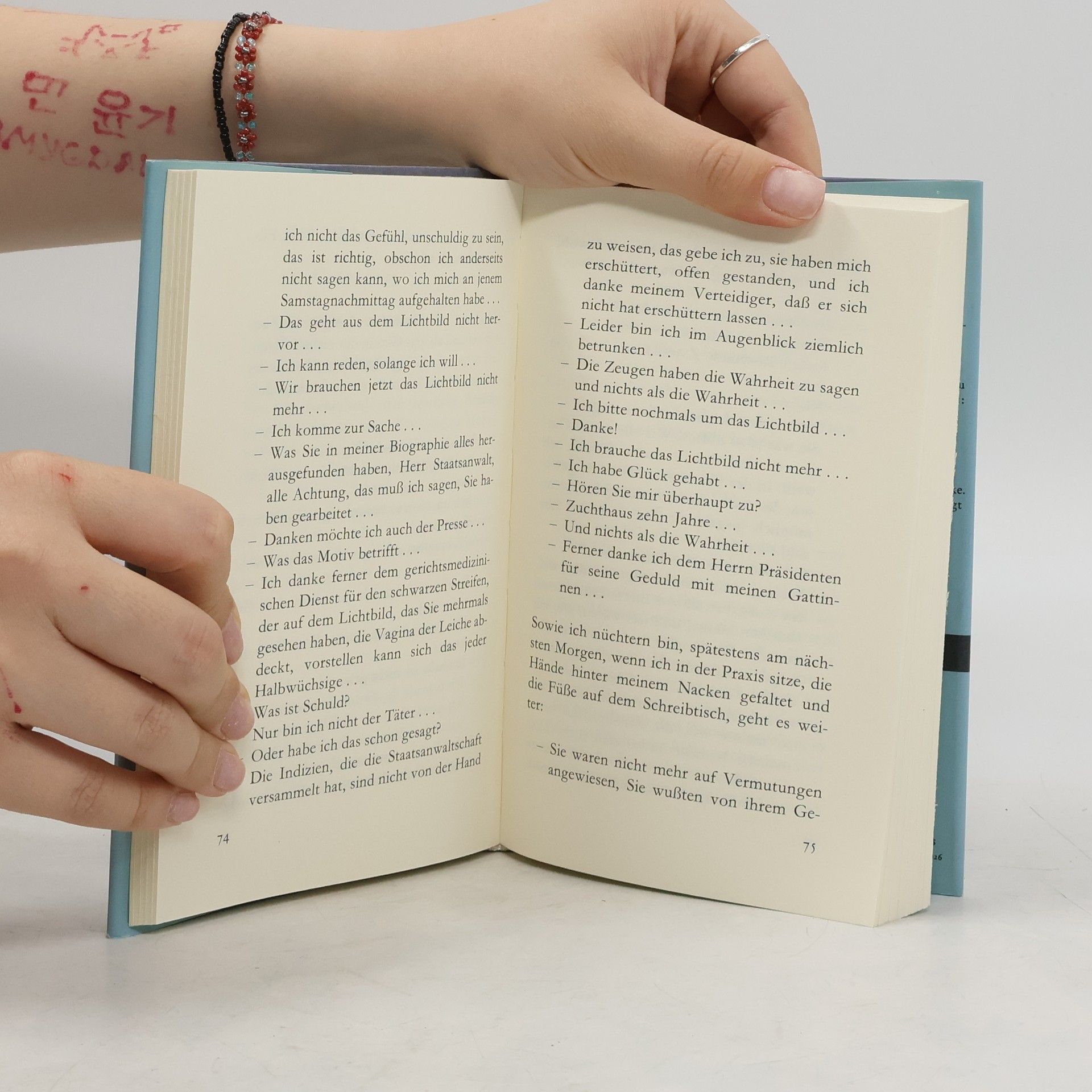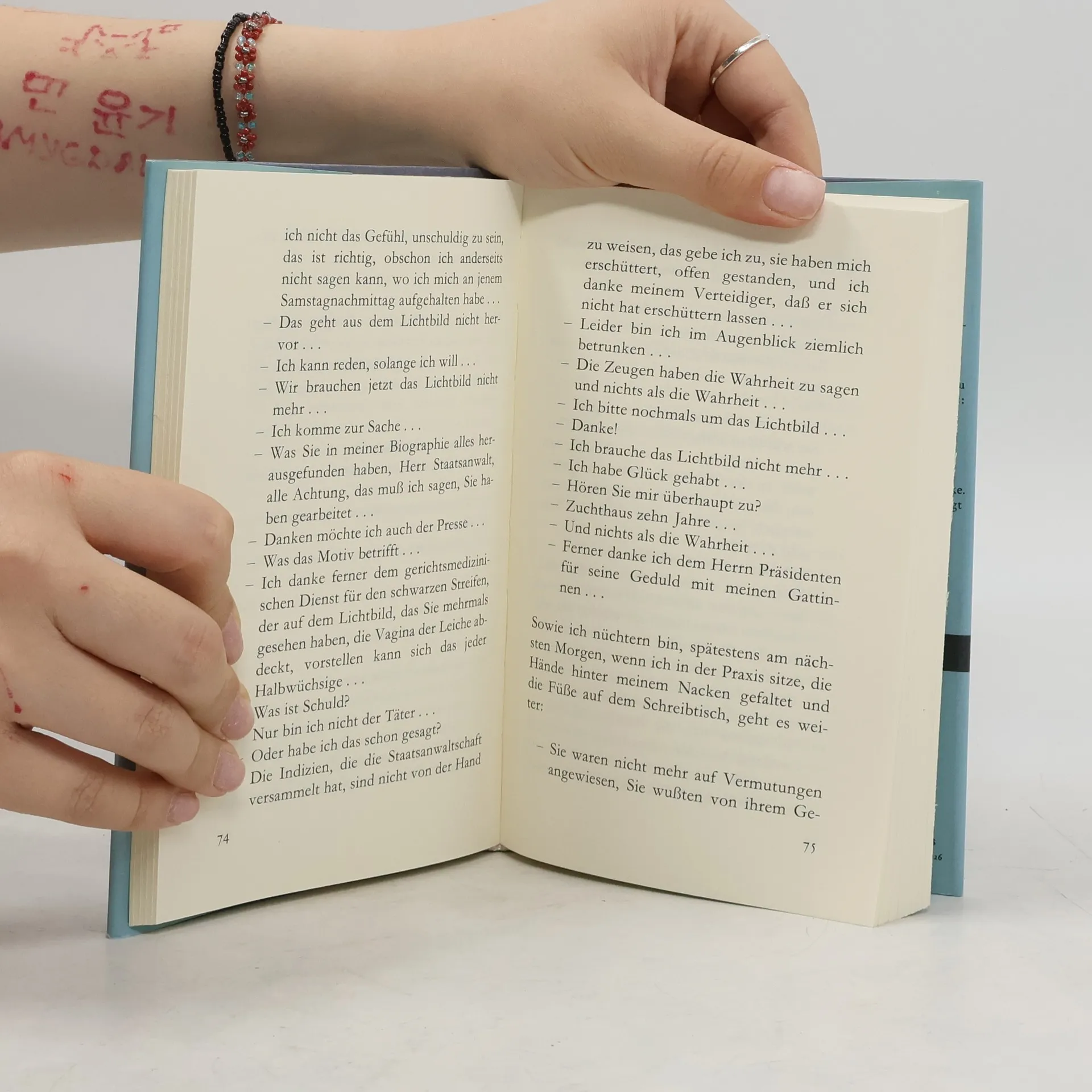 »Freispruch mangels Beweis. Wie lebt einer damit? Ich bin vierundfünfzig«, heißt es zu Beginn der Erzählung. Dr. med. Felix Schaad stand in Verdacht, mit seiner Krawatte seine ehemalige Frau Rosalinde Zogg erdrosselt zu haben. Für den Staatsanwalt steht das Motiv fest: Eifersucht. Der Staatsanwalt will Schaad für zehn Jahre ins Zuchthaus schicken, doch das Gericht erkennt auf Freispruch. »Was meinen Blaubart betrifft: Schaad weiß nicht, was er unter Schuld versteht, und er ist nicht der einzige, der das heute nicht weiß, glaube ich. Schaad hat ein latentes Schuldgefühl. Vor Gericht wird ihm ein Delikt unterstellt, das er nicht begangen hat. Er weiß, daß er nicht der Täter gewesen ist, aber er kann nicht sagen: Ich bin unschuldig. ... Für mich geht es in diesem etwas schauerlichen Buch zentral um die Frage von Schuld - Unschuld in einem Fall, wo die Schuld nicht belegbar ist durch die Tat. ... Ich habe den Kriminalfall so durchschnittlich wie möglich gewählt, damit er nicht das Interesse abzieht, denn nicht dieser Kriminalfall hat mich interessiert, sondern die Technik der Wahrheitsfindung, das Gericht als Beispiel...« (Aus einem Gespräch zwischen Max Frisch und Günter Kunert)