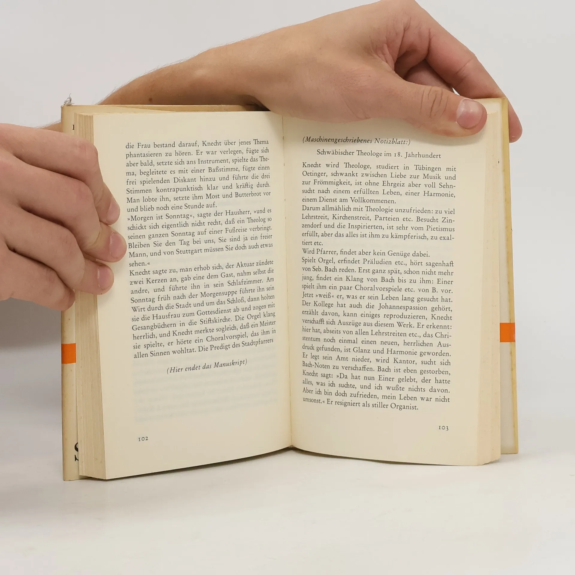 Diese 1934 entstandene Erzählung, die ursprünglich in Hesses Alterswerk »Das Glasperlenspiel« aufgenommen werden sollte, ist Fragment geblieben und wurde erst drei Jahre nach seinem Tod veröffentlicht. Sie spielt im 18. Jahrhundert in der Blütezeit der europäischen Musik und des Pietismus und zeigt den Umweg, den der eigentlich für die Musik begabte Josef Knecht auf sich nehmen muß, um der Erwartung seiner frommen Mutter zu entsprechen, die ihren Sohn am liebsten als geistlichen Würdenträger gesehen hätte.