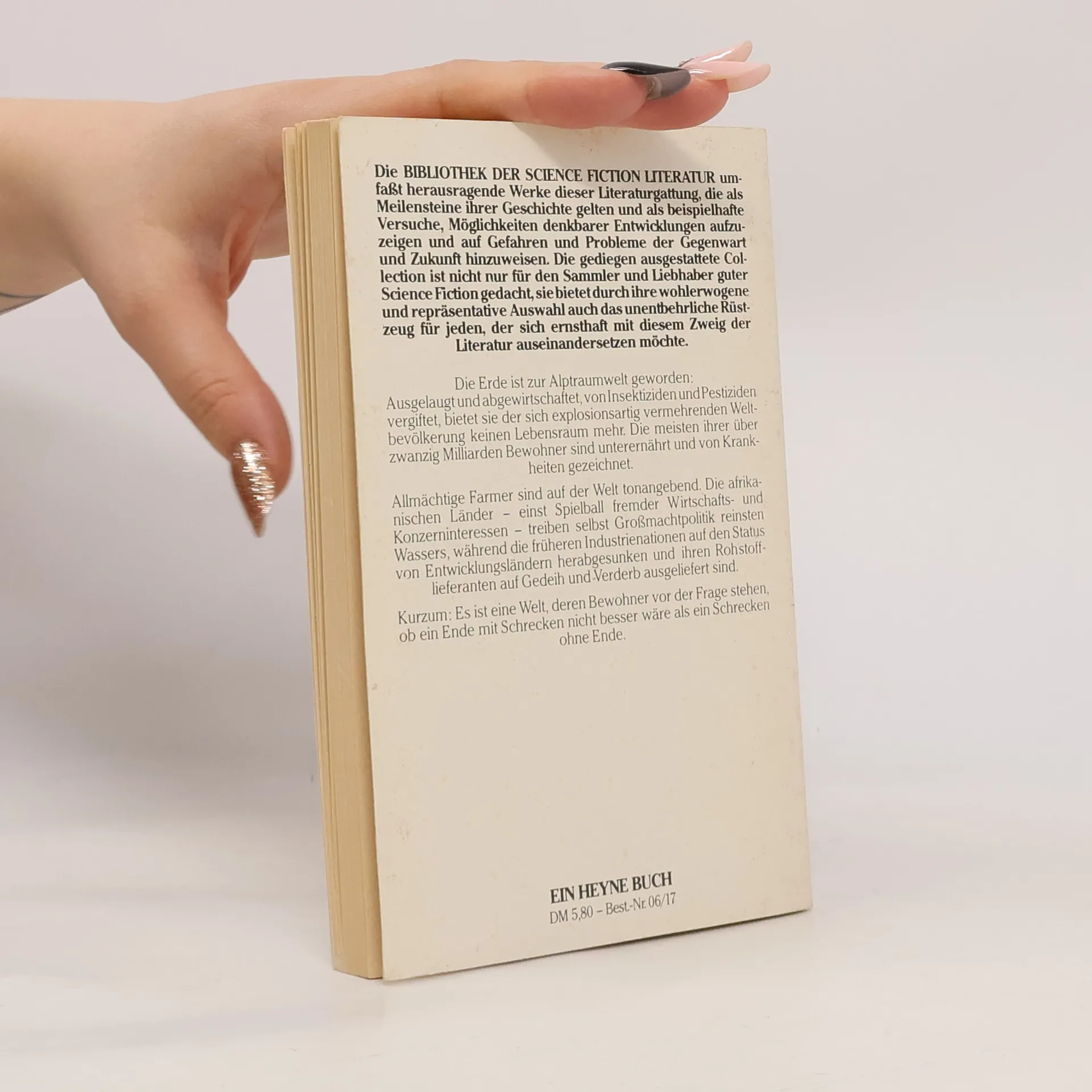 Die Erde ist zur Alptraumwelt geworden: Ausgelaugt und abgewirtschaftet, von Insektiziden und Pestiziden vergiftet, bietet sie der sich explosionsartig vermehrenden Weltbevölkerung keinen Lebensraum mehr. Die meisten ihrer über zwanzig Milliarden Bewohner sind unterernährt und von Krankheiten gezeichnet. Allmächtige Farmer sind auf der Welt tonangebend. Die afrikanischen Länder – einst Spielball fremder Wirtschafts- und Konzerninteressen – treiben selbst Großmachtpolitik, während die früheren Industrienationen auf den Status von Entwicklungsländern herabgesunken und ihren Rohstofflieferanten auf Gedeih und Verderb ausgeliefert sind. Kurzum: Es ist eine Welt, deren Bewohner vor der Frage stehen, ob ein Ende mit Schrecken nicht besser wäre als ein Schrecken ohne Ende