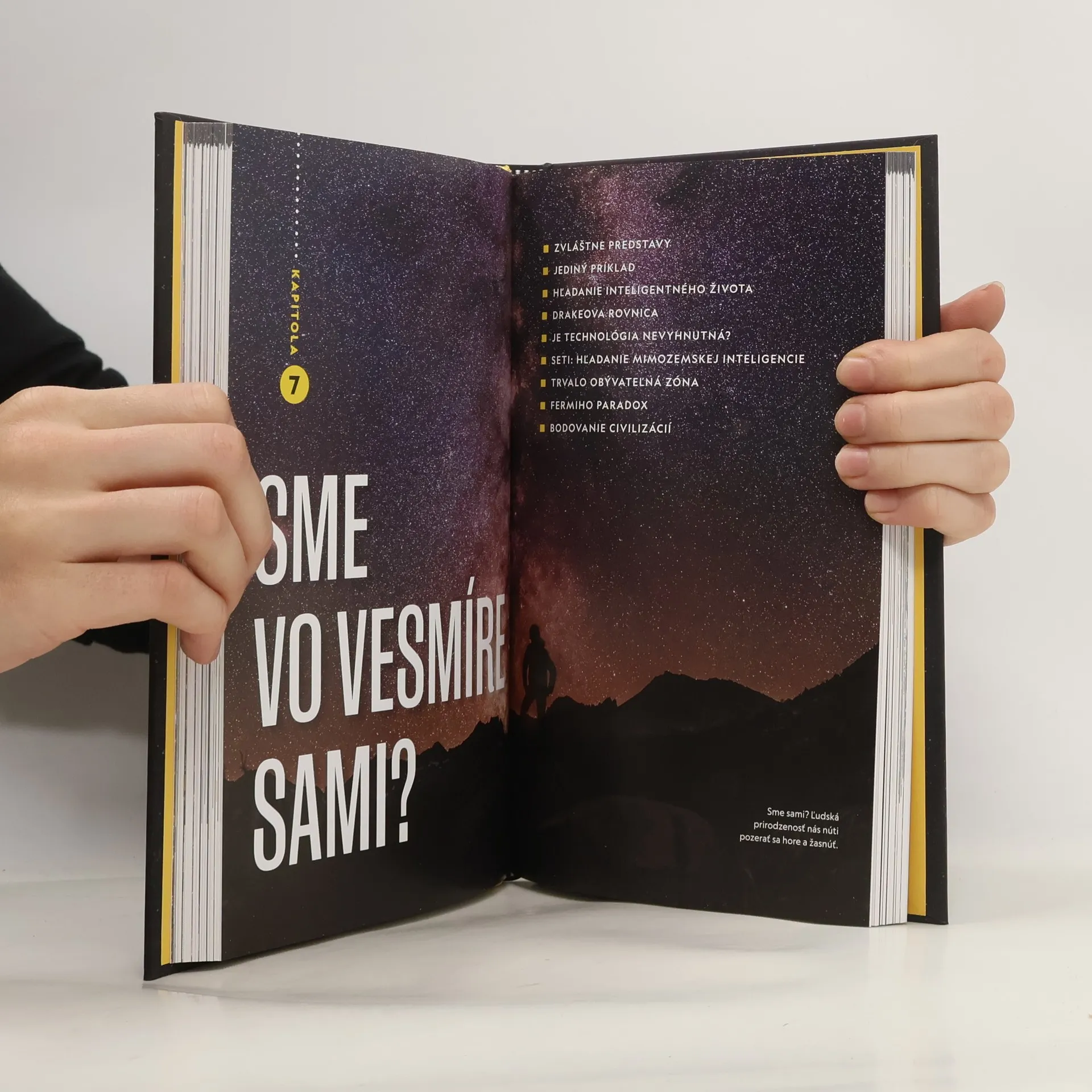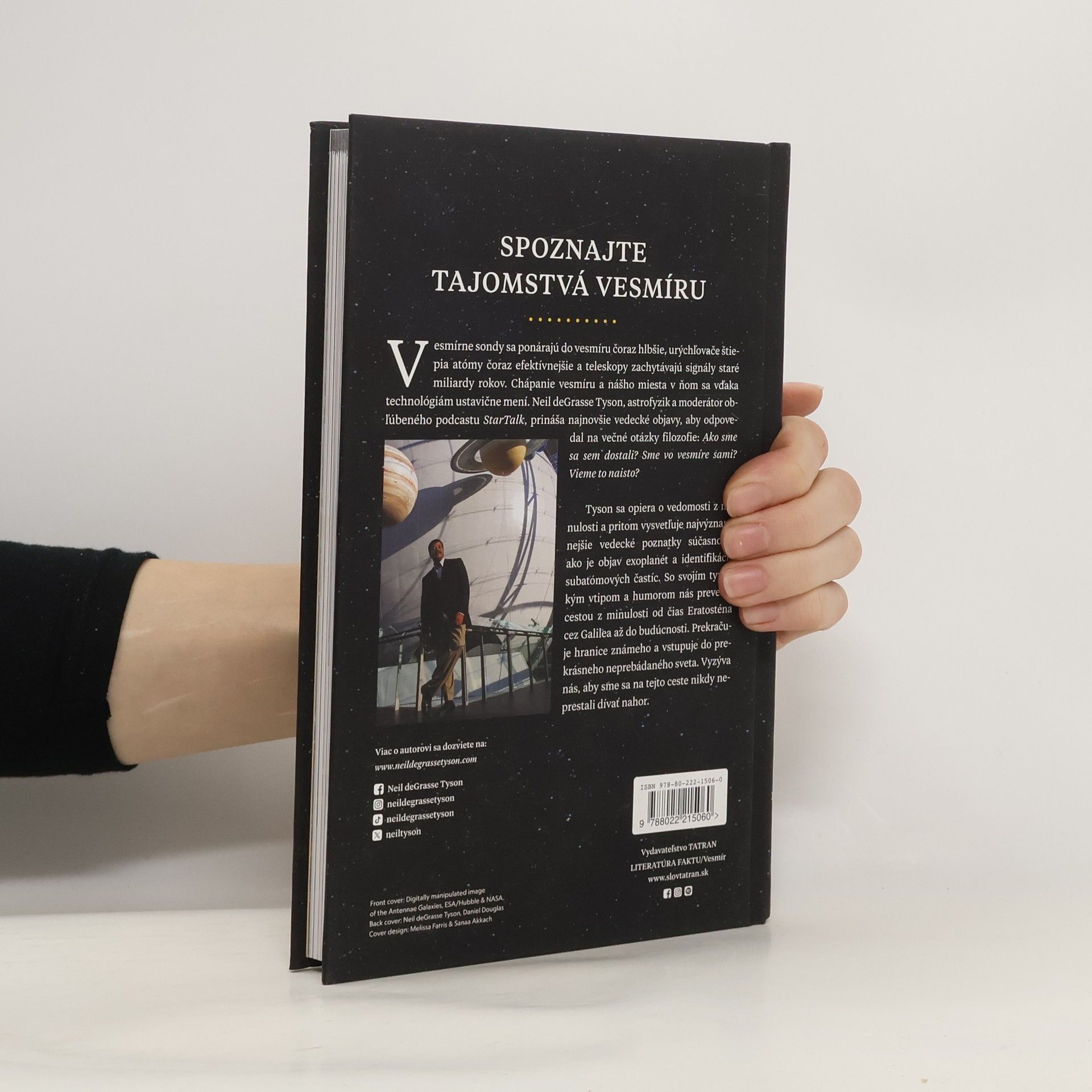 Táto kniha dôležitých otázok o vesmíre je určená všetkým obdivovateľom kozmu a vedy, ale aj tým, ktorí chcú pochopiť, kde je ich miesto v našej galaxii. Nová poučná kniha Neila deGrasse Tysona ponúka jedinečný pohľad na záhady a kuriozity vesmíru, pričom využíva bohatý materiál z diskusnej relácie StarTalk, ktorej verzia o kozmických záhadách patrí medzi najobľúbenejšie. Autor sa spolu s uznávaným fyzikom a popularizátorom vedy Jamesom Trefilom na týchto stránkach s pestrým fotografickým materiálom zaoberá veľkými otázkami, ktoré si ľudstvo kladie už po tisícročia: Ako sa začal život? Aké je naše miesto vo vesmíre? Sme v ňom sami? A odpovedá na ne, opierajúc sa o najaktuálnejšie údaje, pozorovania a teórie.