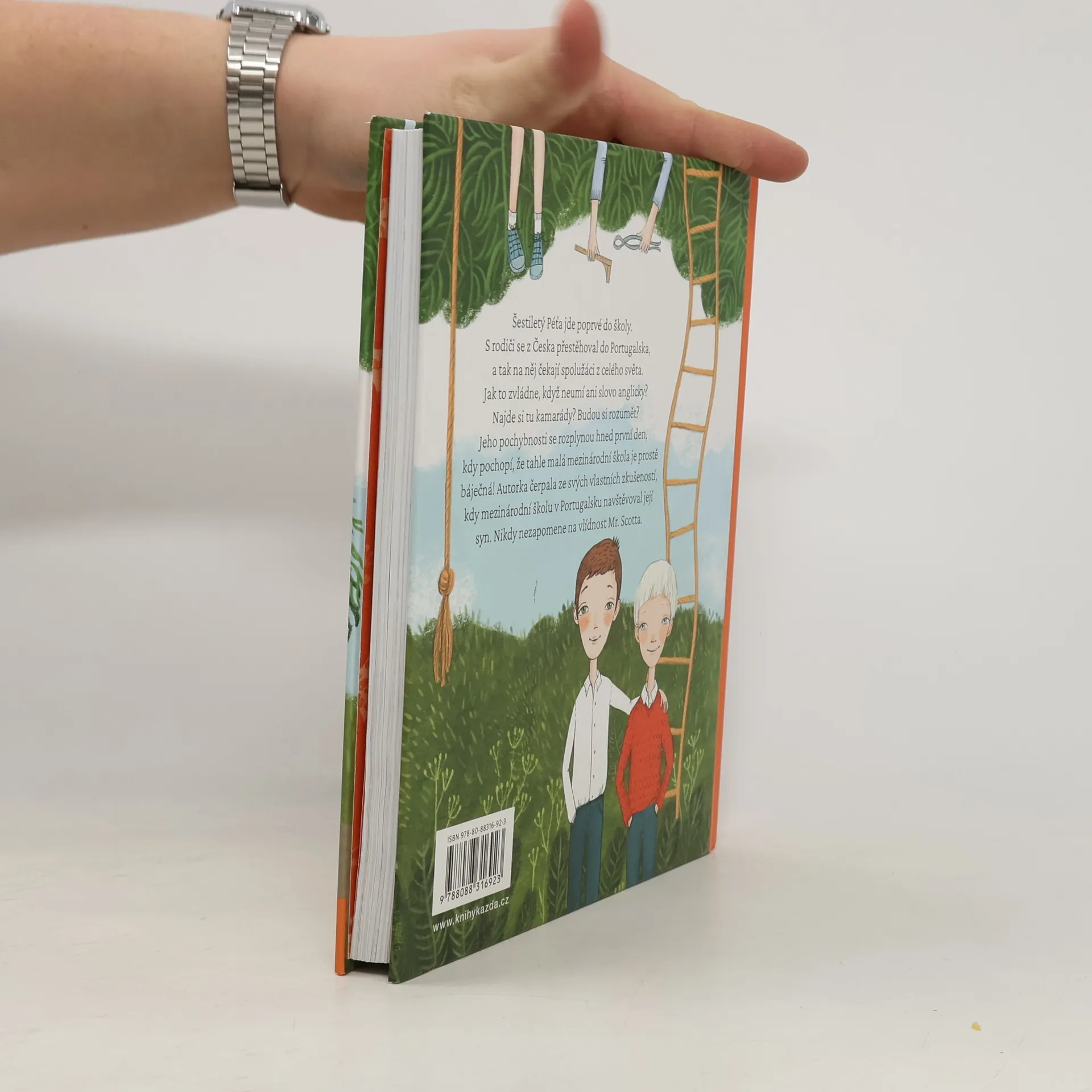 Šestiletý Péťa jde poprvé do školy. S rodiči se z Česka přestěhoval do Portugalska, a tak na něj čekají spolužáci z celého světa. Jak to zvládne, když neumí ani slovo anglicky? Najde si tu kamarády? Budou si rozumět? Jeho pochybnosti se rozplynou hned první den, kdy pochopí, že tahle malá mezinárodní škola je prostě báječná! Autorka čerpala ze svých vlastních zkušeností, kdy mezinárodní školu v Portugalsku navštěvoval její syn. Nikdy nezapomene na vlídnost Mr. Scotta.