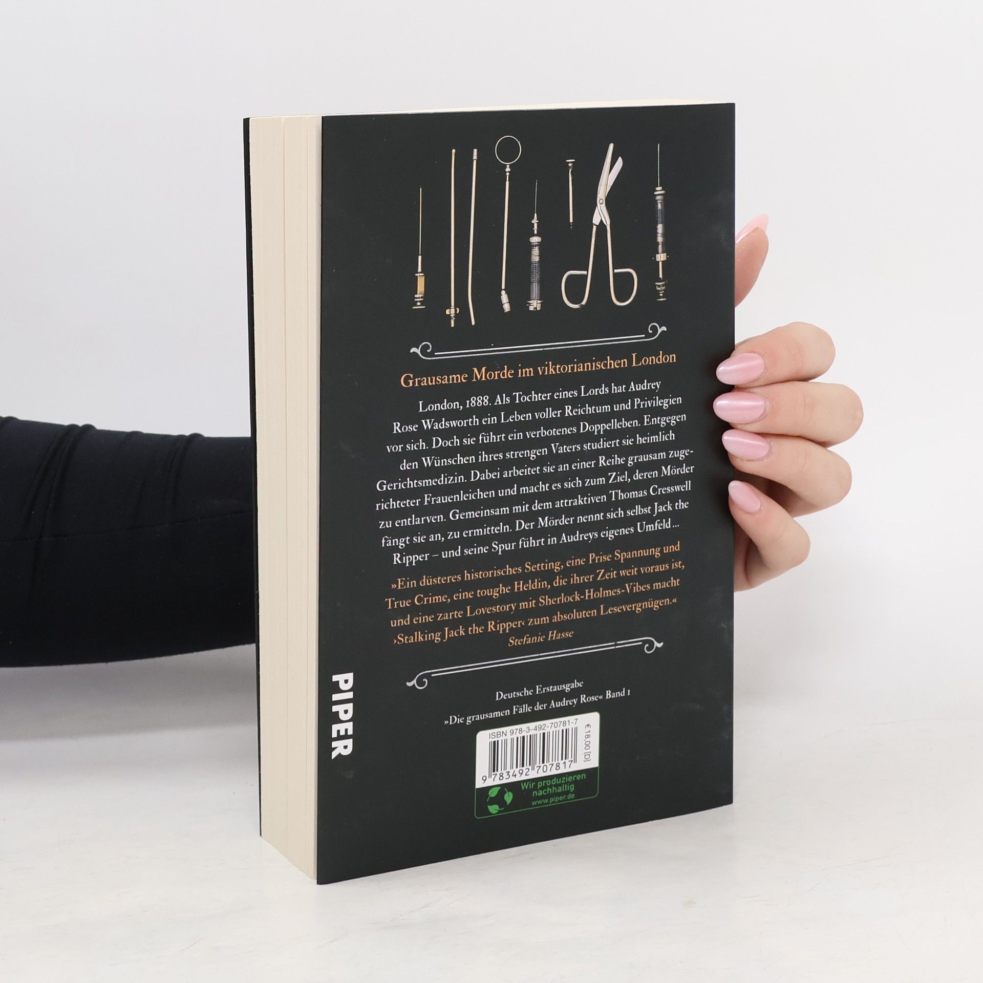 Die beliebte Debütreihe von Kerri Maniscalco endlich auf Deutsch – mit Farbschnitt in der 1. Auflage! London, im Jahr 1888. Audrey Rose Wadsworth ist die Tochter eines Lords und hat ein Leben voller Reichtum und Privilegien vor sich. Doch zwischen Teeverabredungen und Kleideranproben führt sie ein verbotenes Doppelleben. Entgegen den Wünschen ihres strengen Vaters und den Erwartungen der Gesellschaft schleicht sich Audrey oft in das Labor und den Hörsaal ihres Onkels, um Gerichtsmedizin zu studieren. Dabei arbeitet sie an einer Reihe grausam zugerichteter Leichen und stößt auf Ungereimtheiten. Gemeinsam mit dem attraktiven Thomas Cresswell fängt sie an zu ermitteln – schnell wird klar, dass sie sich auf der Spur des berüchtigten Serienmörders Jack the Ripper befinden. Die Suche nach Antworten führt Audrey zurück in ihr eigenes Umfeld … und zu einem furchtbaren Geheimnis. Das atemberaubend spannende Debüt der Spiegel-Bestsellerautorin Kerri Maniscalco – inspiriert von den Whitechapel-Morden rund um Jack the Ripper! Weitere Bände der Reihe: Stalking Jack the Ripper. Die Spur in den Schatten (Band 1) Hunting Prince Dracula. Die gefährliche Jagd (Band 2) Weitere Bände in Vorbereitung.