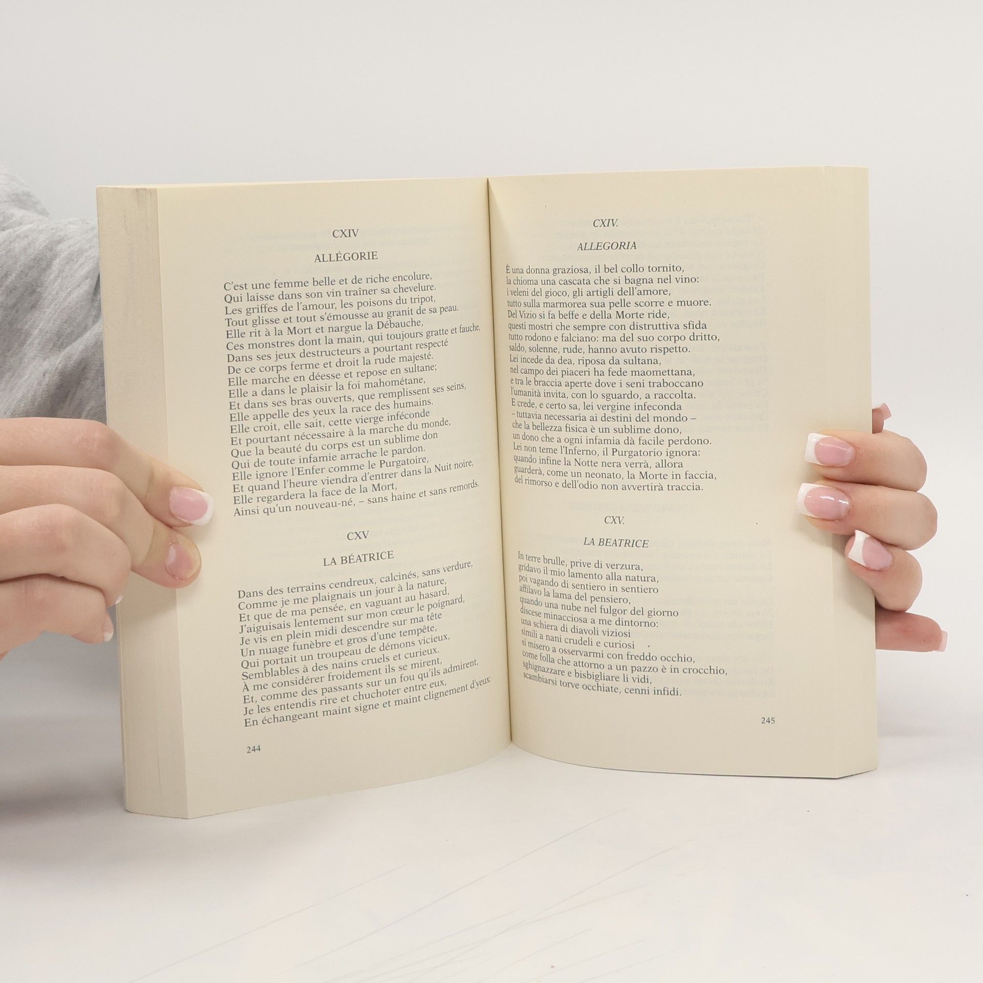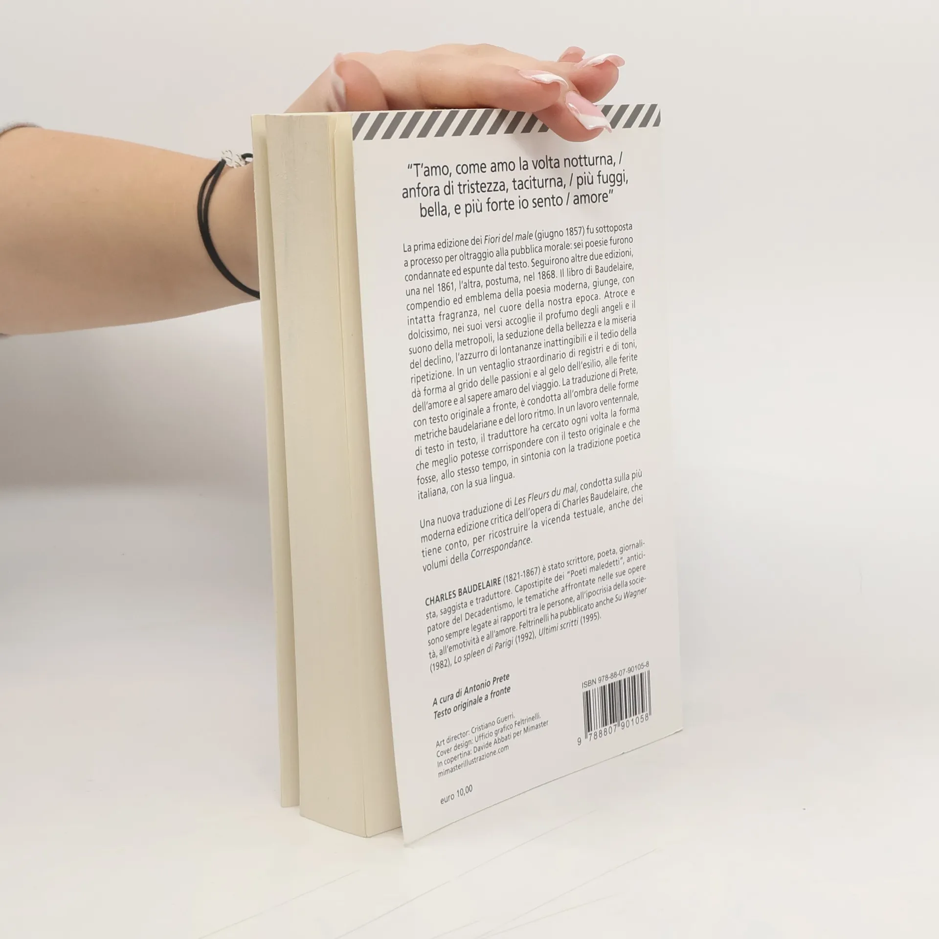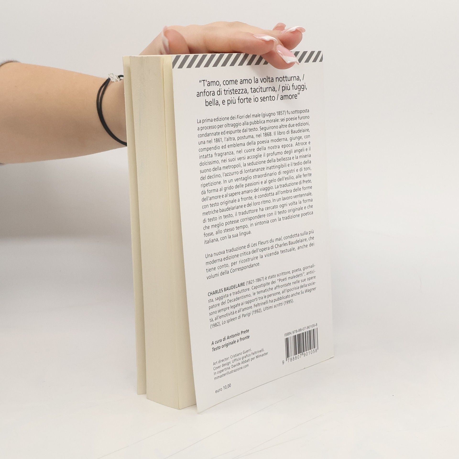 Testo originale a fronte. La prima edizione dei Fiori del male risale al giugno del 1857 e comprende cento testi poetici. È messa in vendita in circa 1100 esemplari, dagli editori Poulet-Malassis et De Broise. Attaccata da "Le Figaro", l'opera sarà sottoposta a sequestro e l'autore e gli editori, nell'agosto 1857, saranno condannati per oltraggio alla pubblica morale e al buon costume. Il volume verrà rimesso in circolazione privato delle sei pièces condamnées ed esaurirà la tiratura in un anno. Seguiranno altre due edizioni (l'ultima postuma) accresciute. La presente edizione segue il testo de Les Fleurs du mal tratto dalle Œuvres Complètes nella Pléiade (Gallimard 1975). Curata da Claude Pichois, l'edizione risulta ormai fondamentale e di riferimento per tutti gli studiosi baudelairiani. La traduzione di Prete è condotta "all'ombra delle forme metriche baudelairiane, anzi, persino, quando è stato possibile, all'ombra del loro ritmo". Prete ha cercato, in un lavoro pressoché ventennale, di testo in testo, un'analogia metrica, cioè la forma metrica italiana che garantisse allo stesso tempo una corrispondenza con il testo originale e una corrispondenza e plausibilità, nella nostra lingua poetica, della sua tradizione. [Dal sito della casa editrice.]