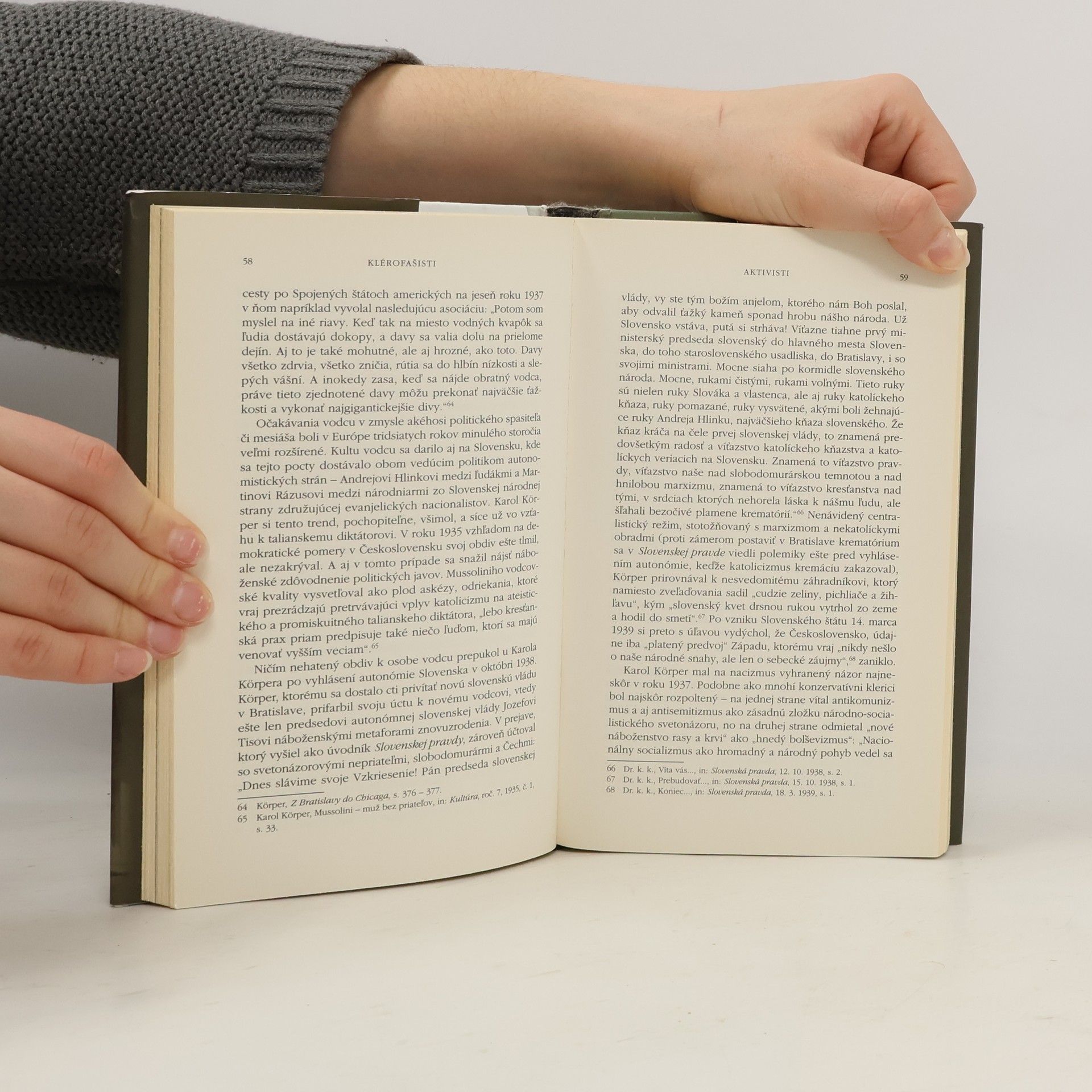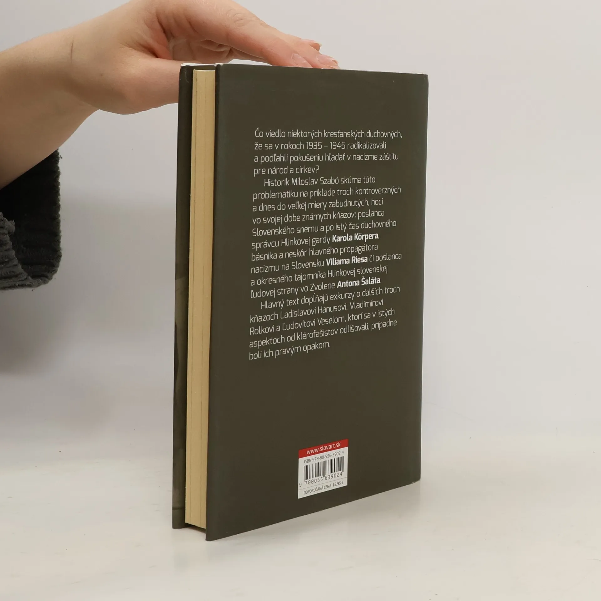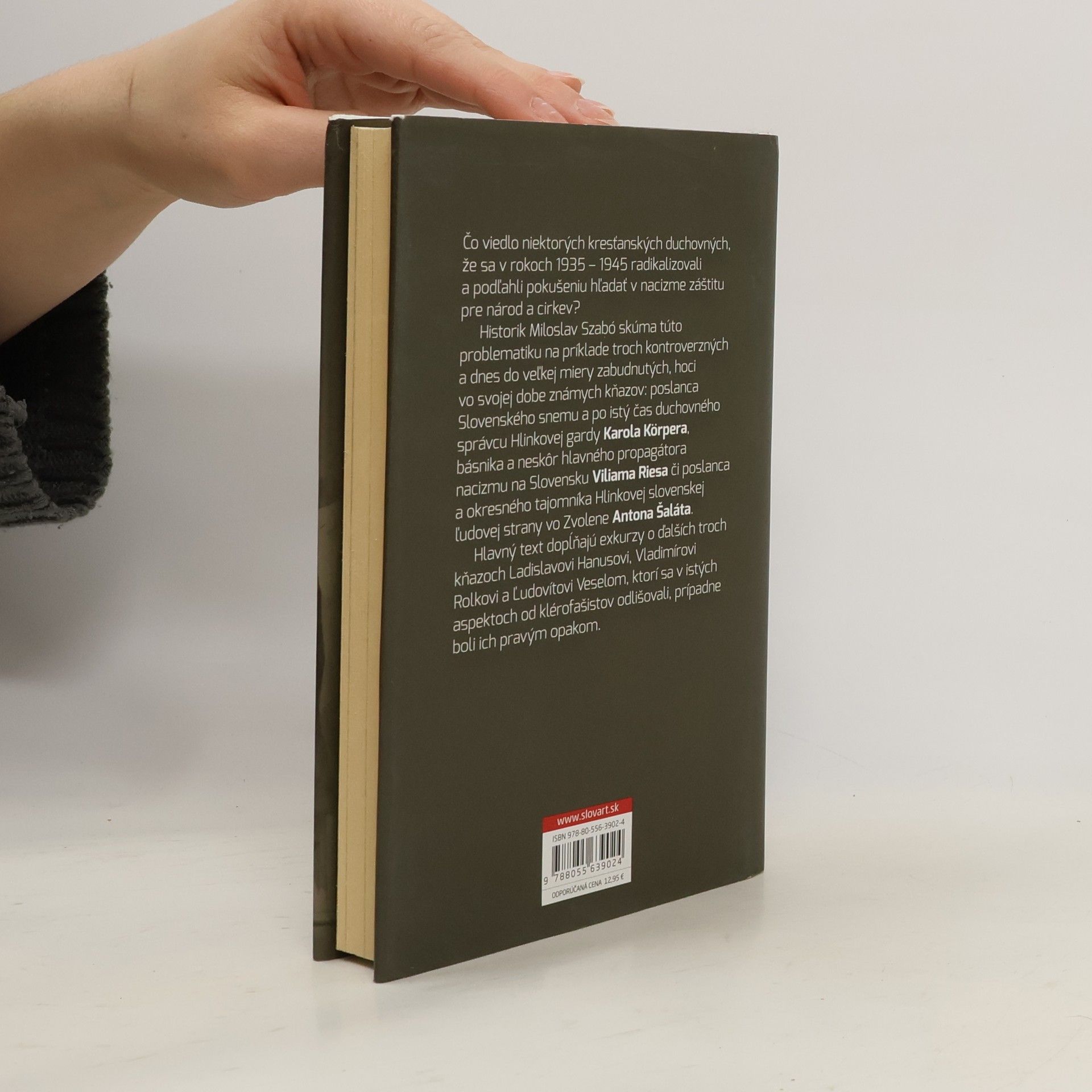 Slovenskí kňazi a pokušenie radikálnej politiky (1935 - 1945) Publikácia sa venuje príčinám, kontextu a dôsledkom radikalizovania viacerých katolíckych a jedného evanjelického kňaza v rokoch 1935 - 1945. Kým vo verejnej diskusii prevláda záujem o známe osobnosti, ako bol prezident Jozef Tiso, historik Miloslav Szabó skúma problematiku na príklade troch kontroverzných a dnes do veľkej miery zabudnutých duchovných: poslancovi Slovenského snemu a po istý čas duchovnému správcovi Hlinkovej gardy Karolovi Körperovi, básnikovi a neskôr hlavnému propagátorovi nacizmu na Slovensku Viliamovi Riesovi a poslancovi a okresnému tajomníkovi HSĽS vo Zvolene Antonovi Šalátovi. Hlavný text dopĺňajú exkurzy o ďalších troch kňazoch (Ladislavovi Hanusovi, Vladimírovi Rolkovi a Ľudovítovi Veselom), ktorí sa v istých aspektoch od klérofašistov odlišovali, prípadne boli ich pravým opakom.